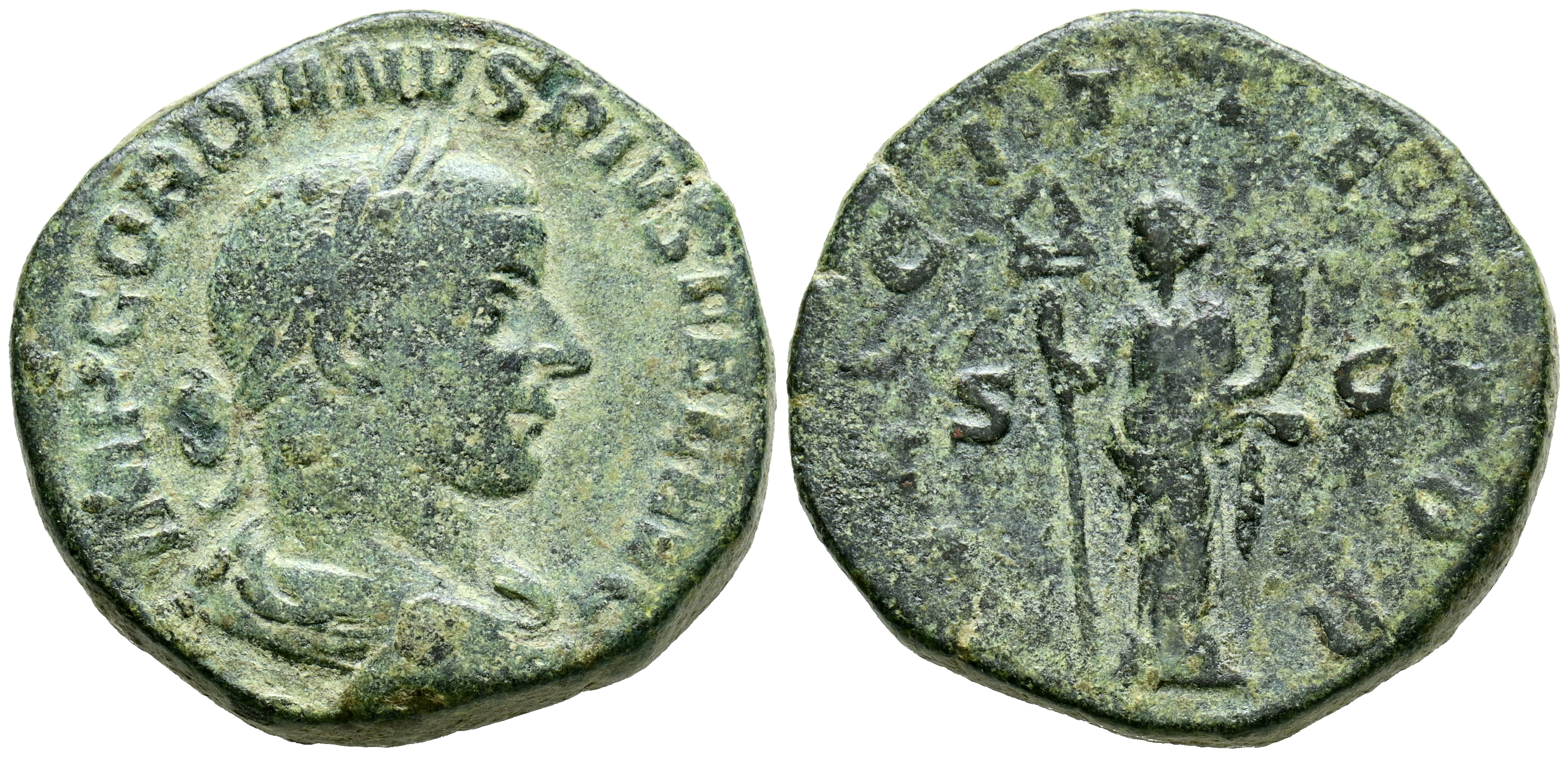 GORDIANO III. Sestercio. (Ae. 20,00g/30mm). 243-244 d.C. Roma. (RIC 328a). Anv: Busto laureado y drapeado de Gordiano III a derecha, alrededor leyenda: IMP GORDIANVS PIVS FEL AVG. Rev: Felicitas estante a izquierda portando caduceo y cetro, entre: S-C, alrededor leyenda: FELICITAS TEMPOR. MBC-.