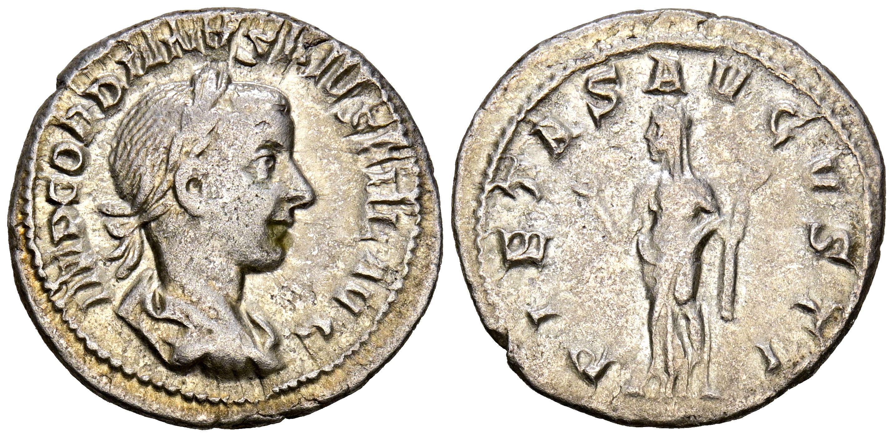 GORDIANO III. Denario. (Ar. 2,97g/20mm). 241 d.C. Roma. (RIC 129). Anv: Laureado y busto drapeado de Gordiano III a la derecha, alrededor de la leyenda: IMP GORDIANVS PIVS FEL AVG. Rev: de pie de pie a la izquierda levantando ambas manos, alrededor de la leyenda: PIETAS AVGVSTI. Casi extremadamente fino. Restos del brillo original. MBC+.