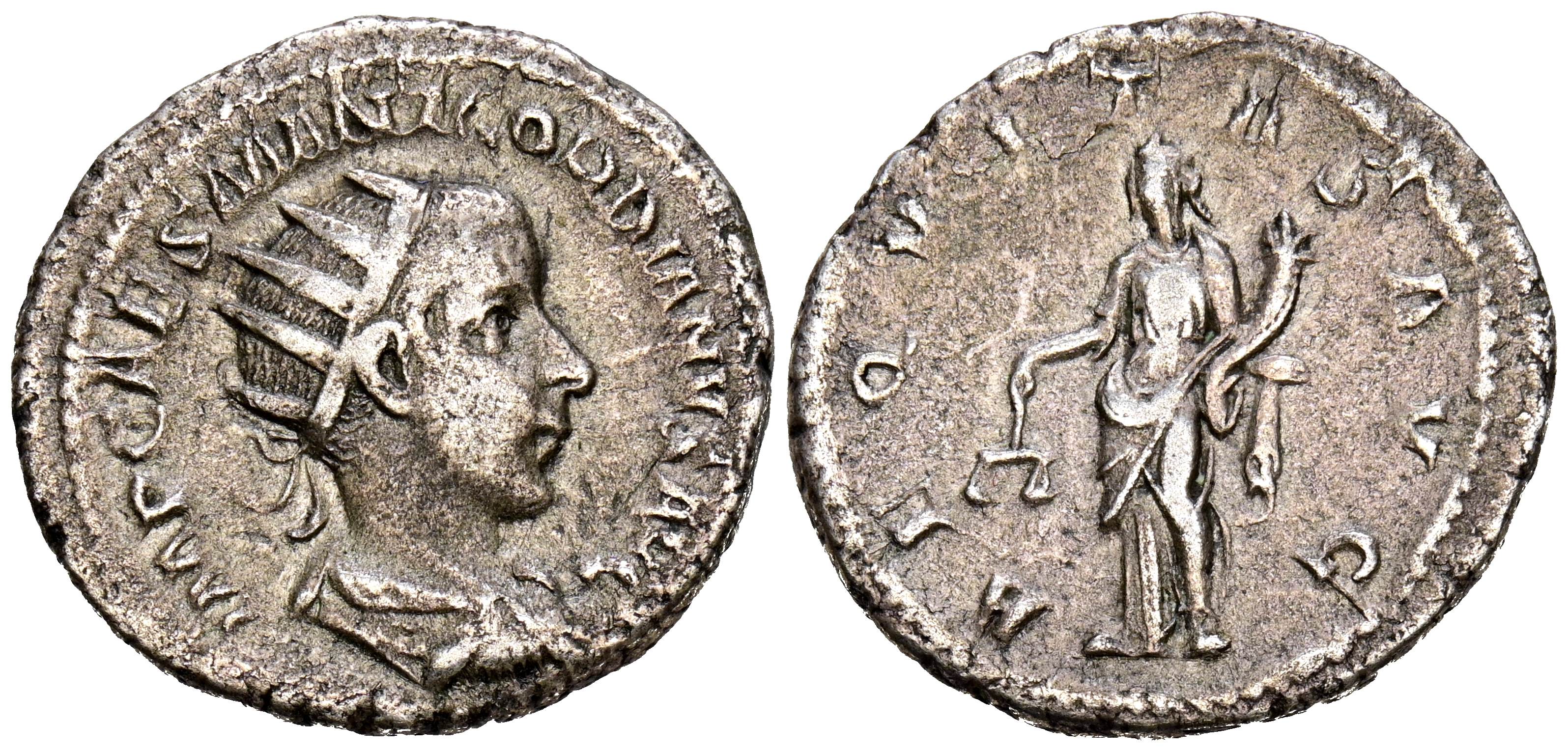 GORDIANO III. Antoniniano. (Ar. 4,22g/22mm). 240 d.C. Roma. (RIC 34). Anv: Busto radiado y drapeado de Gordiano III a derecha, alrededor leyenda: IMP CAES M ANT GORDIANVS AVG. Rev: Aequitas estante a izquierda portando escalas y cornucopia, alrededor leyenda: AEQVITAS AVG. MBC.