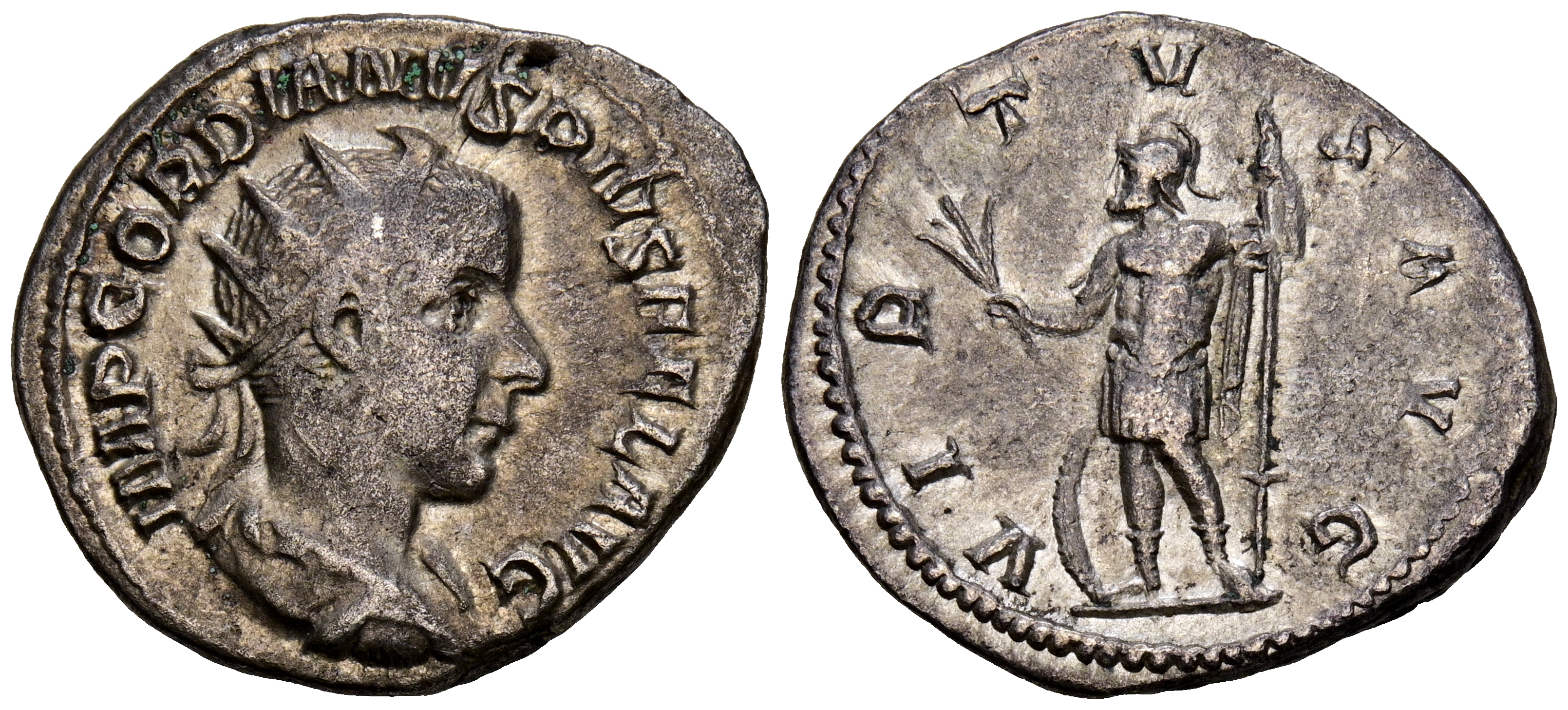 GORDIANO III. Antoniniano. (Ar. 4,64g/23mm). 238-239 d.C. Roma. (RIC 39). Anv: Busto radiado, drapeado y con coraza a derecha, alrededor leyenda: IMP GORDIANVS PIVS FEL AVG. Rev: Virtus estante a izquierda portando rama y lanza, detrás escudo, alrededor leyenda: VIRTVS AVG. MBC+. Atractivo ejemplar.