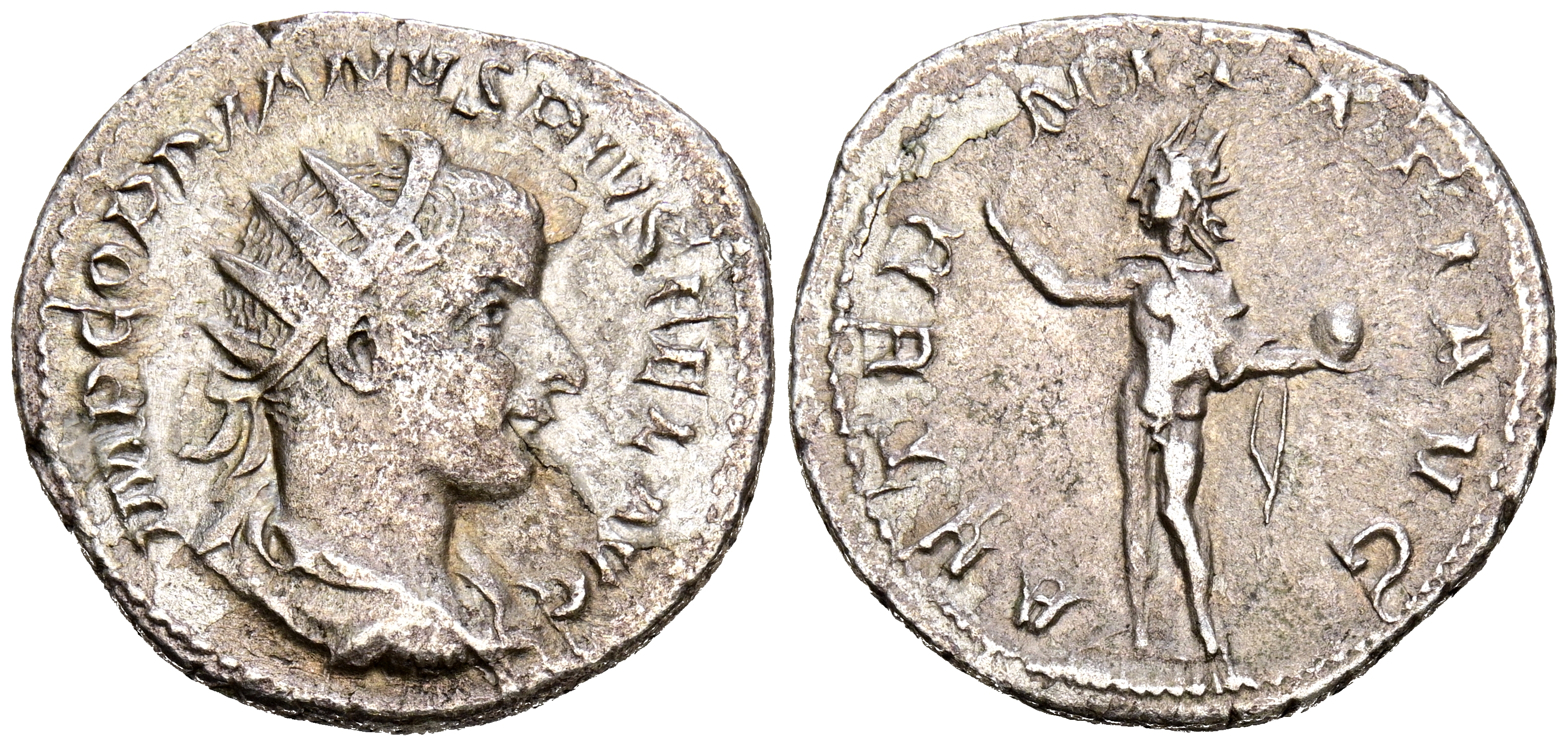 GORDIANO III. Antoniniano. (Ar. 3,80g/22mm). 241-243 D.C. Roma. (RIC 83). Anv: Busto radiado y drapeado de Gordiano III a derecha, alrededor leyenda: IMP GORDIANVS PIVS FEL AVG. Rev: Sol estante a izquierda alzando mano y portando globo, alrededor leyenda: AETERNATI AVG. MBC-.