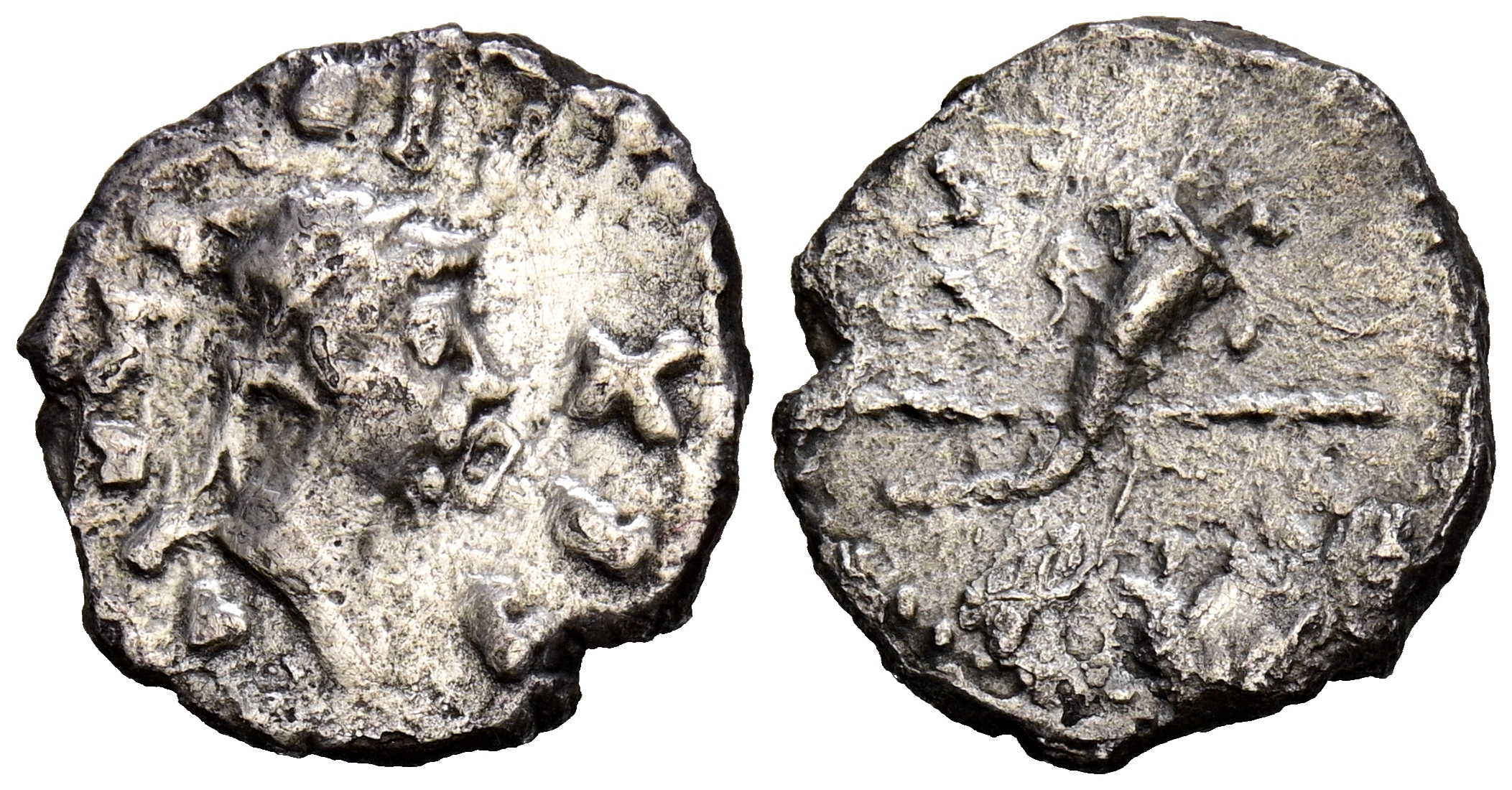 REYES DE MAURITANIA, Juba II. Quinario. (Ar. 1,59g/15mm). 25 a.C.-24 d.C. Cesarea. Anv: Cabeza laureada de Juba II a derecha, alrededor leyenda: REX IVBA. Rev: Cornucopia y cetro cruzado. BC+. Rara.
