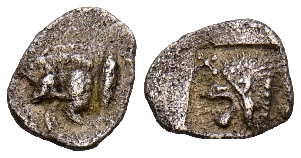 MISIA, Cícico. Hemióbolo. (Ar. 0,19g/7mm). 450-400 a.C. (Klein 265). Anv: Parte delantera de Jabalí a izquierda, detrás atún. Rev: Cabeza de león a izquierda dentro de cuadrado incuso. MBC.