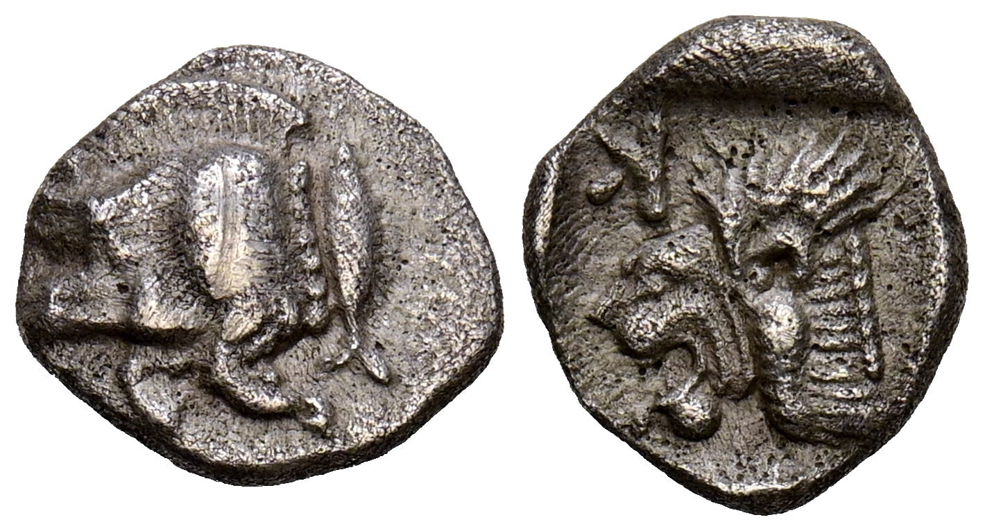 MISIA, Cícico. Obolo. (Ar. 0,71g/10mm). 450-400 a.C. (Klein 265). Anv: Parte delantera de Jabalí a izquierda, detrás atún. Rev: Cabeza de león a izquierda dentro de cuadrado incuso. MBC+.