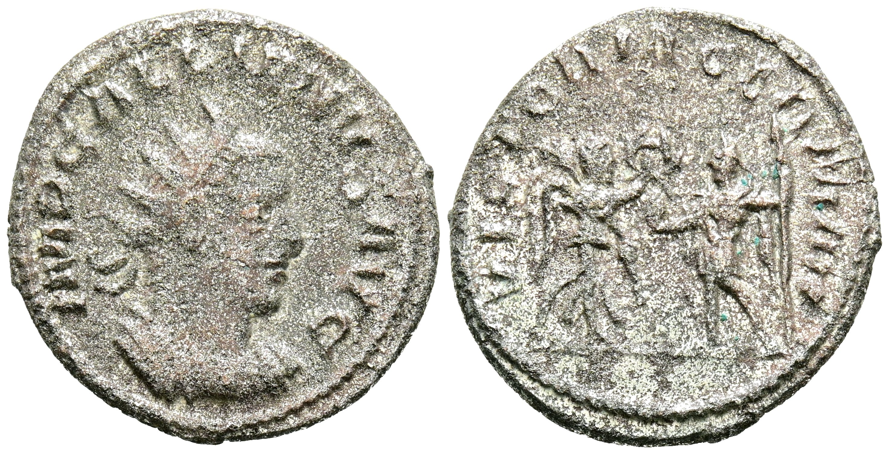 GALIENO. Antoniniano. (Ae. 3,51g/21mm). 256-257 d.C. Antioquía. (RIC-452; MIR-1603b). Anv: Busto radiado y con coraza a la derecha de Galieno, alrededor leyenda: IMP GALLIENVS AVG. Rev: Galieno estante a la izquierda portando globo y cetro y recibiendo corona de laurel de una Victoria estante a la derecha, alrededoor leyenda: VICTORIA GERMAN. MBC. Restos de plateado original. Escasa.