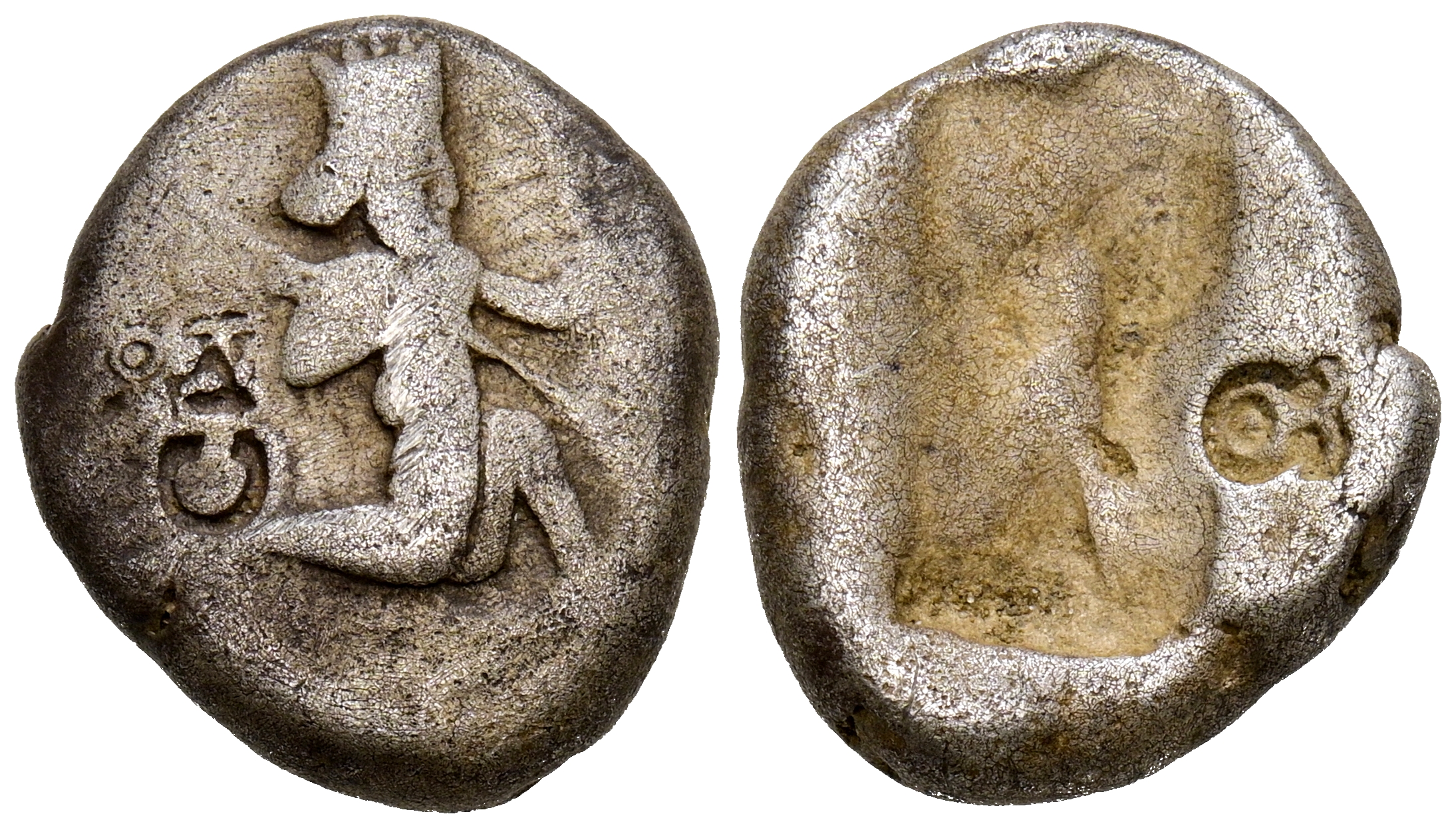 IMPERIO AQUEMENIDA, Tiempo de Xerxes I a Darios II. Siglos. (Ar. 5,29g/17mm). 485-420 a.C. Sardes. (Amanecer 25). Anv: Rey persa arrodillado a derecha portando arco y lanza y carcaj en su espalda. Rev: Cuadrado incuso. MBC. Contramarca en anverso.