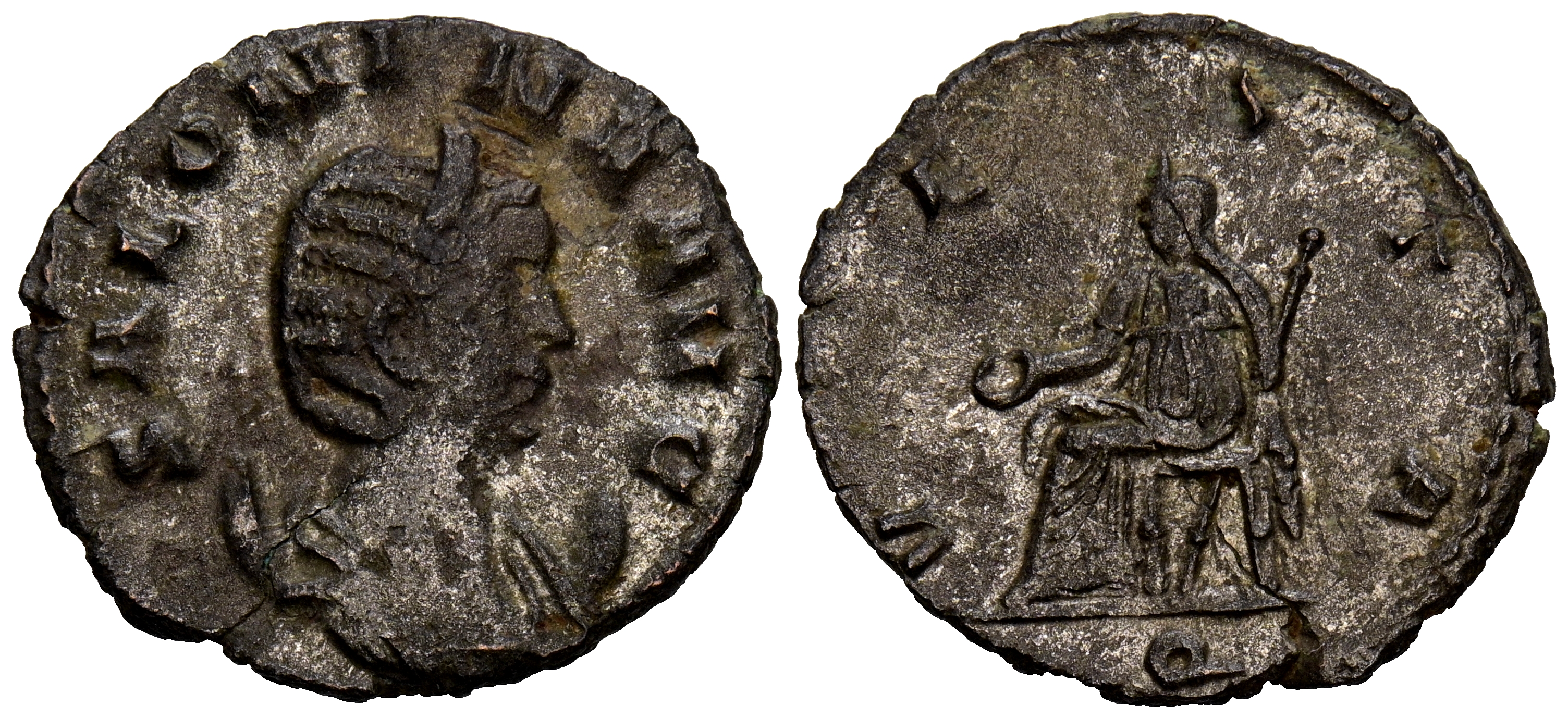 SALONINA. Antoniniano. (Ae. 2,57g/21mm). 260-261 d.C. Roma. (RIC 32). Anv: Busto diademado y drapeado sobre creciente de Salonina a derecha, alrededor leyenda: SALONINA AVG. Rev: Vesta sentada a izquierda portando patera y cetro, en exergo: Q, alrededor leyenda: VESTA. MBC-. Restos de plateado original.