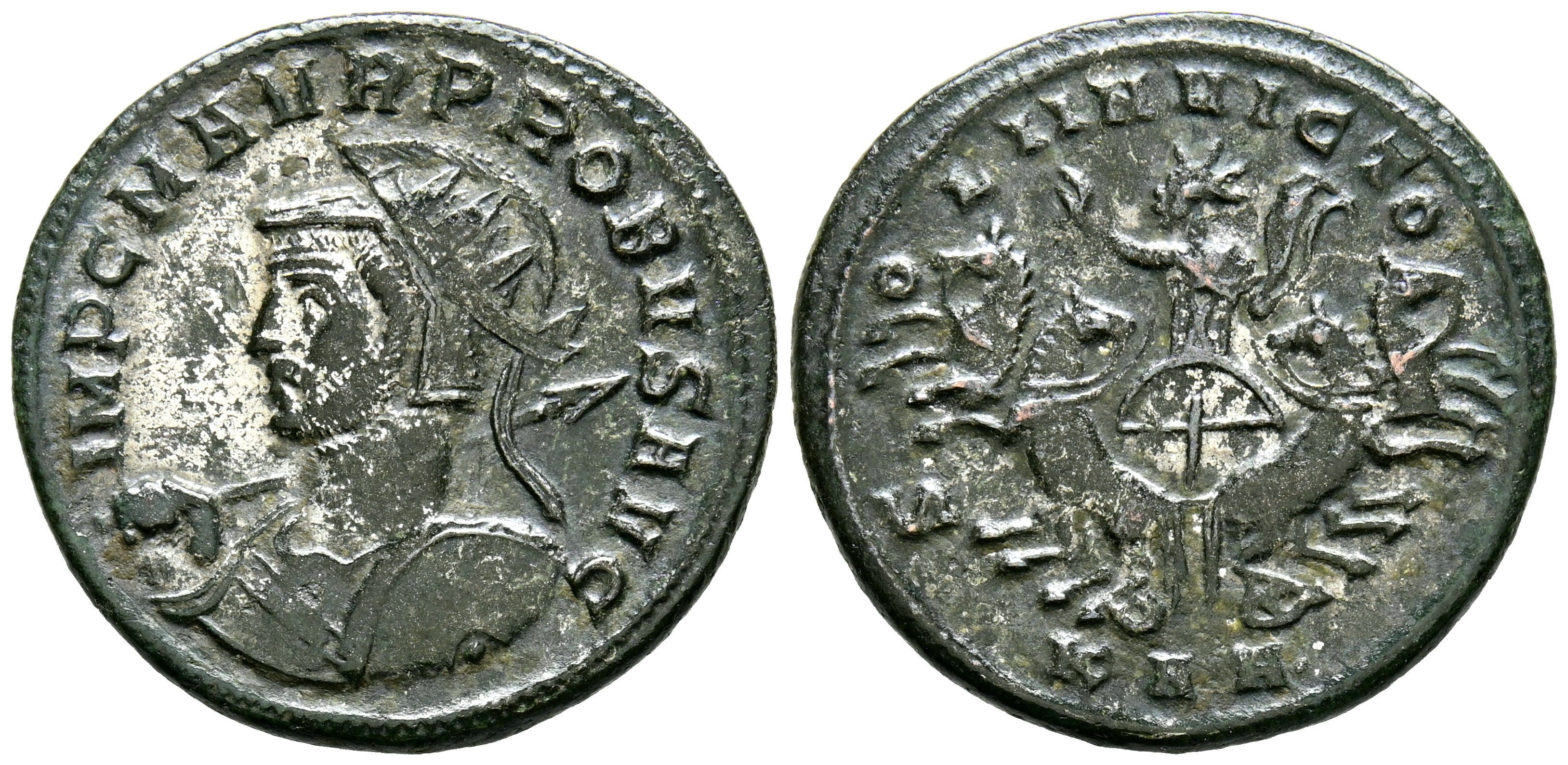 PROBO. Antoniniano. (Ae. 3,37g/23mm). 277 d.C. Serdica. (RIC 864). Anv: Busto de Probo con cosco y coraza a izquierda, portando lanza sobre el hombro y escudo, alrededor leyenda: IMP C M AVR PROBVS AVG. Rev: Sol sobre cuádriga de frente mirando a izquierda, alzando mano derecha y portando látigo, debajo: KAM, alrededor leyenda: SOLI INVICTOS. MBC+.