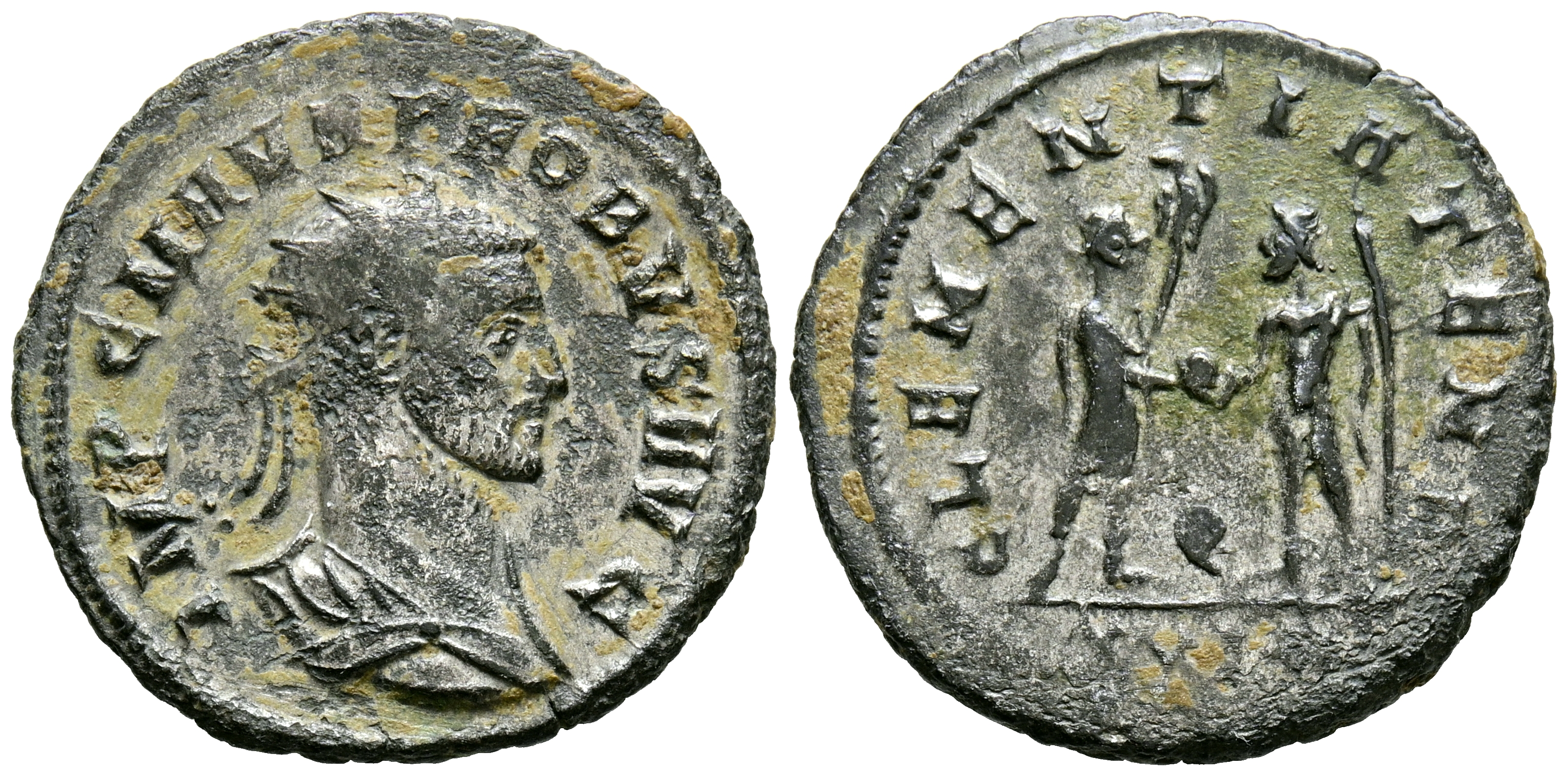 PROBO. Antoniniano. (Ve. 4,14g/22mm). 276 d.C. Antioquía. (RIC 920). Anv: Busto radiado, drapeado y con coraza de Probo a derecha, alrededor leyenda: IMP C M AVR PROBVS P F AVG. Rev: Probo estante a derecha portando lanza y recibiendo Victoria sobre globo de Júpiter estante a izquierda portando cetro, entre ellos: Q, en exergo: XXI, alrededor leyenda: CLEMENTIA TEMP. MBC+. Plateado original.