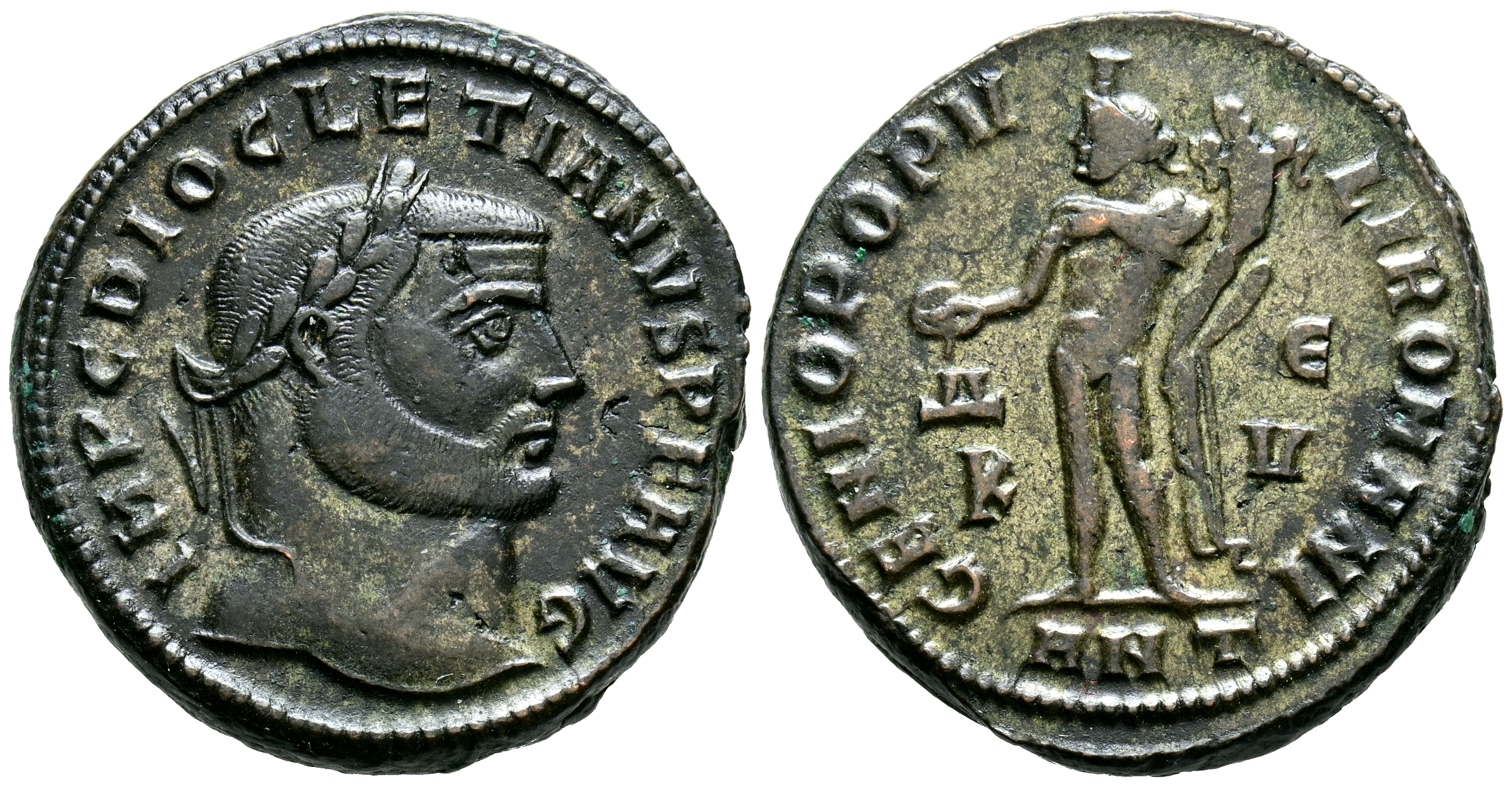 DIOCLECIANO. Follis. (Ae. 10,55g/26mm). 300-301 d.C. Antioquía. (RIC 54a var). Anv: Cabeza laureada de Diocleciano a derecha, alrededor leyenda: IMP C DIOCLETIANVS P F AVG. Rev: Genio estante a izquierda portando patera y cornucopia, entre: ?-?/K-V, en exergo: ANT, alrededor leyenda: GENIO POPVLI ROMANI. MBC+.