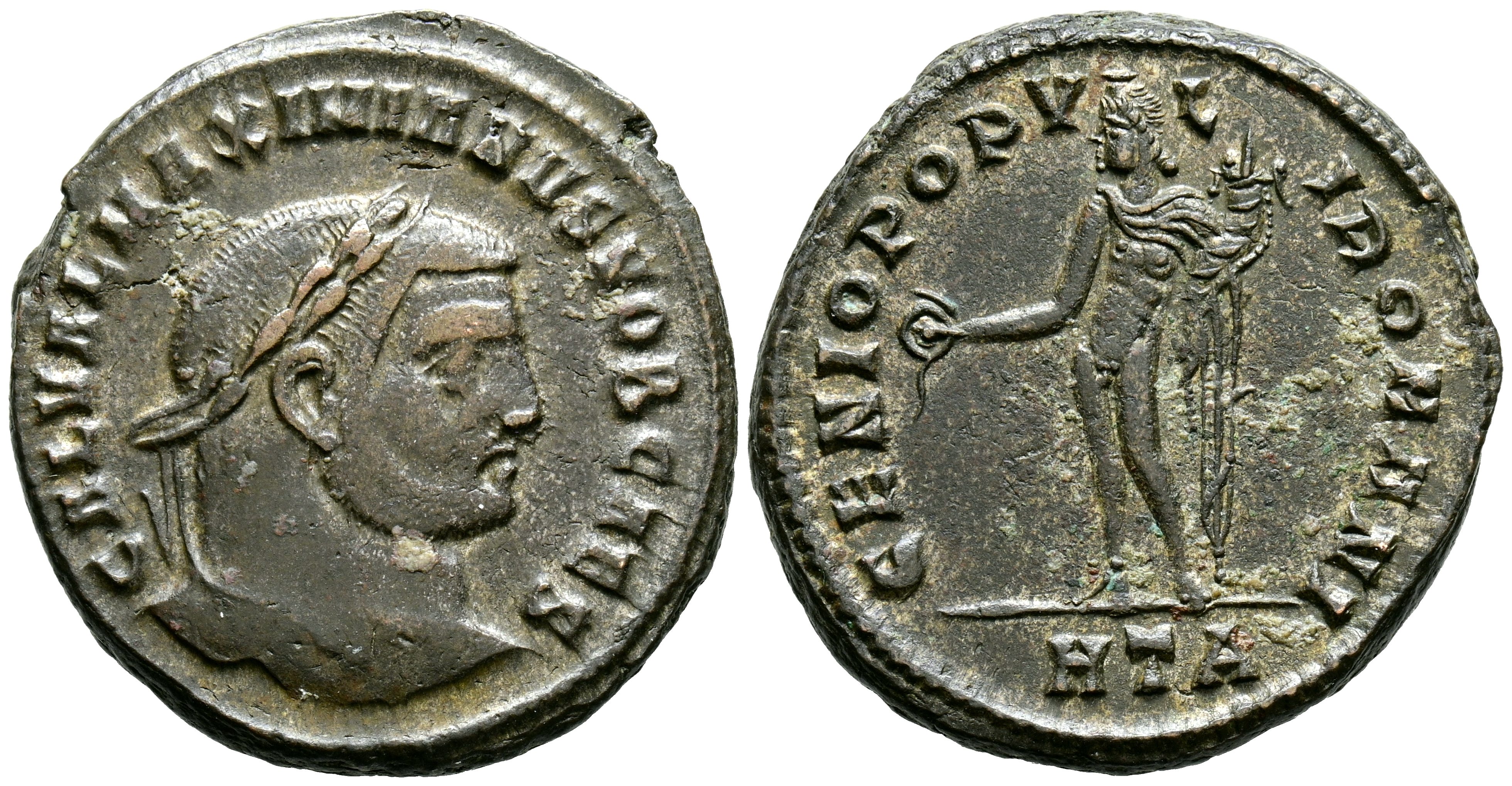 MAXIMIANO. Follis. (Ae. 10,96g/28mm). 296-297 d.C. Heráclea. (RIC 19b). Anv: Cabeza laureado de Maximiano a derecha, alrededor leyenda: IMP C M A MAXIMIANVS P F AVG. Rev: Genio estante a izquierda portando patera y cornucopia, en exergo: HTA, alrededor leyenda: GENIO POPVLI ROMANI. MBC+/EBC-.