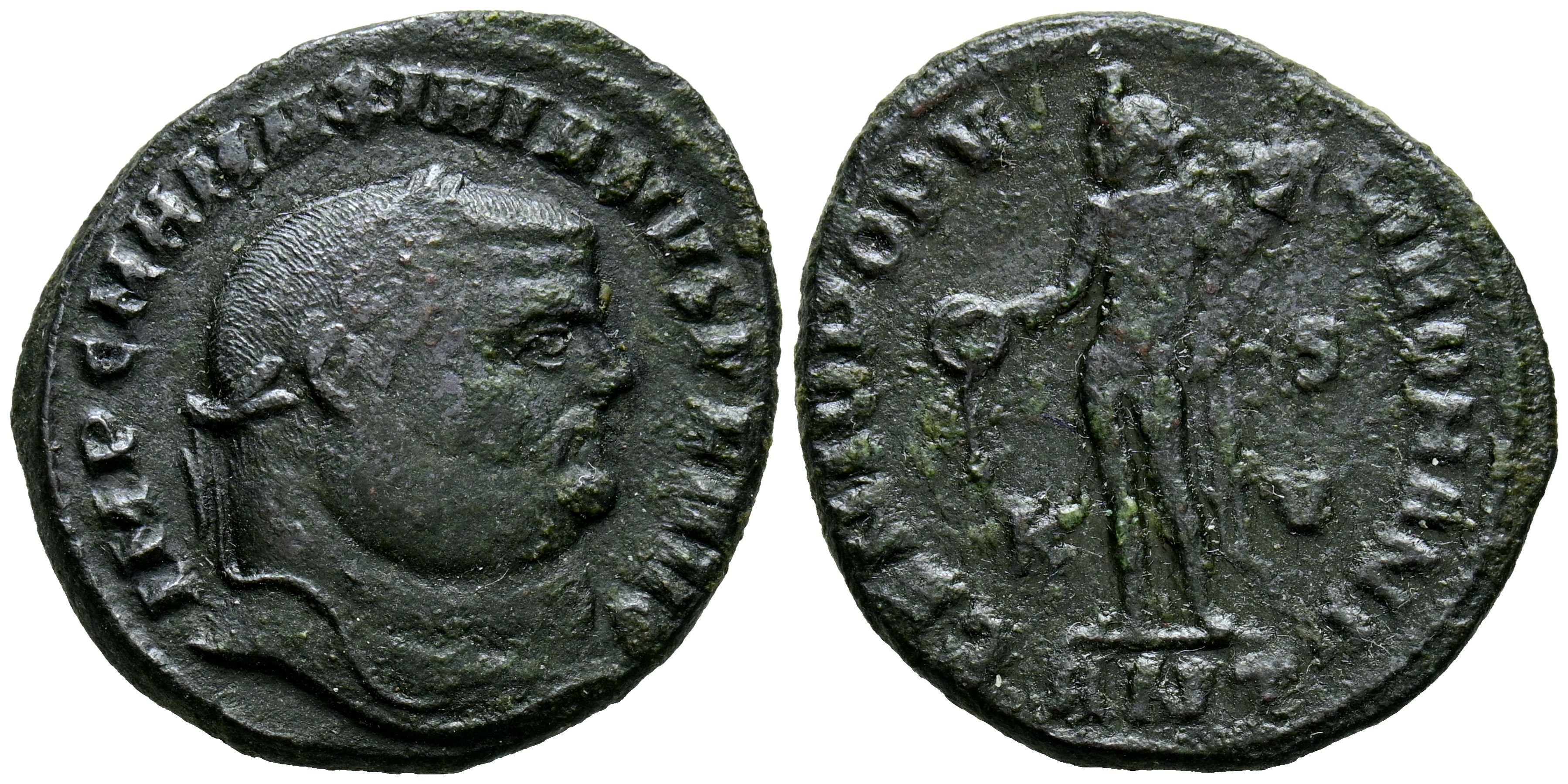 MAXIMIANO HERCÚLEO. Follis. (Ae. 8,24g/21mm). Antioquía. 294-295 d.C. (RIC 48b). Anv: Cabeza laureada de Maximiano Herculeo a derecha, alrededor leyenda: IMP C M A MAXIMIANVS P F AVG. Rev: Genio estante a izquierda portando cornucopia y patera, en campo: K-S/V, en exergo: ANT, alrededor leyenda: GENIO POPVLI ROMANI. MBC.