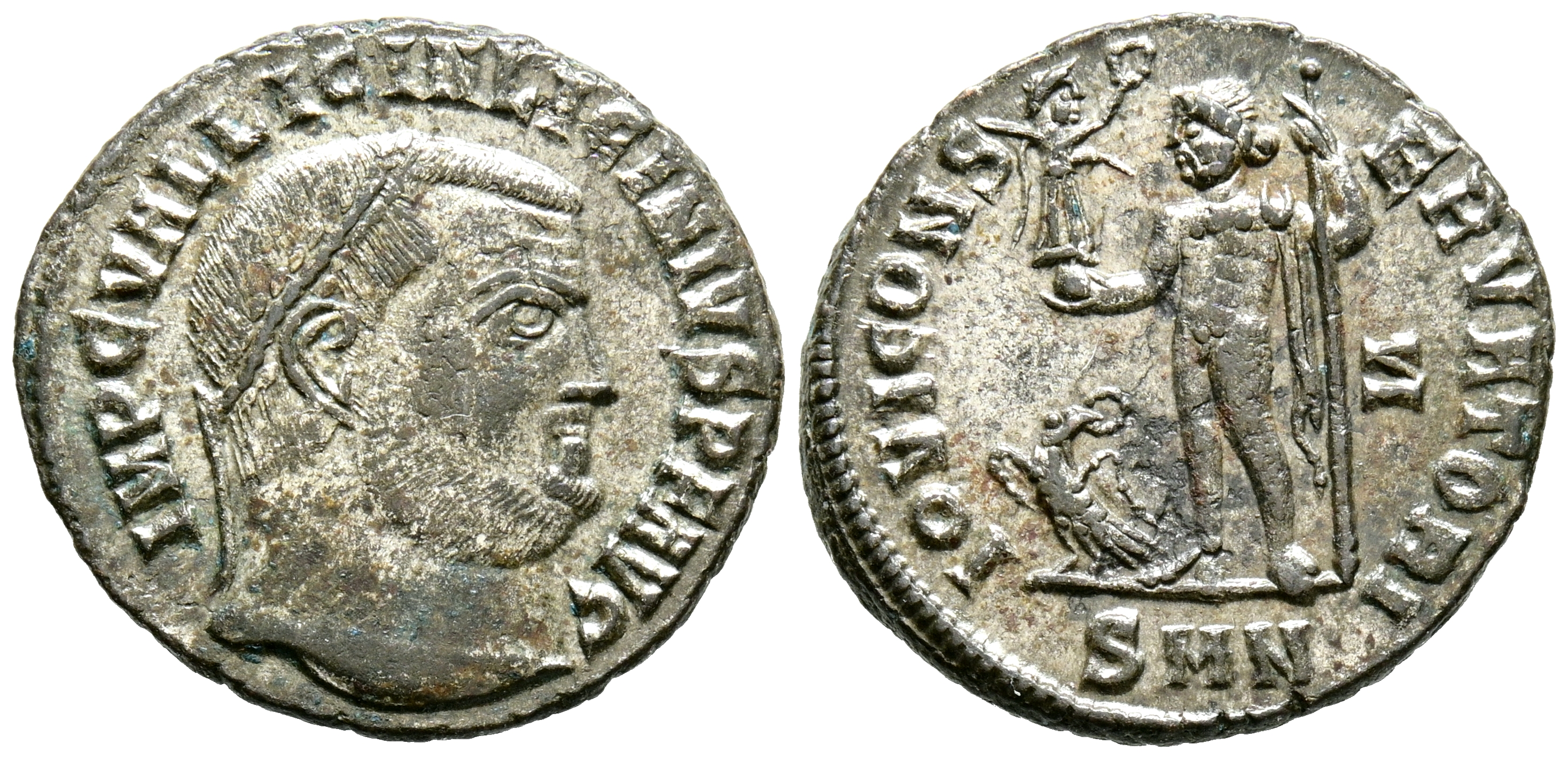 LICINIO I. Follis. (Ae. 3,49g/20mm). 311-317 d.C. Nicomedia. (RIC 13). Anv: Cabeza laureada de Licinio I a derecha, alrededor leyenda: IMP C VAL LICIN LICINIVS P F AVG. Rev: Júpiter estante a izquierda portando Victoria con corona de laurel y estandarte, a sus pies águila con corona de laurel, en el campo Z, en exergo: SMN, alrededor leyenda: IOVI CONSERVATORI. EBC-. Restos de plateado original.