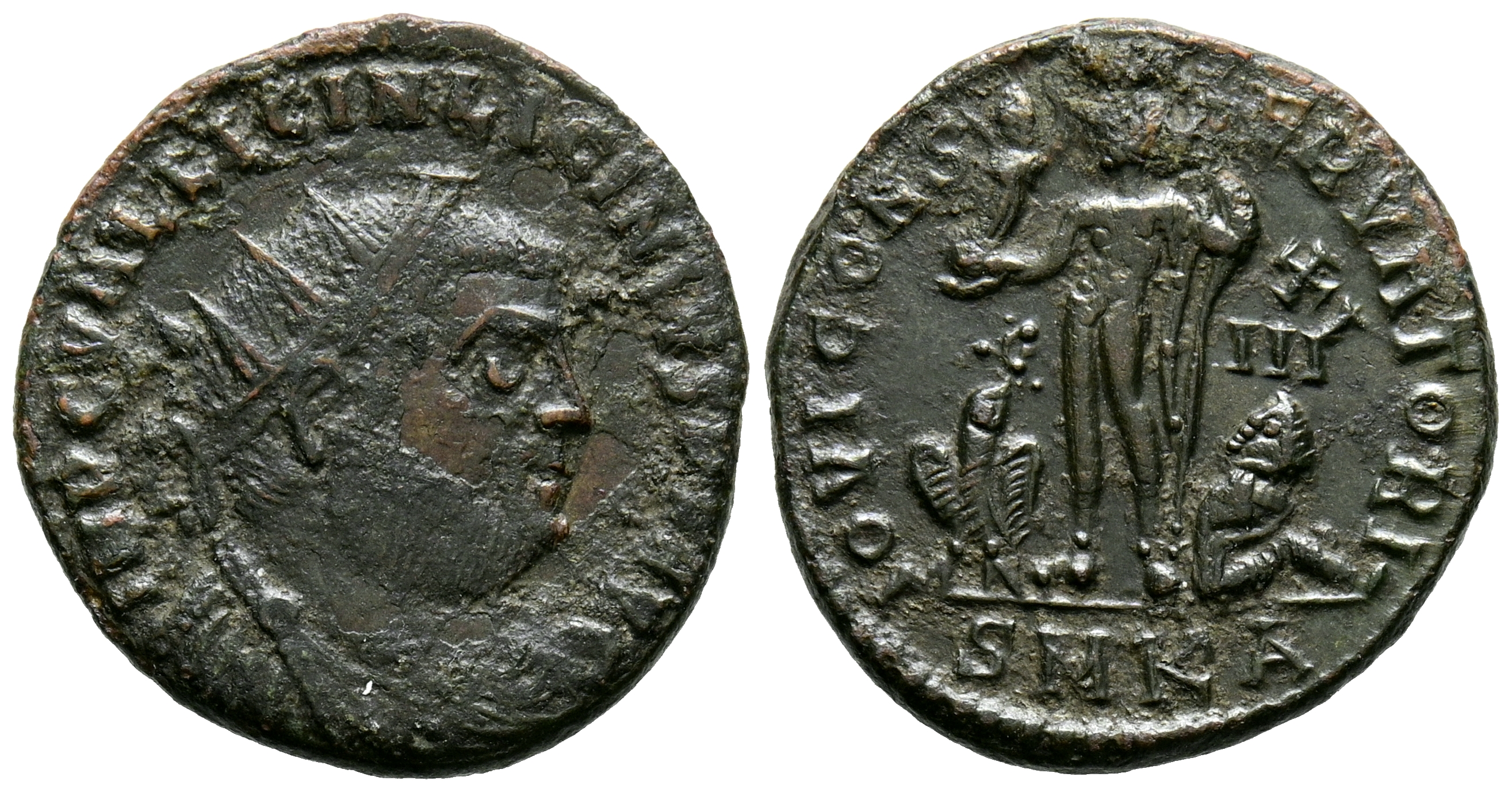 LICINIO I. Follis. (Ae. 2,93g/19mm). 321-324 d.C. Alejandría. (RIC 28). Anv: Busto radiado, drapeado y con coraza de Licinio I a derecha, alrededor leyenda: IMP C VAL LICIN LICINIVS P F AVG. Rev: Júpiter estante a izquierda portando Victoria con corona de laurel y cetro, detrás cautivo, delante águila con corona de laurel, en campo: X/IIr, en exergo: SMKA, alrededor leyenda: IOVI CONSERVATORI. MBC+.