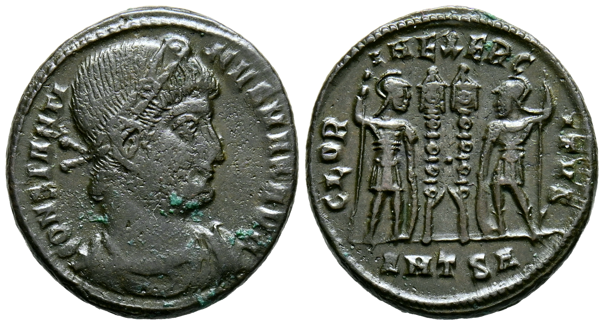 CONSTANTINO I. Follis. (Ae. 2,71g/19mm). 330-333 d.C. Tesalónica. (RIC 86). Anv: Busto diademado y drapeado de Constantino I a derecha, alrededor leyenda: CONSTANTINVS MAX AVG. Rev: Dos soldados estantes enfrentados con lanzas y escudos, entre ellos estandartes, en exergo: SMTSA, alrededor leyenda: GLORIA EXERCITVS. MBC.