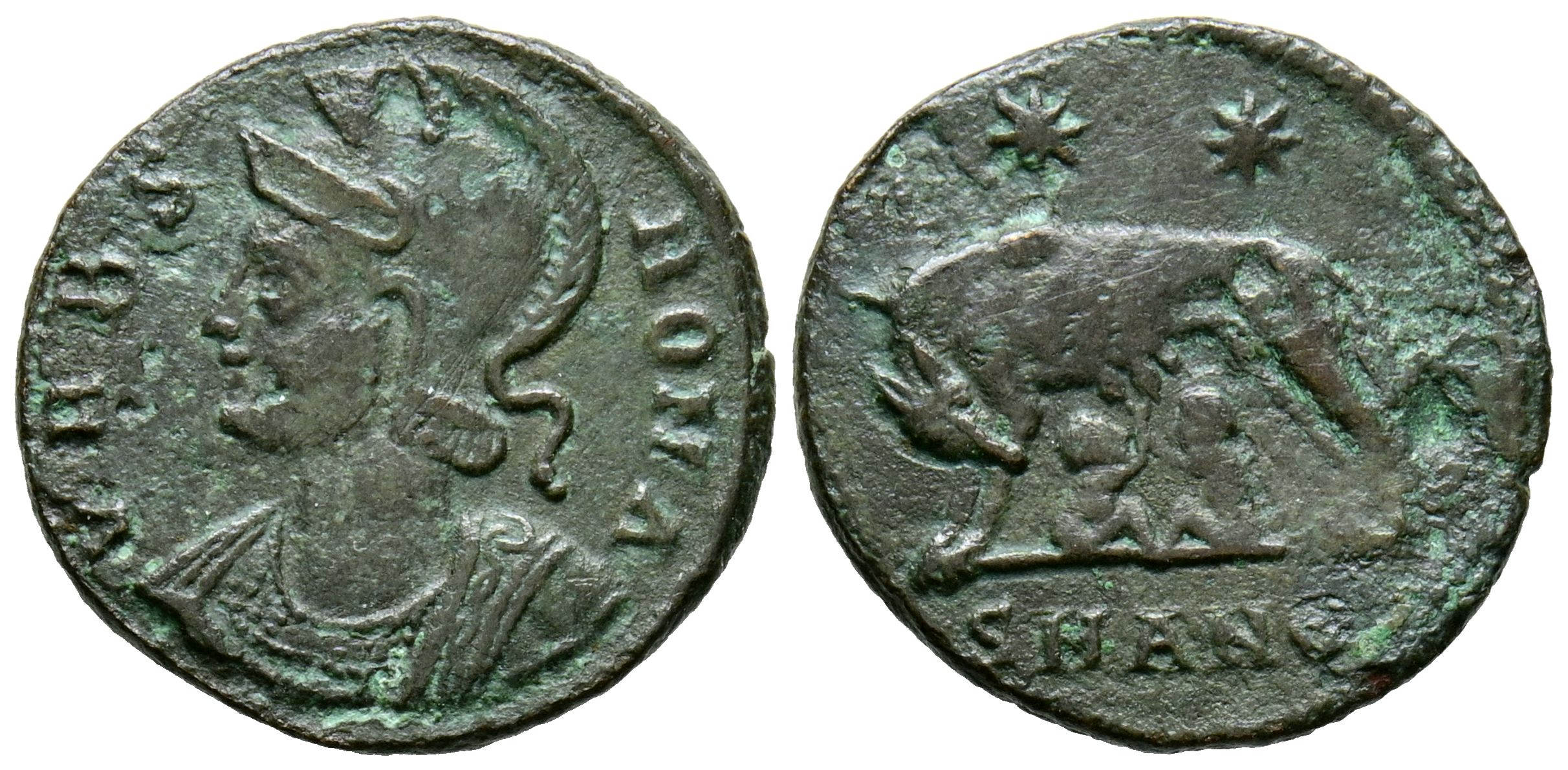 CONSTANTINO I. Follis. (Ae. 2,21g/17mm). 335-337 d.C. Antioquia. (RIC 113). Anv: Busto con casco y coraza de Roma a izquierda, alrededor leyenda: VRBS ROMA. Rev: Loba alimentando a Rómulo y Remo, encima dos estrellas, en exergo: SMANT. MBC-.