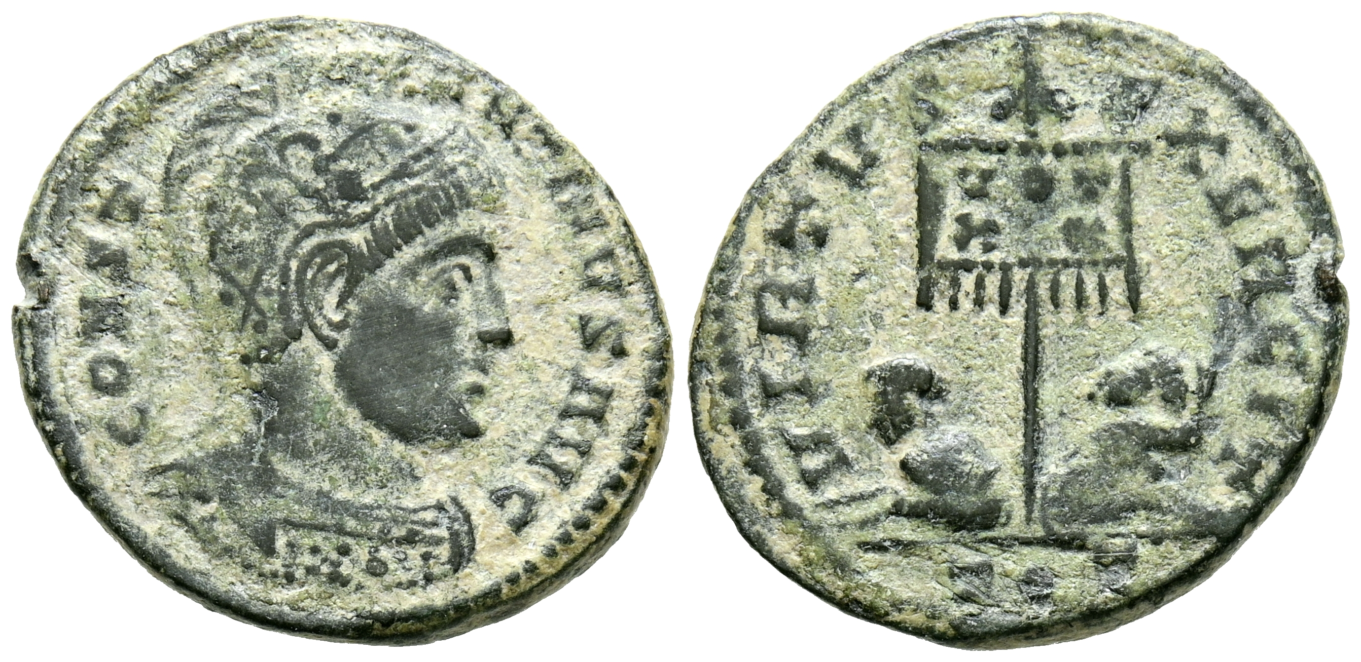 CONSTANTINO I. Follis. (Ae. 2,95g/20mm). 307-337 D.C. Treveri. (RIC 258). Anv: Busto con casco y coraza de Constanino I a derecha, alrededor leyenda: CONSTANTINVS AVG. Rev: Trofeo entre dos cautivos sentados, en exergo: PT, alrededor leyenda: VIRTVS EXERCIT. MBC.