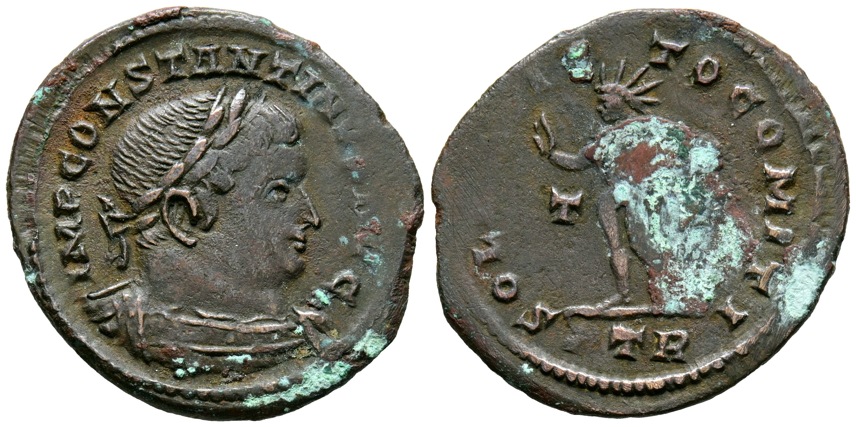 CONSTANTINO I. Follis. (Ae. 3,45g/24mm). 306-337 d.C. Treveri. (RIC 870). Anv: Busto laureado con coraza de Constantino I a derecha, alrededor leyenda: IMP CONSTANTINVS AVG. Rev: Sol estante a izquierda, entre: T-F, en exergo: PTR, alrededor leyenda: SOLI INVICTO COMIT. MBC. Oxidaciones.