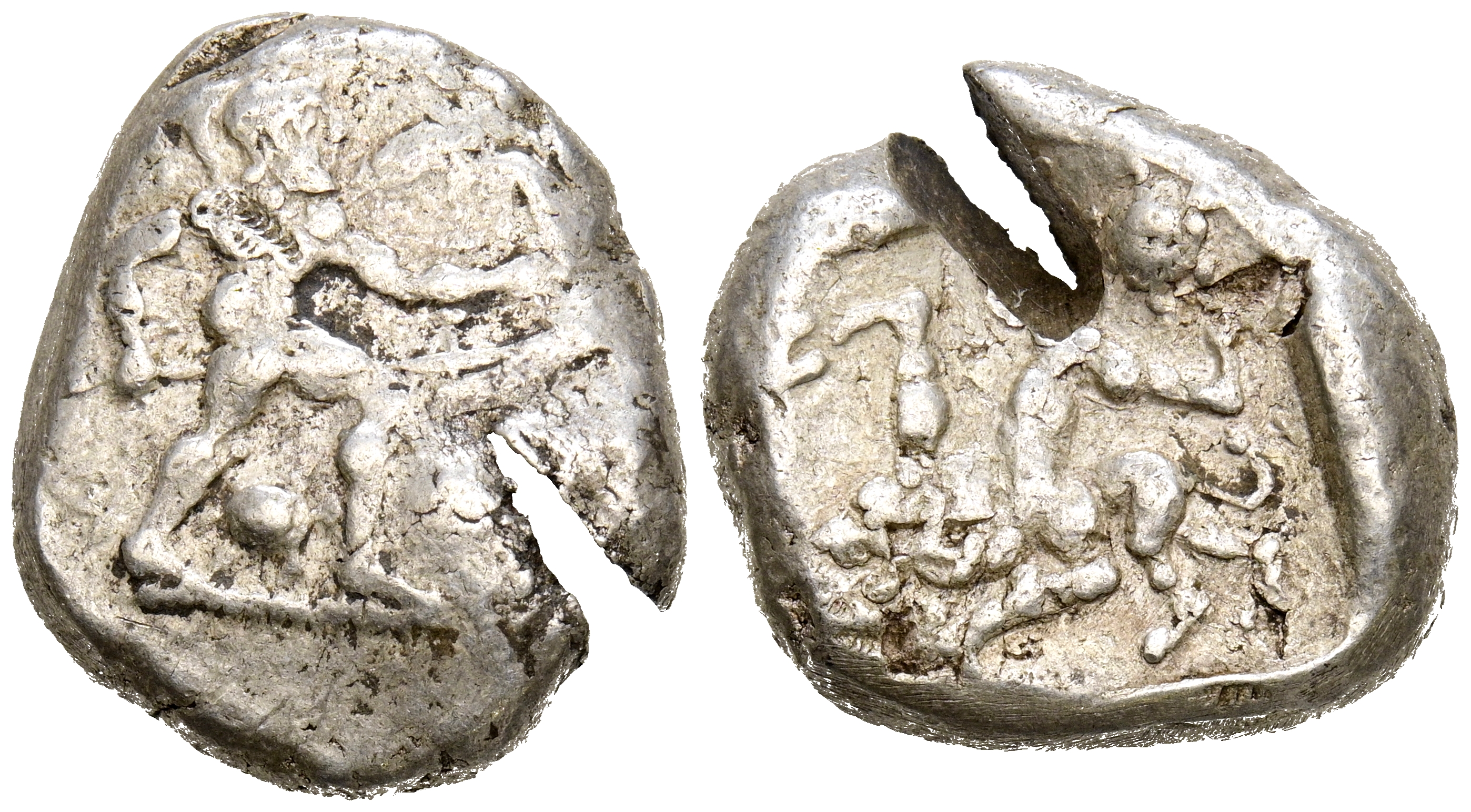 PAMPHYLIA, Aspendos. Estátera. (Ar. 9,73g/21mm). 465-430 a.C. (SNG von Aulock 4484). Anv: Guerrero con casco avanzando a derecha y portando lanza y escudo, entre sus piernas tortuga. Rev: Triskeles, detrás león a izquierda, encima: Ε-Σ y tortuga. MBC -. Golpe fuerte de cizalla.