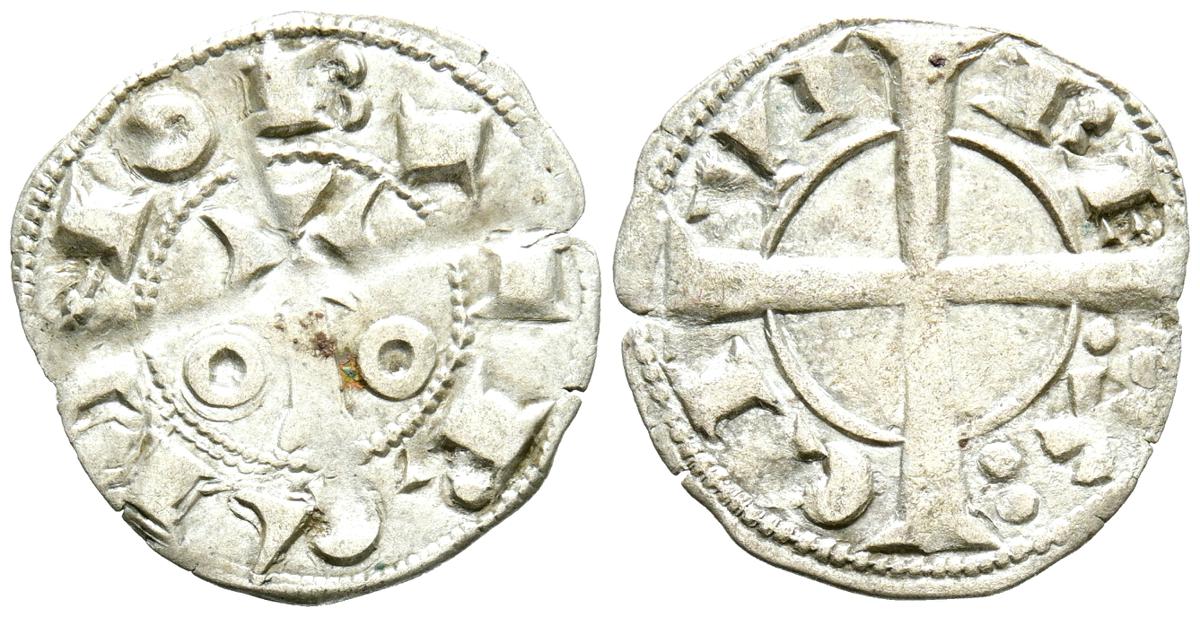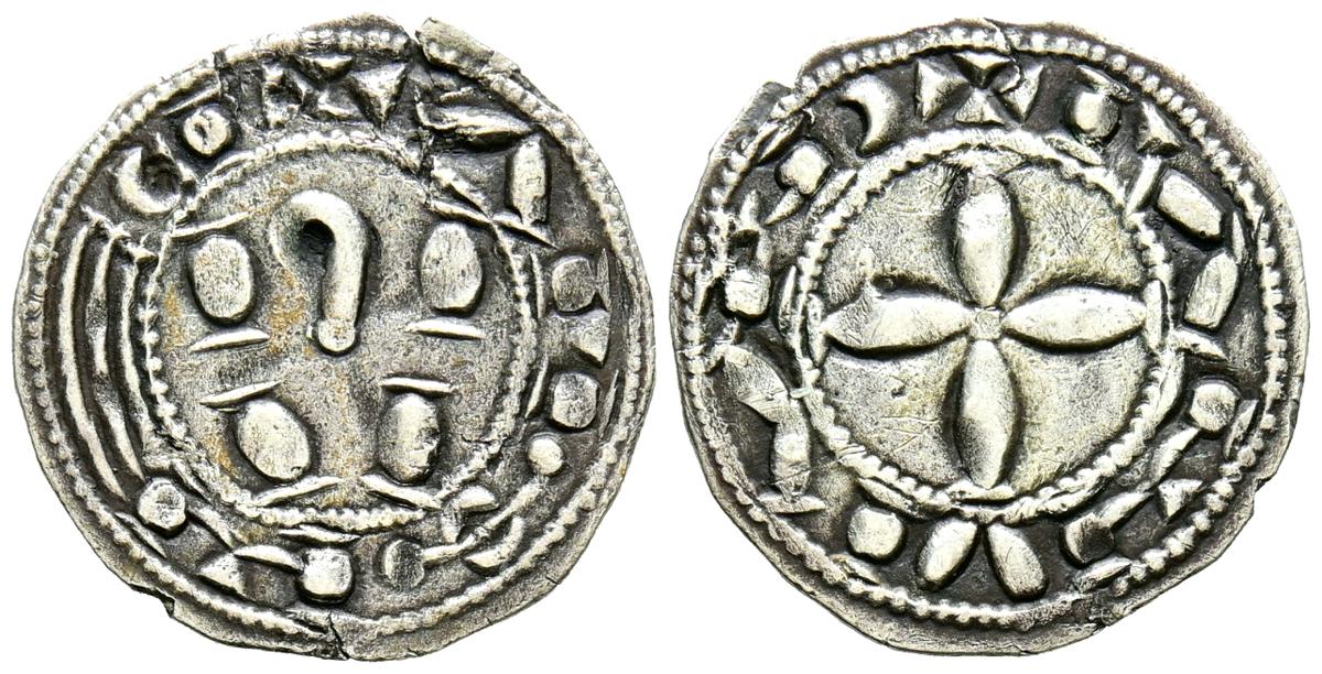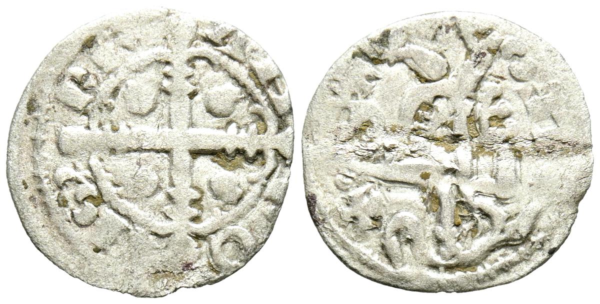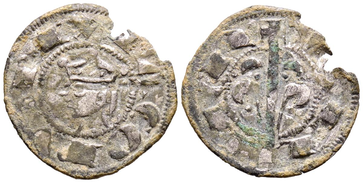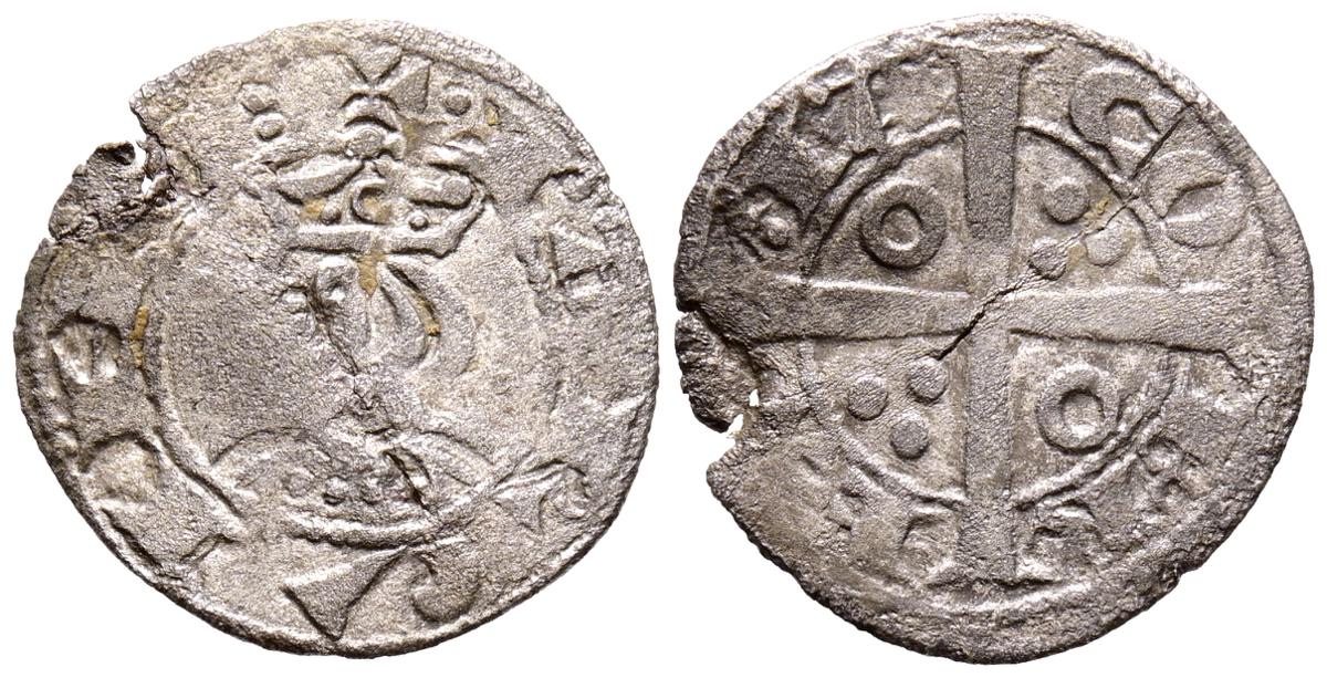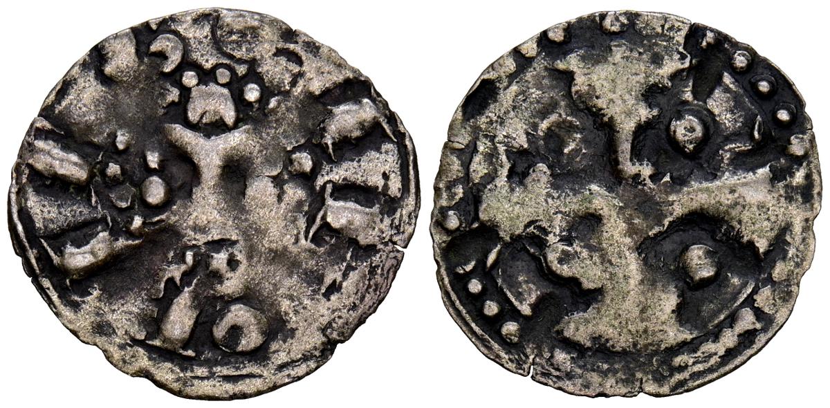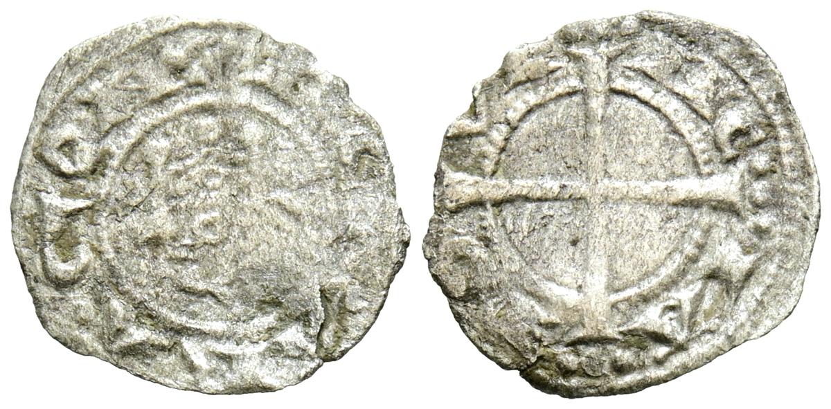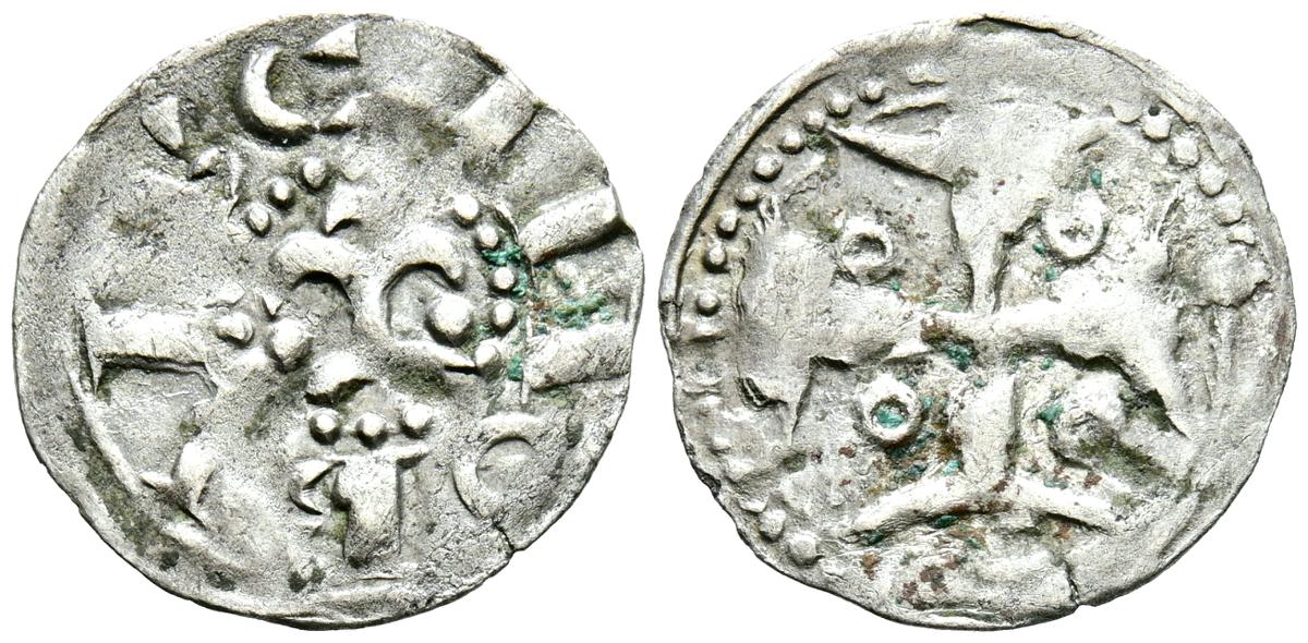 ALFONSO IX (1188-1230). Dinero. (Ar. 0,73g/16mm). Santiago de Compostela. (Imperatrix A9:5.15; FAB-130.3). Anv: Cruz floreada y veneras en los cuarteles, alrededor leyenda: ANFONS REX. Rev: León a derecha, encima cruz potenzada y venera, debajo: LEO, delante entre las patas: SI (superpuestas) y cruz potenzada. MBC. Cospel faltado. Escaso ejemplar.