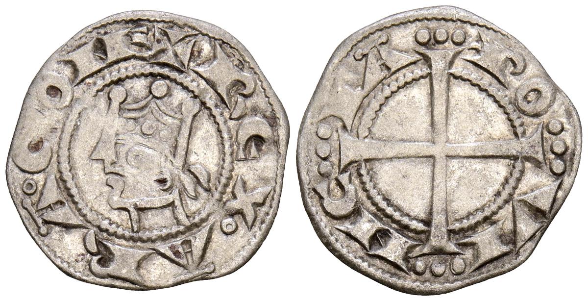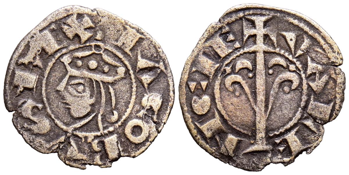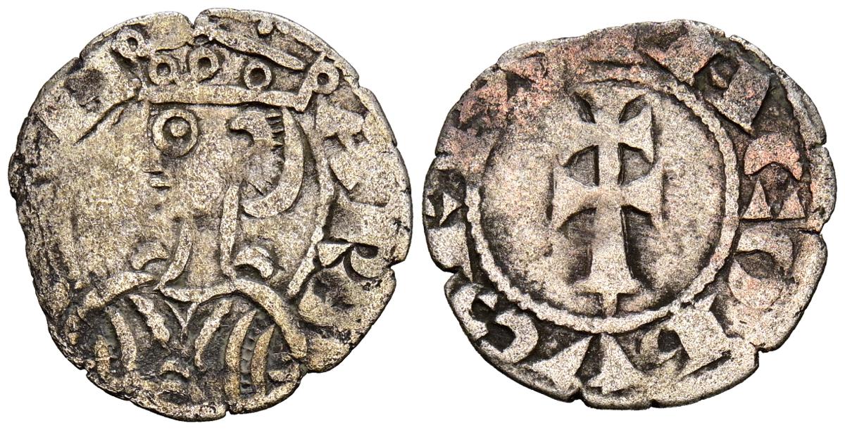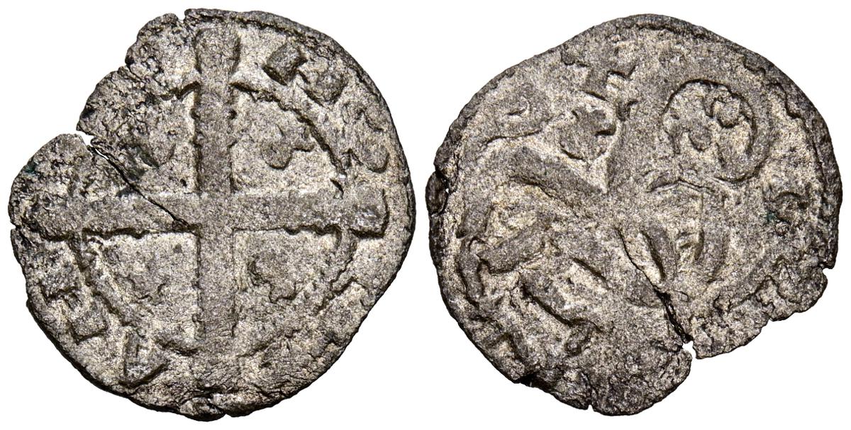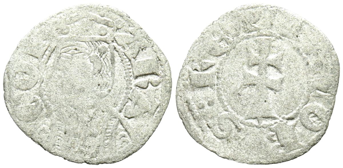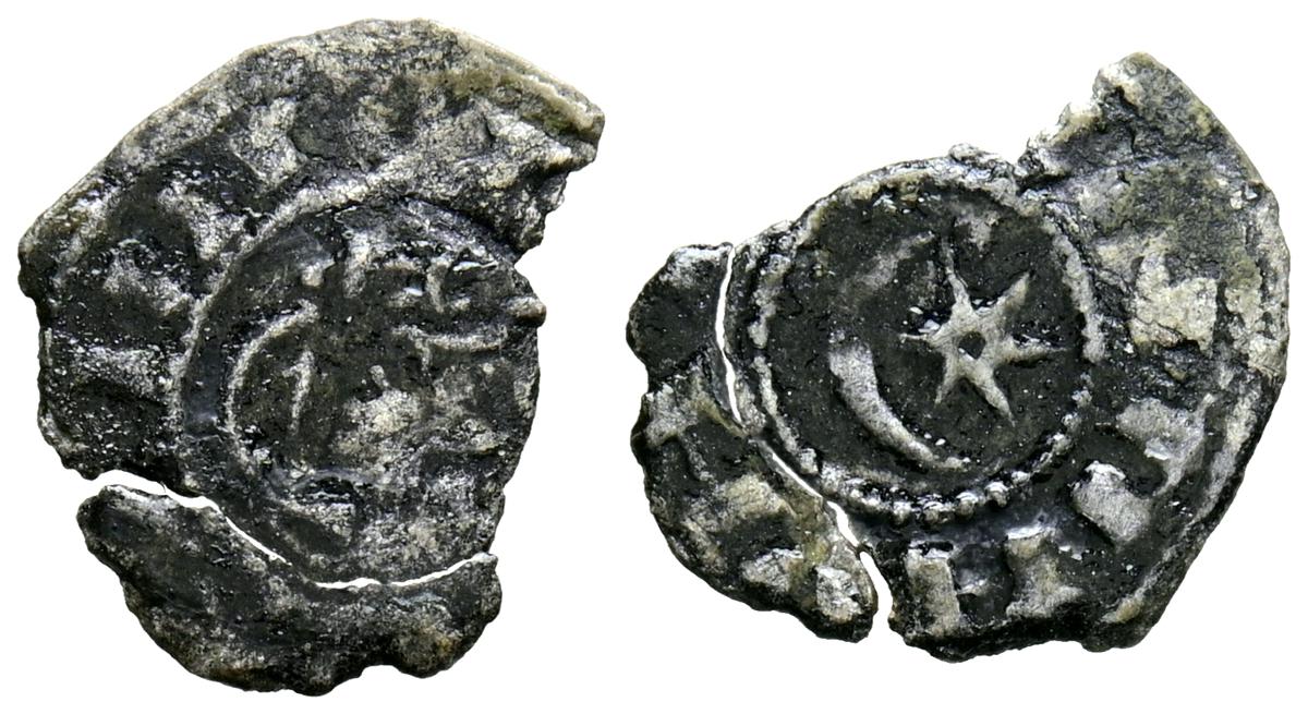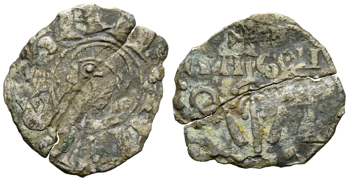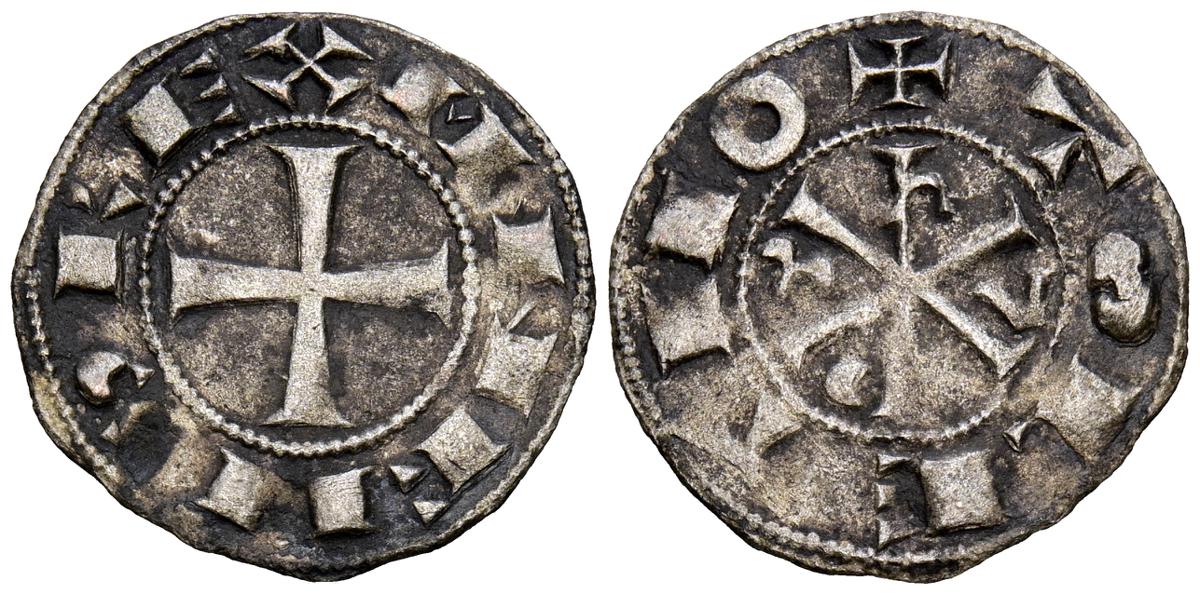 ALFONSO IX (1188-1230). Dinero. (Ar. 0,73g/16mm). Santiago de Compostela. (Imperatrix A9:5.15; FAB-130.3). Anv: Cruz floreada y veneras en los cuarteles, alrededor leyenda: ANFONS REX. Rev: León a derecha, encima cruz potenzada y venera, debajo: LEO, delante entre las patas: SI (superpuestas) y cruz potenzada. MBC. Cospel faltado. Escaso ejemplar.