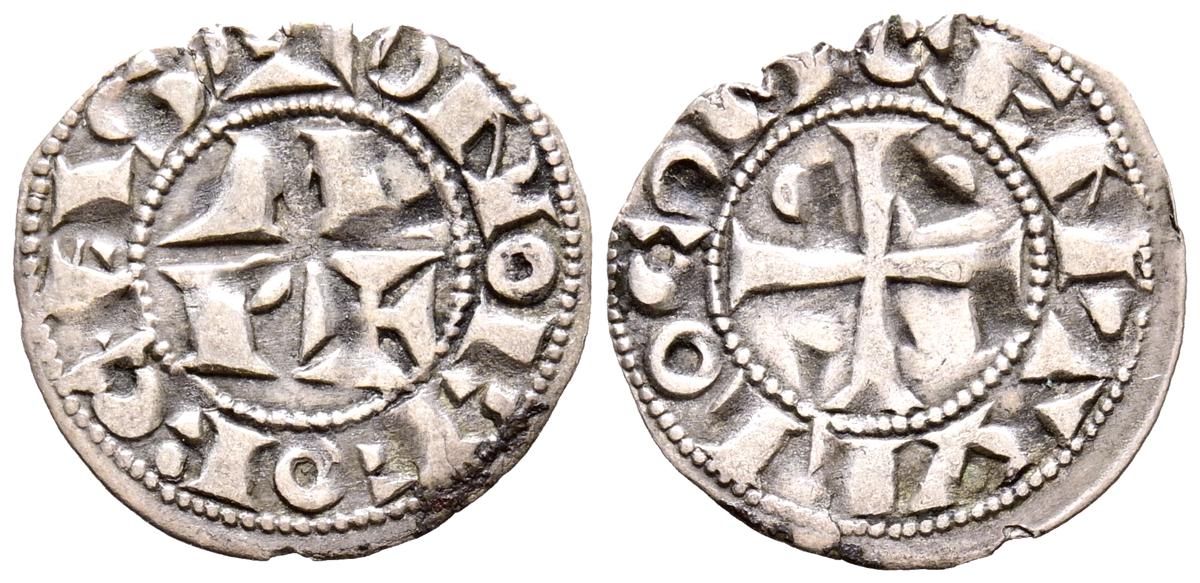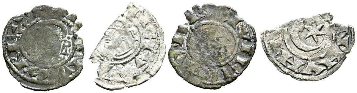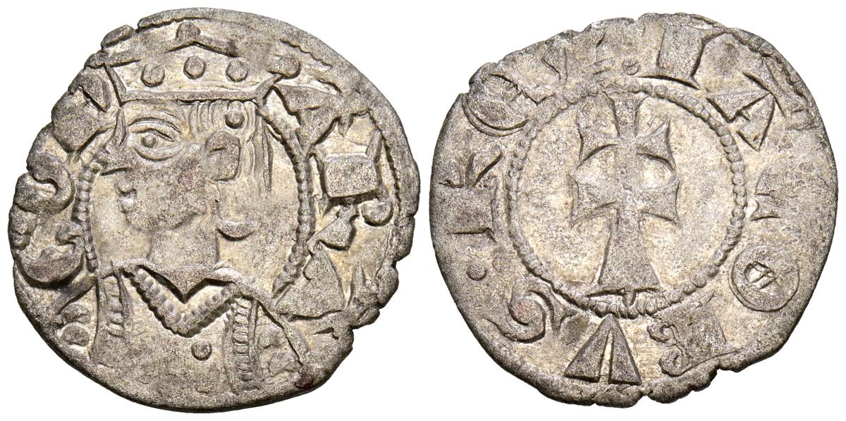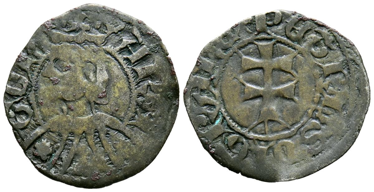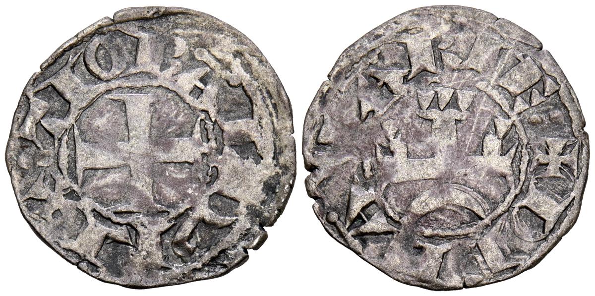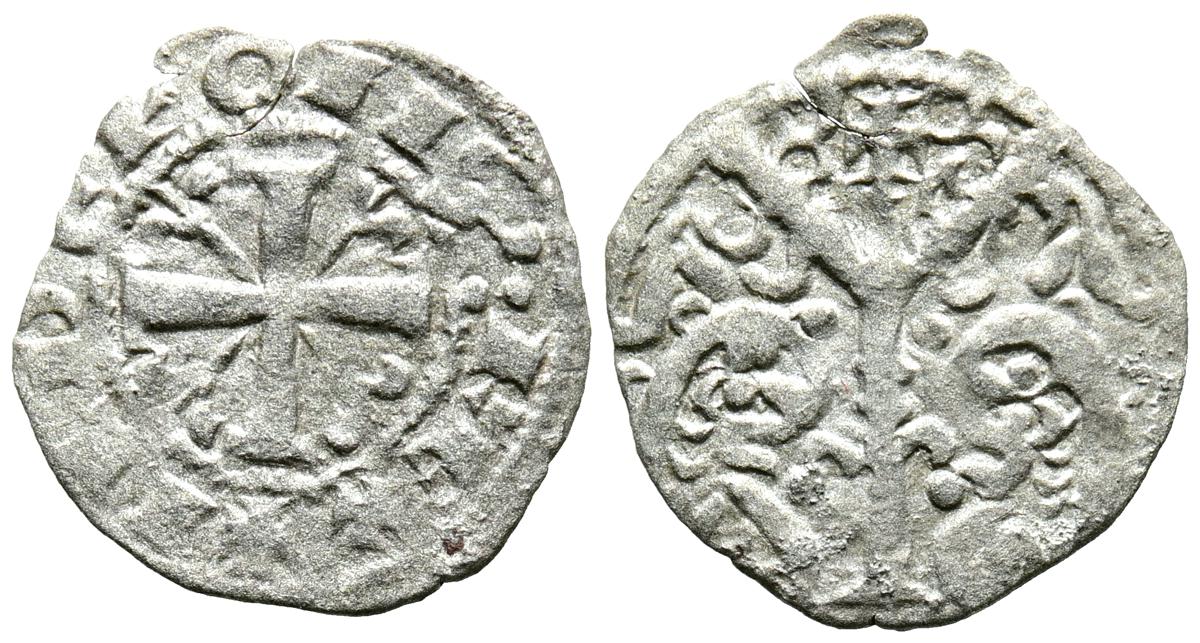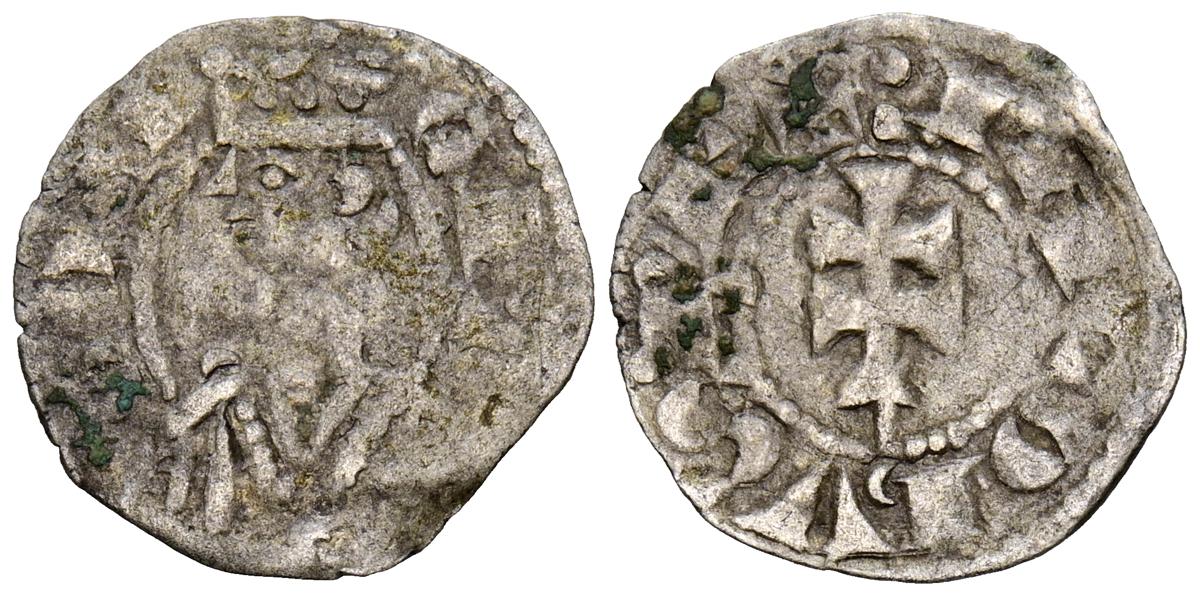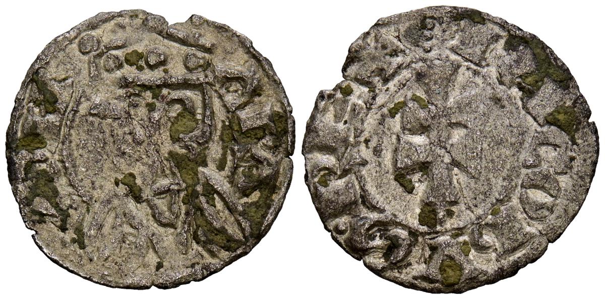 ALFONSO IX (1188-1230). Dinero. (Ar. 0,73g/16mm). Santiago de Compostela. (Imperatrix A9:5.15; FAB-130.3). Anv: Cruz floreada y veneras en los cuarteles, alrededor leyenda: ANFONS REX. Rev: León a derecha, encima cruz potenzada y venera, debajo: LEO, delante entre las patas: SI (superpuestas) y cruz potenzada. MBC. Cospel faltado. Escaso ejemplar.