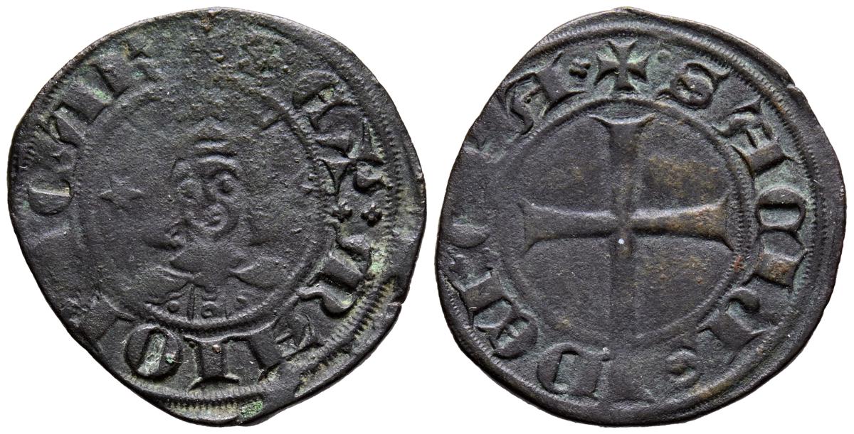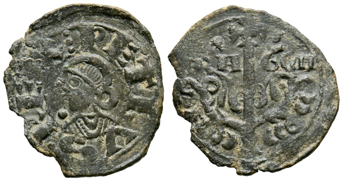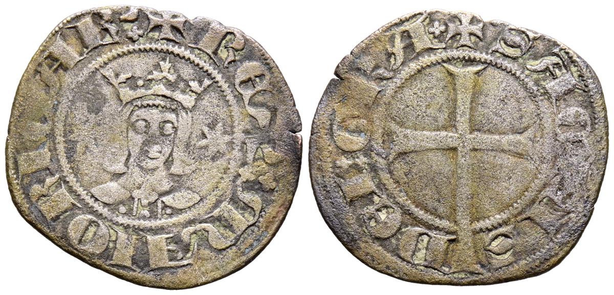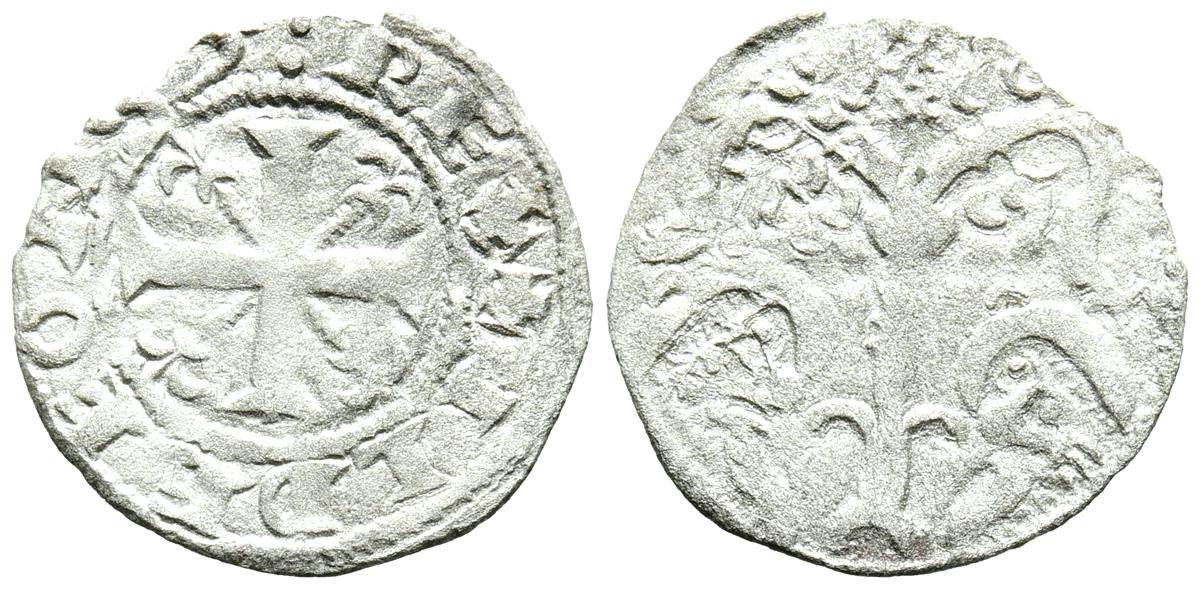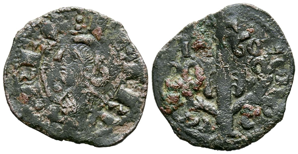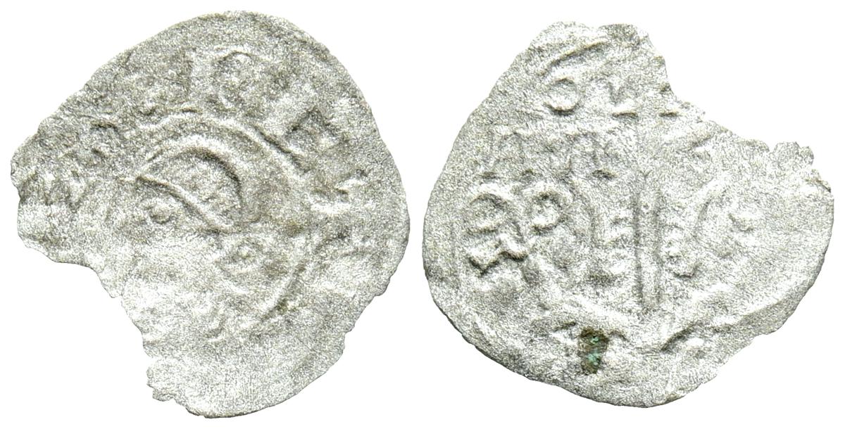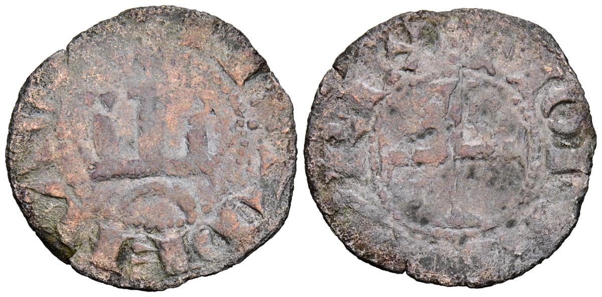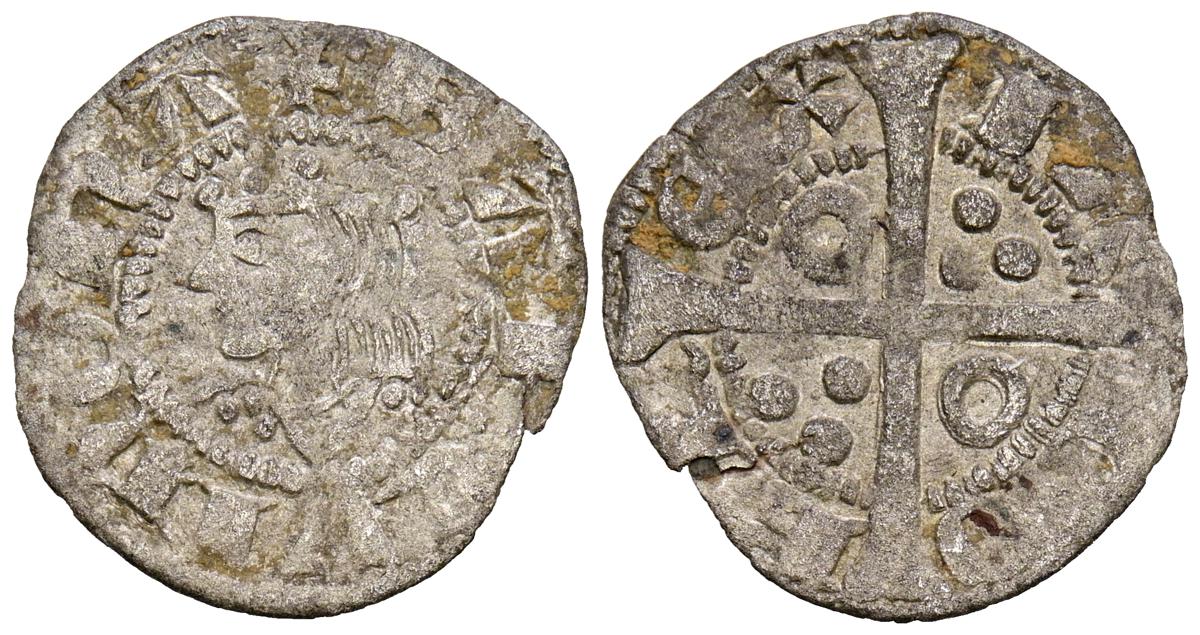 ALFONSO IX (1188-1230). Dinero. (Ar. 0,73g/16mm). Santiago de Compostela. (Imperatrix A9:5.15; FAB-130.3). Anv: Cruz floreada y veneras en los cuarteles, alrededor leyenda: ANFONS REX. Rev: León a derecha, encima cruz potenzada y venera, debajo: LEO, delante entre las patas: SI (superpuestas) y cruz potenzada. MBC. Cospel faltado. Escaso ejemplar.