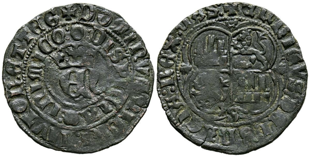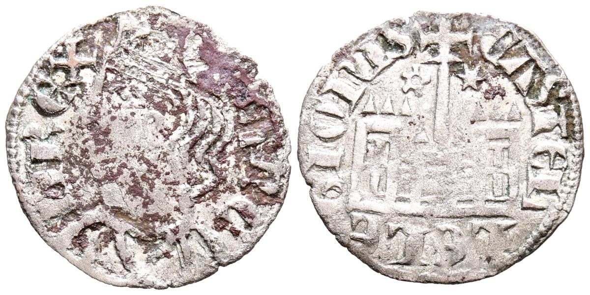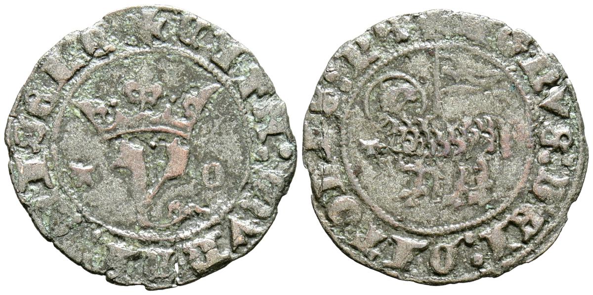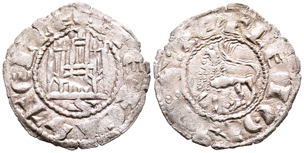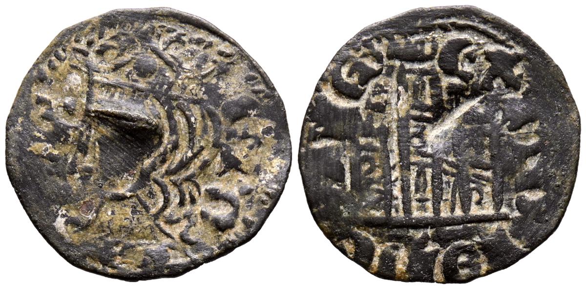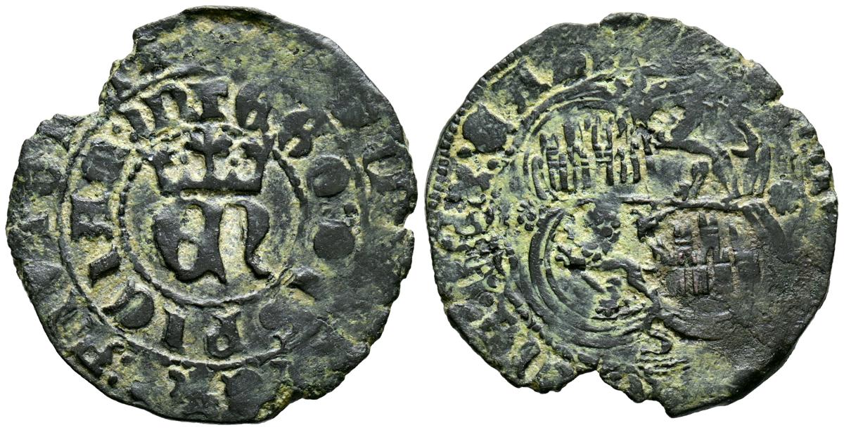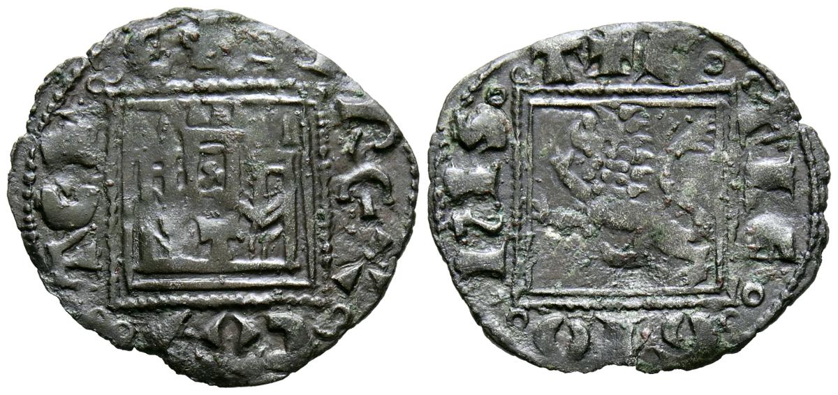 ENRIQUE II (1369-1379). Seisén. (Ae. 1,42g/22mm). Burgos. (Imperatrix E2:7.4; FAB-590, como Enrique III). Anv: Castillo, debajo B, todo dentro de gráfila circular, alrededor leyenda: ENRICVS REX CASTELLE. Rev: León rampante a izquierda, entre las patas las inicuales: BRV, todo dentro de gráfila circular, alrededor leyenda: ENRICVS REX LEGIONIS. MBC+. Escasa.