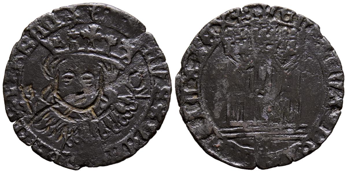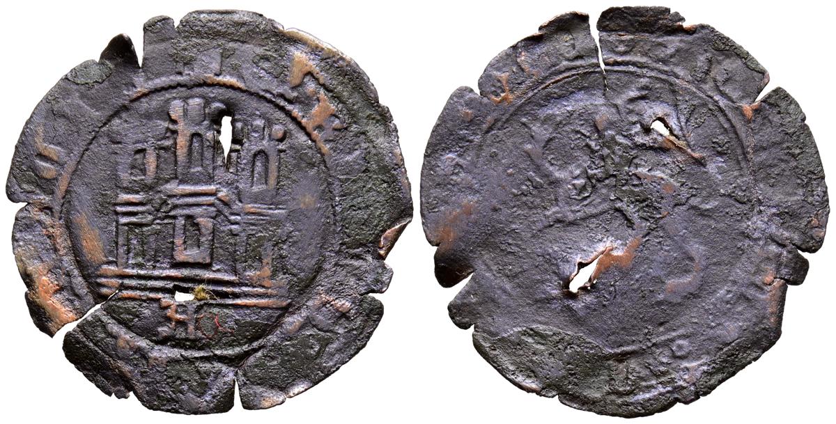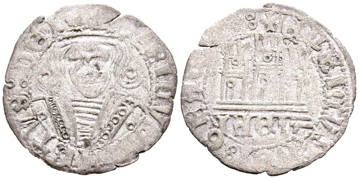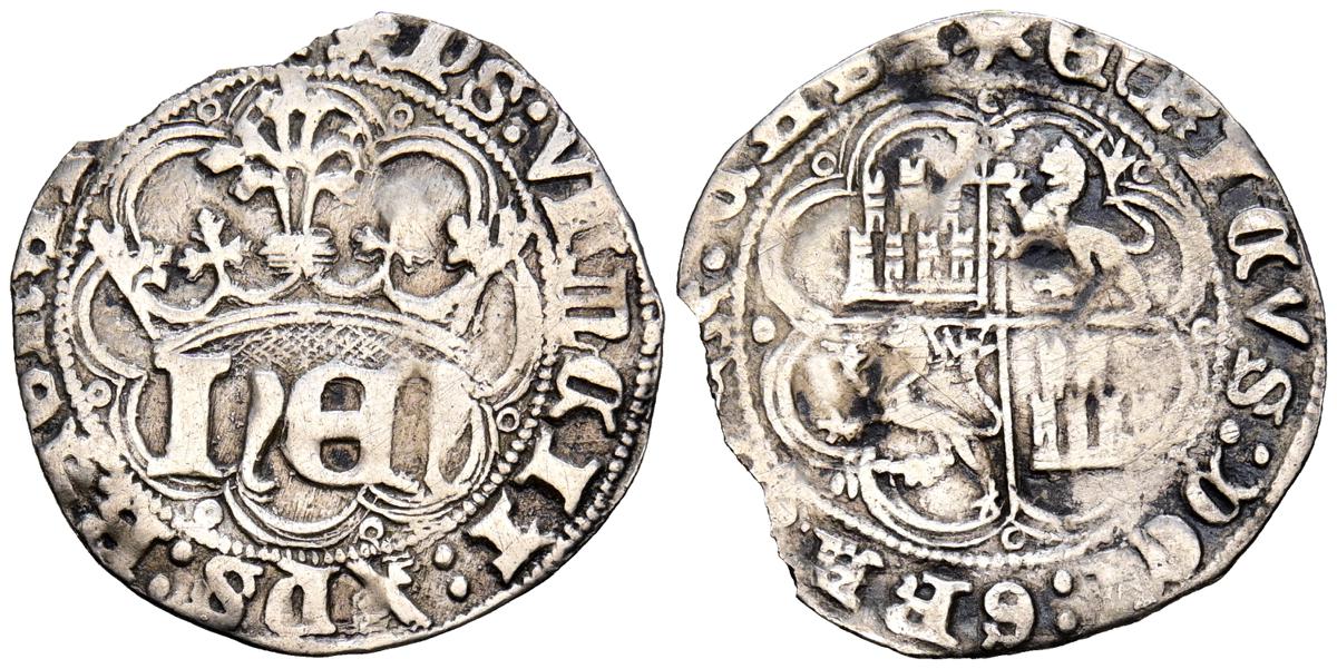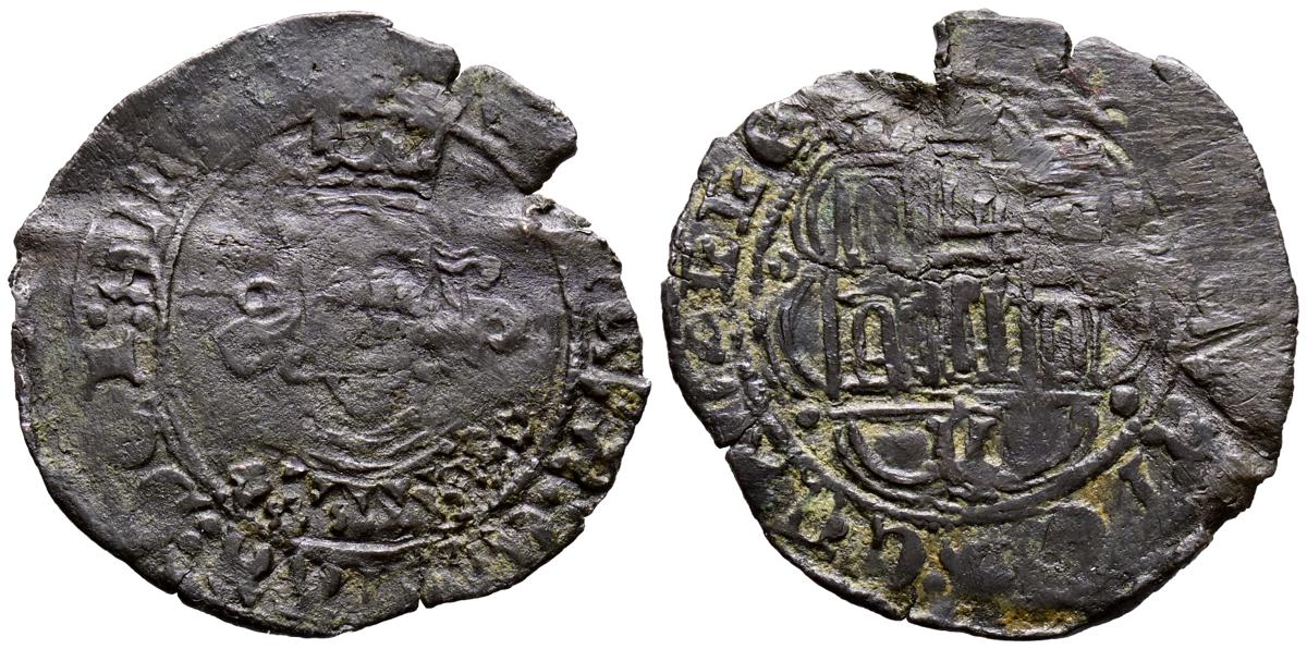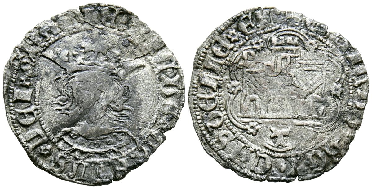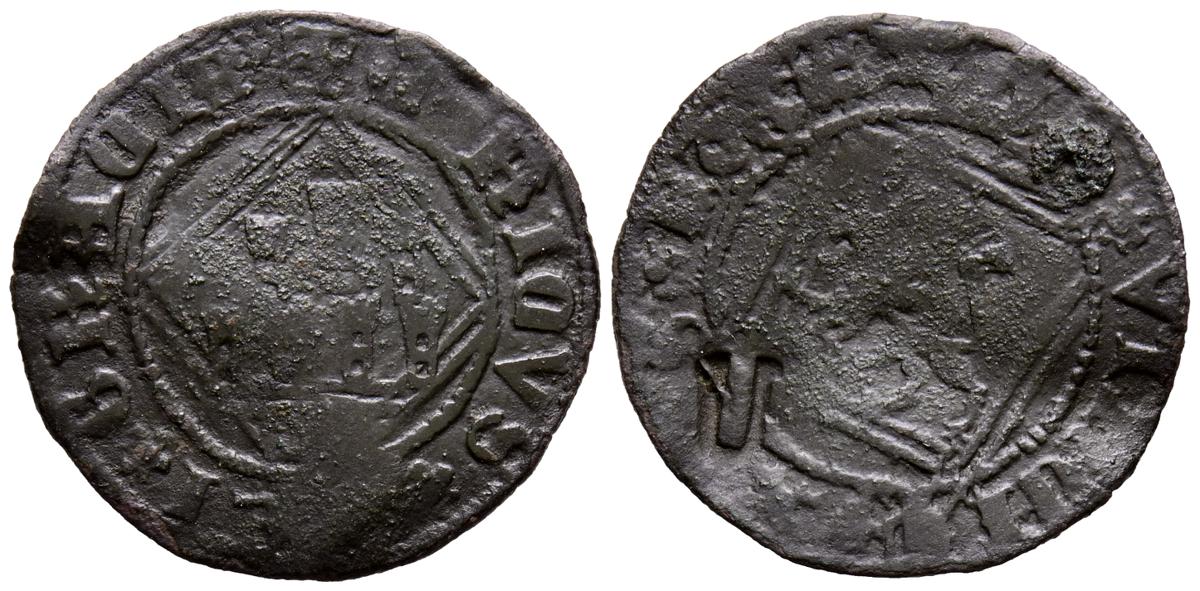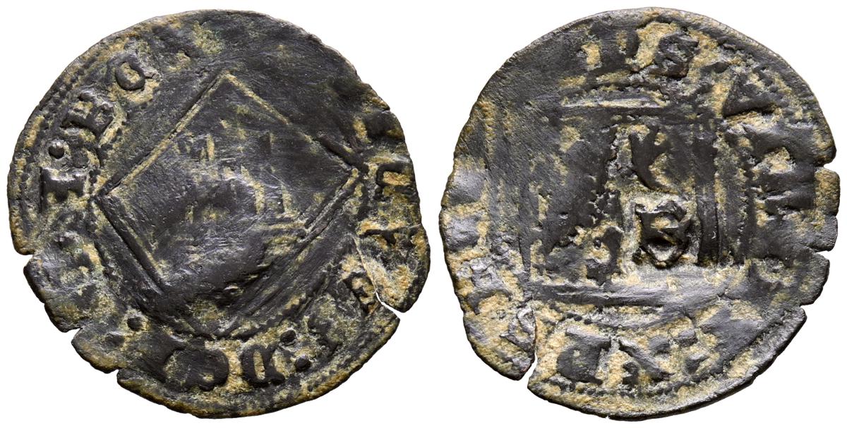 ENRIQUE IV (1454-1474). 1/2 Cuartillo falsario. (Ve. 1,50g/21mm). Sevilla. (Similar a Imperatrix E4:15.39; FAB-780.1). Anv: Busto coronado de Enrique IV de frente dentro de gráfila circular, alrededor leyenda: ENRICVS DEI GRACIA. Rev: Castillo, debajo: S, todo dentro a una doble gráfila circular, alrededor leyenda: ENRICVS CARTVS REX. MBC. Interesante y raro ejemplar que presenta una doble técnica de realización, en la que observamos que, mientras la corona está en positivo, el resto del retrato del monarca está inciso.