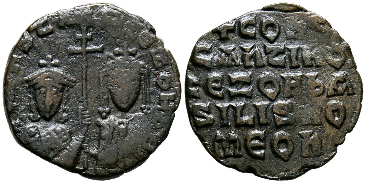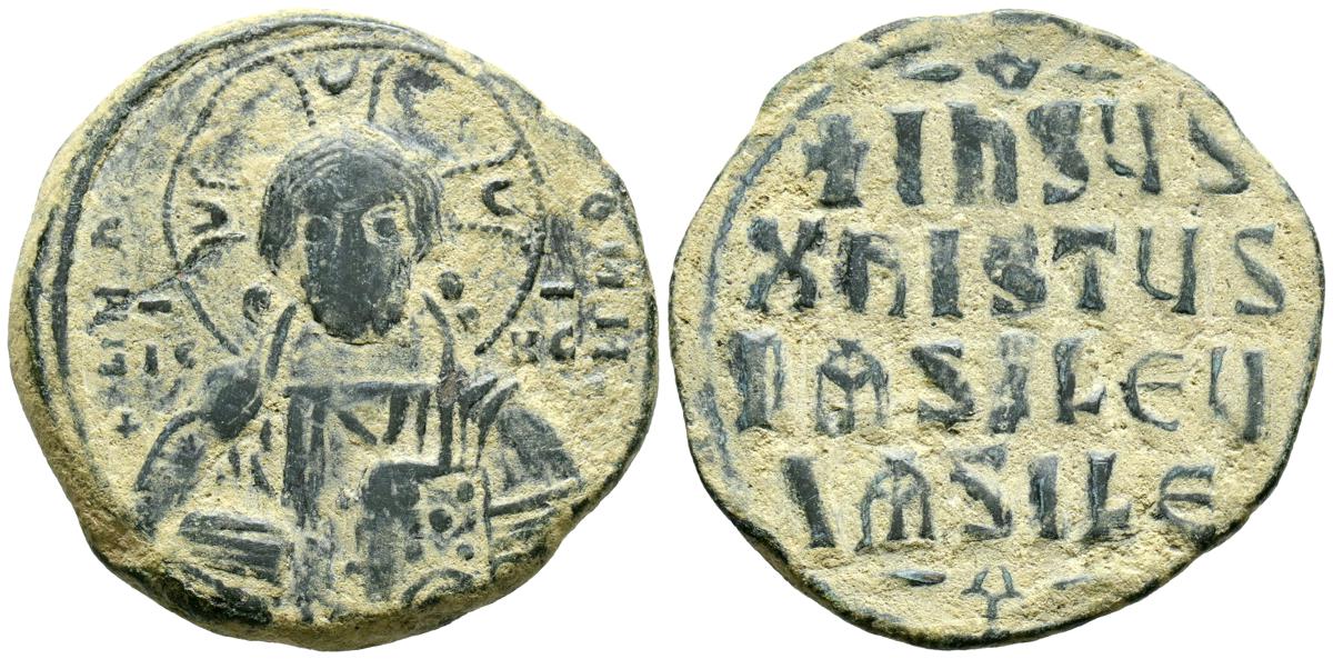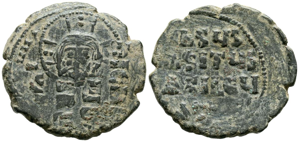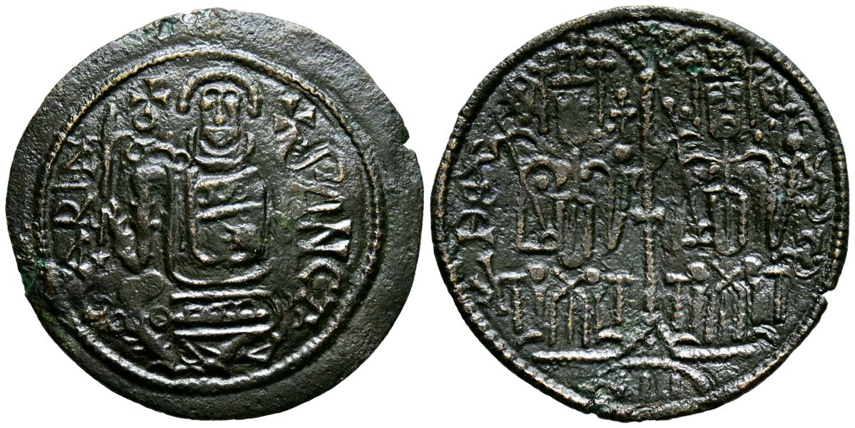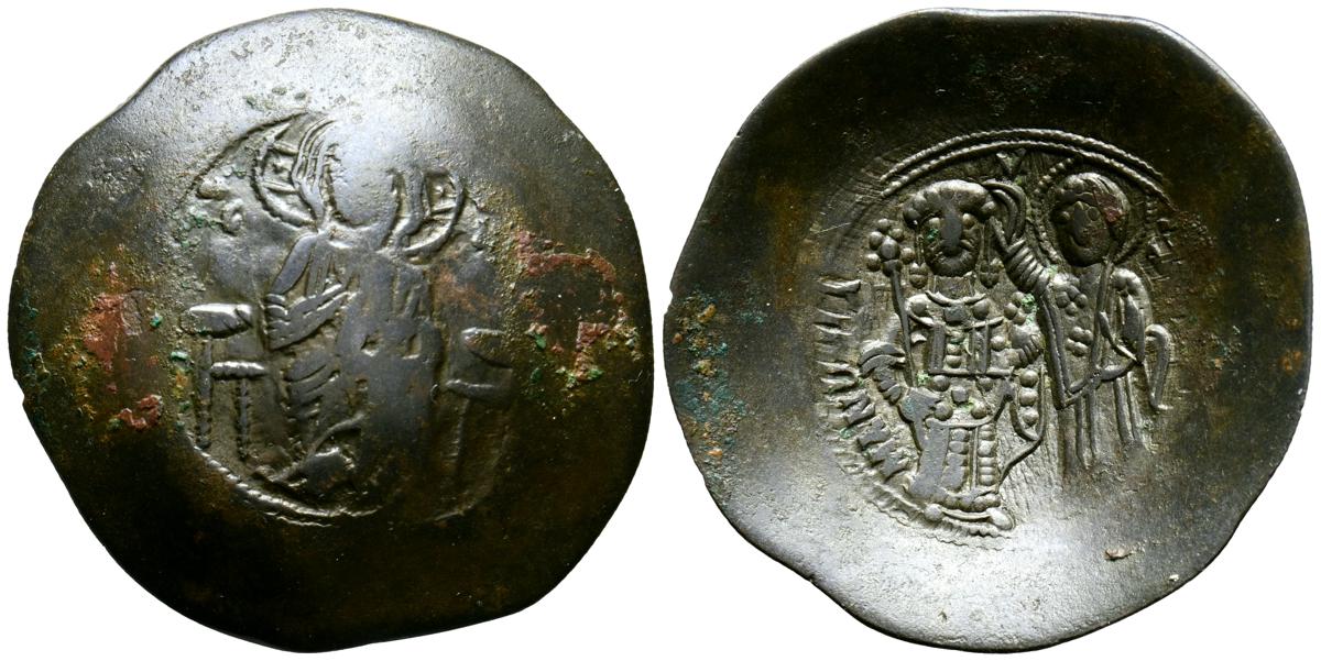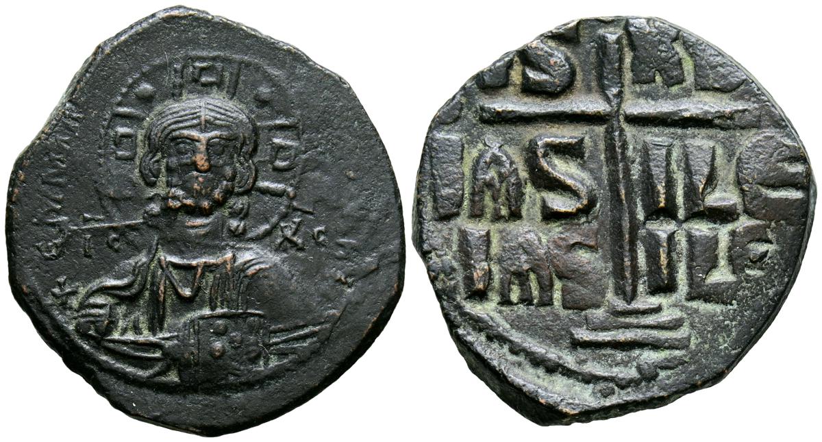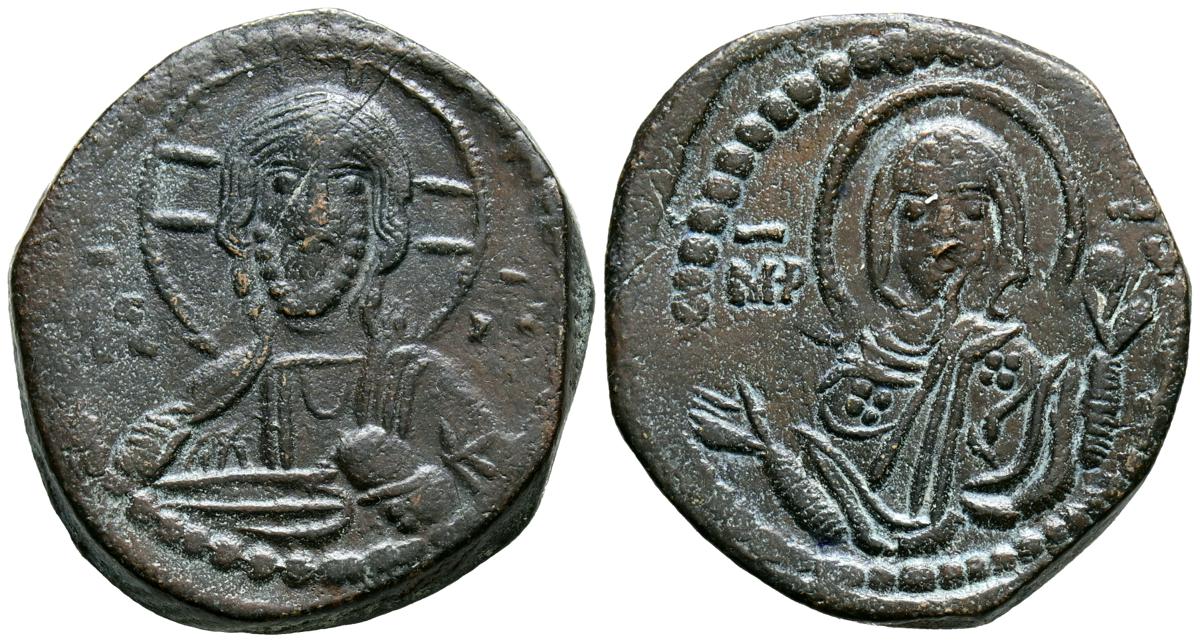 ANONIMO, atribuído a Romano IV. Follis. (Ae. 9,25g/27mm). 1068-1071 d.C. (Seaby 1867). Anv: Busto nímbado de Cristo de frente, vestido con túnica y himation, sosteniendo un pergamino, en campo: IC-XC. Rev: Busto nímbado de Virgen de frente y orante, en campo, MHP-TV. MBC.