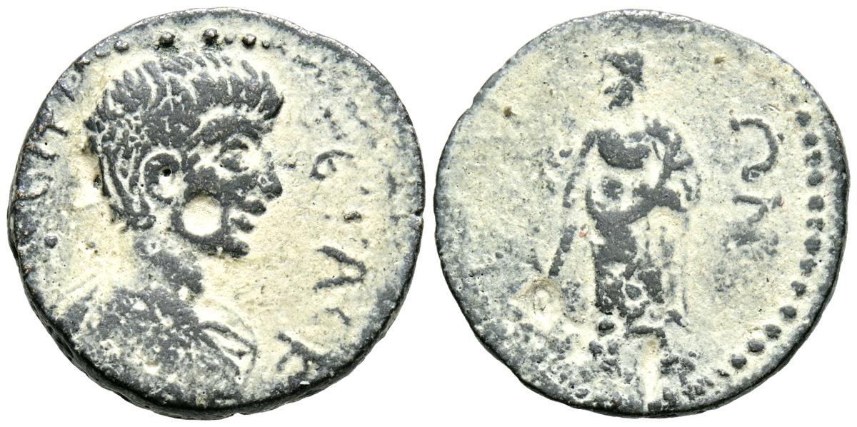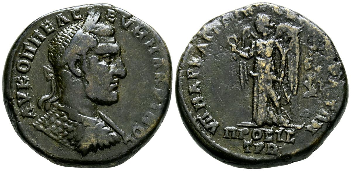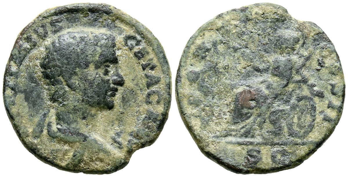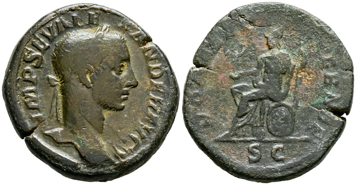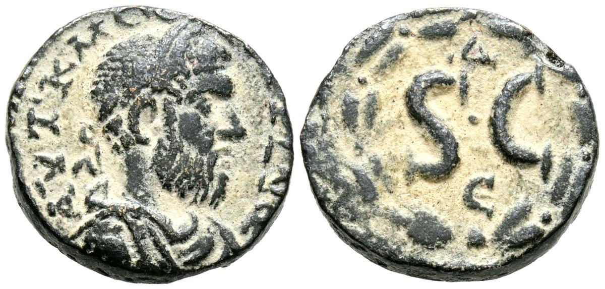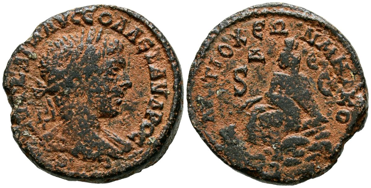 ALEJANDRO SEVERO. Octassarion. (Ae. 9,70g/25mm). 222-235 d.C. Asaria, Antioquía. (RPC 8086; McAlee 828). Anv: Cabeza laureada de Alejandro severo a derecha, alrededor leyenda: ΑΥΤΟ ΚΑΙϹ ΜΑΡ ΑΥΡ ϹЄ ΑΛЄΞΑΝΔΡ ϹЄΒ. Rev: Tyche sedente a la izquierda en la s rocas, sosteniendo la espiga de grano, a los pies, dios del río nadando a la izquierda, en campo: Δ-Є y S-C, alrededor leyenda: ΑΝΤΙΟXЄΩΝ ΜΗ Κ. MBC-.
