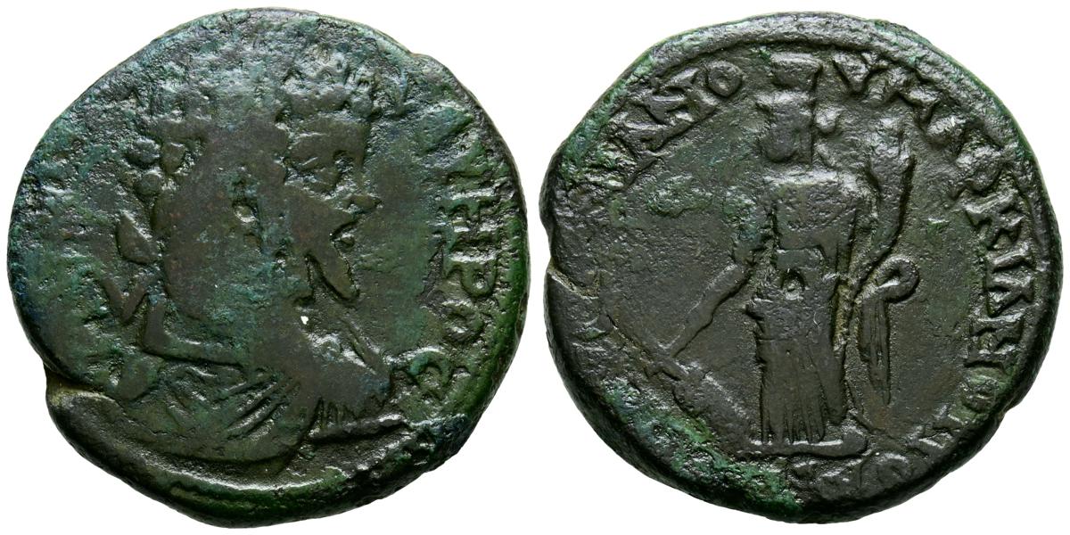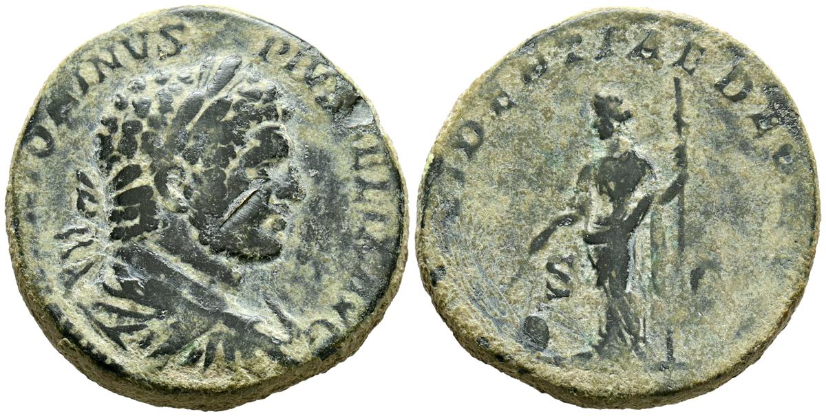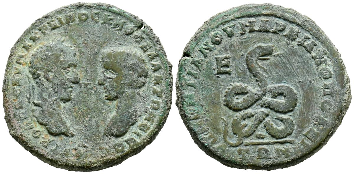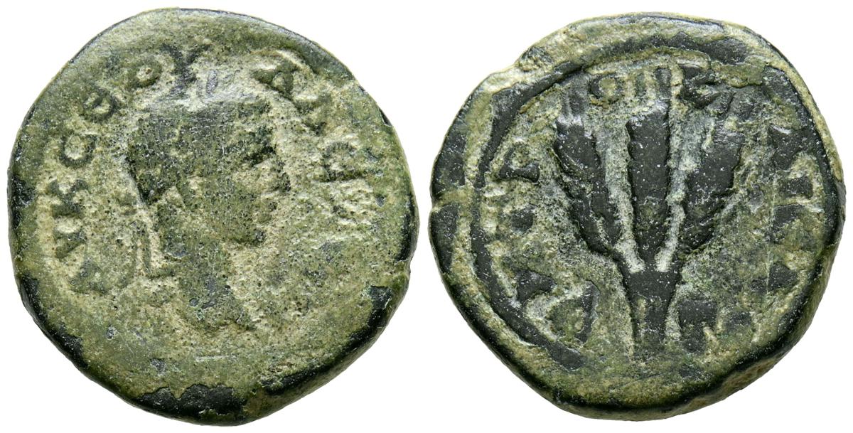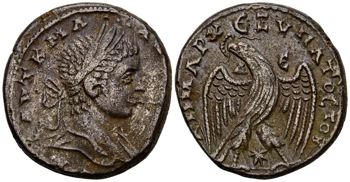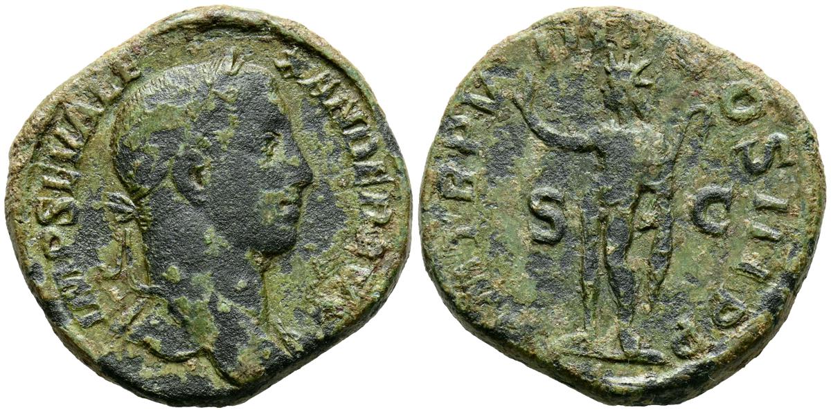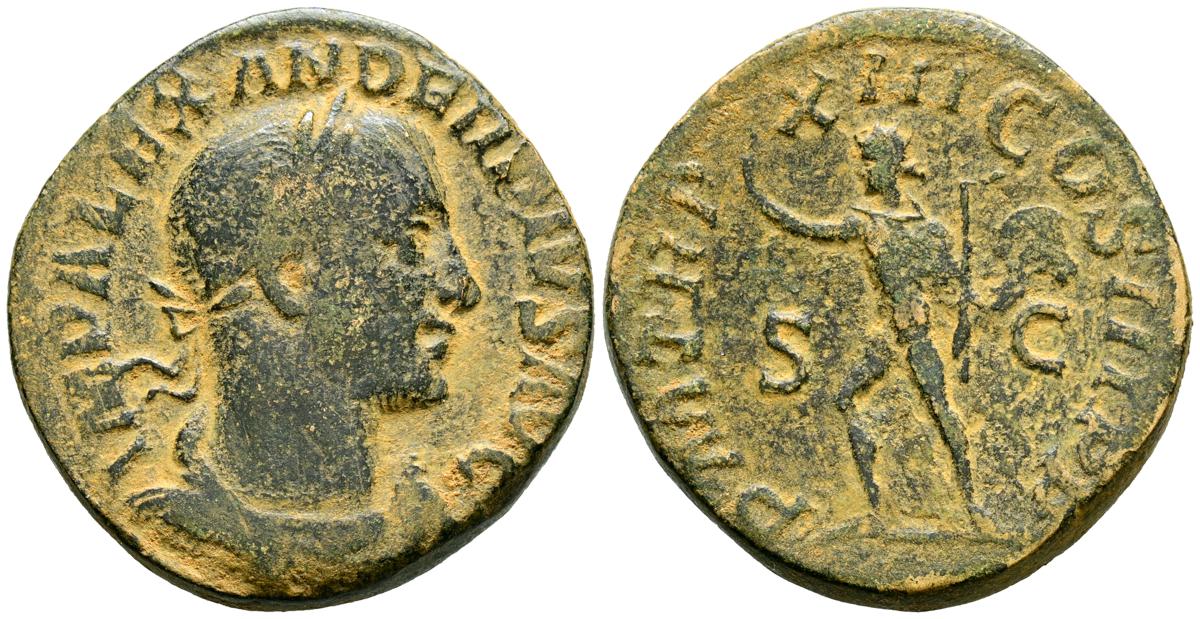 ALEJANDRO SEVERO. Octassarion. (Ae. 9,70g/25mm). 222-235 d.C. Asaria, Antioquía. (RPC 8086; McAlee 828). Anv: Cabeza laureada de Alejandro severo a derecha, alrededor leyenda: ΑΥΤΟ ΚΑΙϹ ΜΑΡ ΑΥΡ ϹЄ ΑΛЄΞΑΝΔΡ ϹЄΒ. Rev: Tyche sedente a la izquierda en la s rocas, sosteniendo la espiga de grano, a los pies, dios del río nadando a la izquierda, en campo: Δ-Є y S-C, alrededor leyenda: ΑΝΤΙΟXЄΩΝ ΜΗ Κ. MBC-.