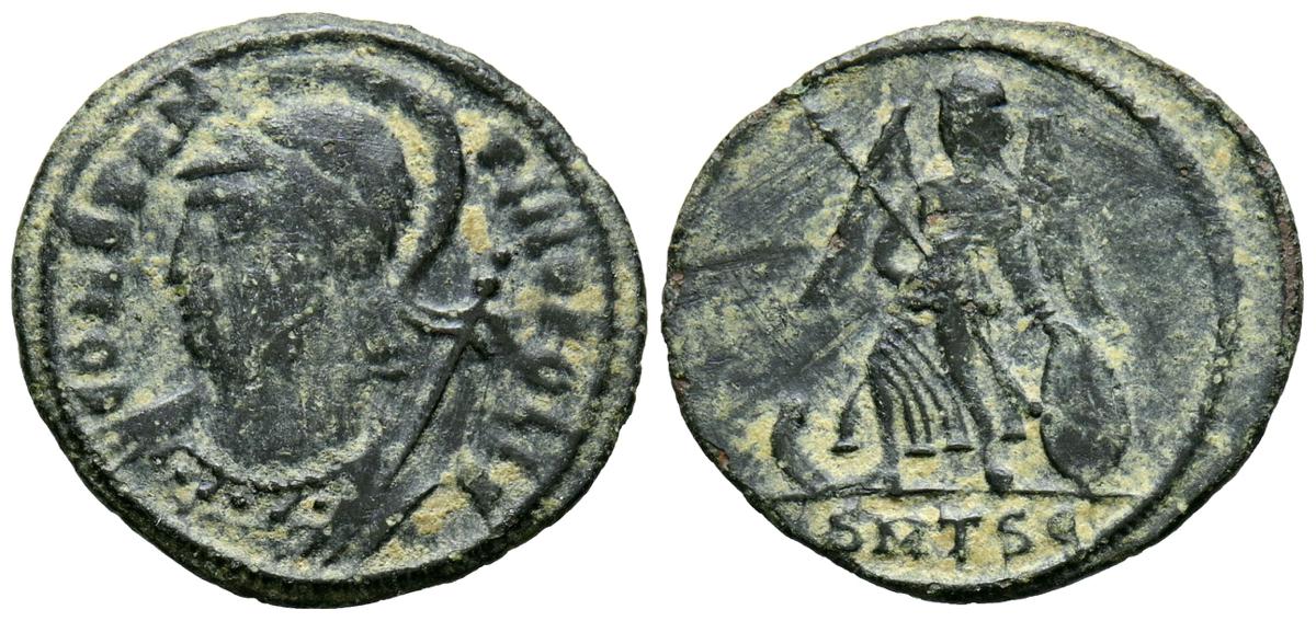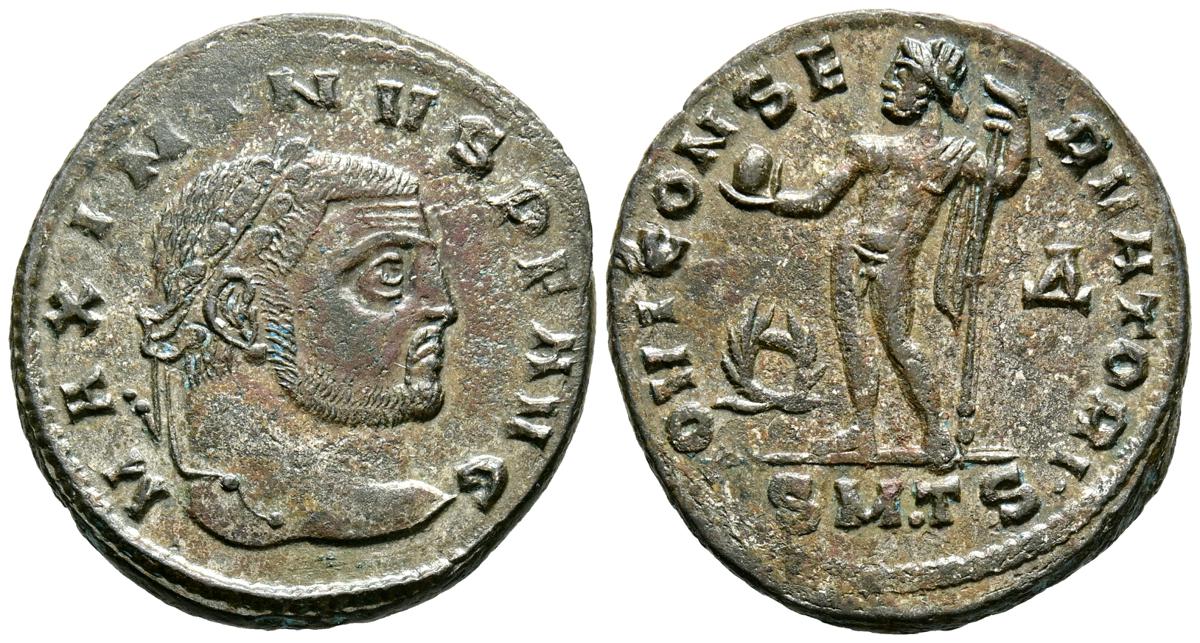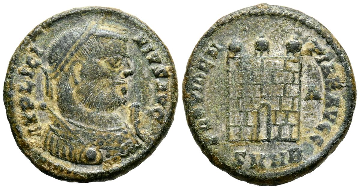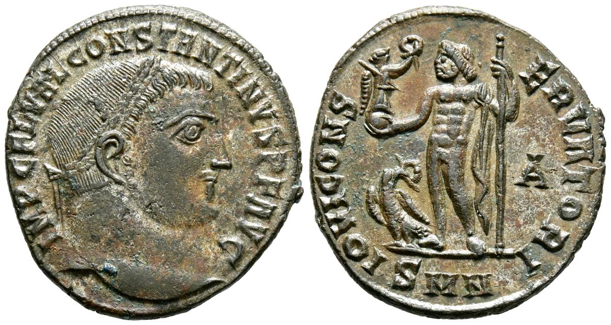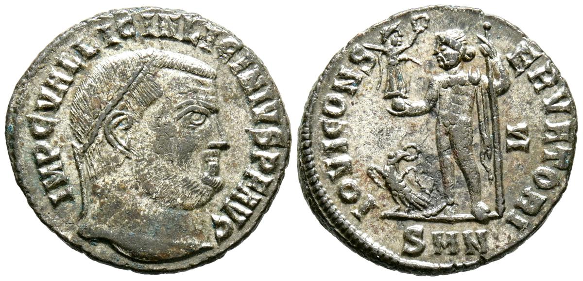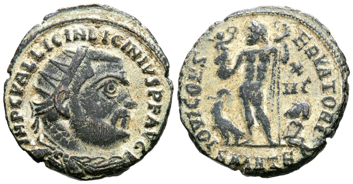LICINIO I. Follis. (Ae. 2,93g/19mm). 321-324 d.C. Alejandría. (RIC 28). Anv: Busto radiado, drapeado y con coraza de Licinio I a derecha, alrededor leyenda: IMP C VAL LICIN LICINIVS P F AVG. Rev: Júpiter estante a izquierda portando Victoria con corona de laurel y cetro, detrás cautivo, delante águila con corona de laurel, en campo: X/IIr, en exergo: SMKA, alrededor leyenda: IOVI CONSERVATORI. MBC+.