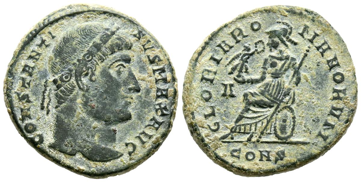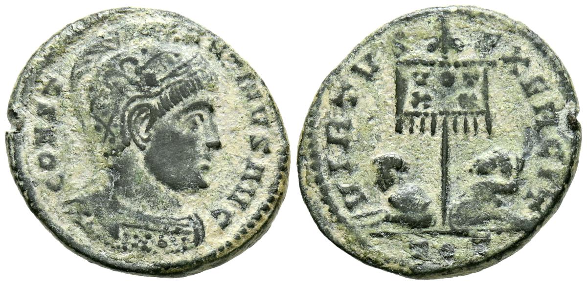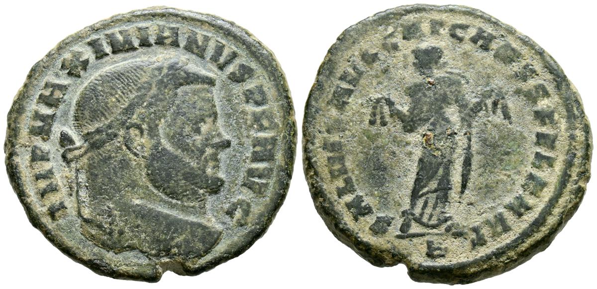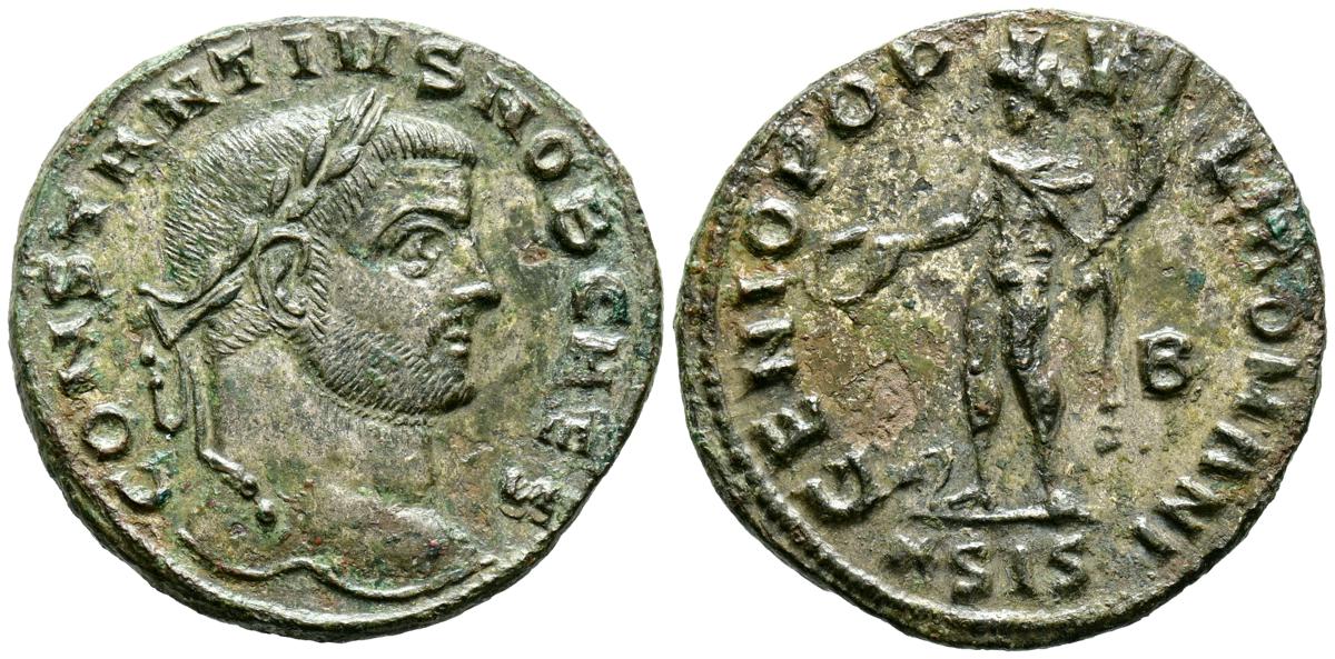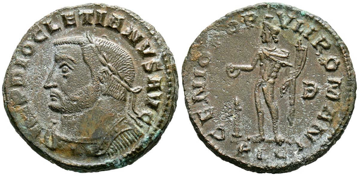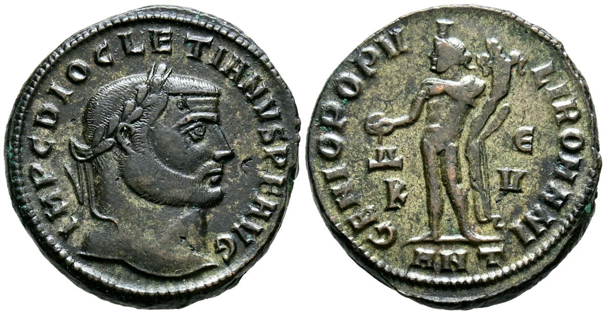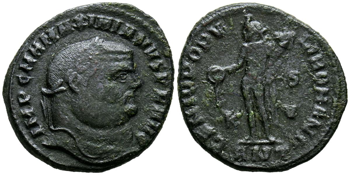 LICINIO I. Follis. (Ae. 2,93g/19mm). 321-324 d.C. Alejandría. (RIC 28). Anv: Busto radiado, drapeado y con coraza de Licinio I a derecha, alrededor leyenda: IMP C VAL LICIN LICINIVS P F AVG. Rev: Júpiter estante a izquierda portando Victoria con corona de laurel y cetro, detrás cautivo, delante águila con corona de laurel, en campo: X/IIr, en exergo: SMKA, alrededor leyenda: IOVI CONSERVATORI. MBC+.