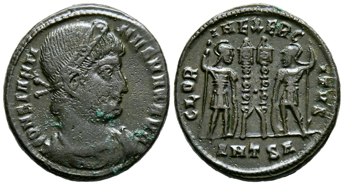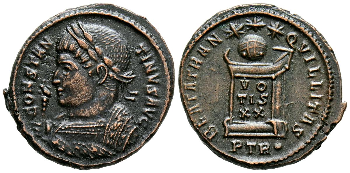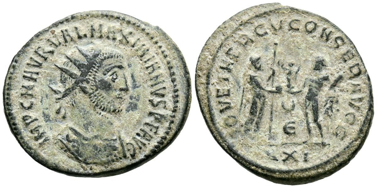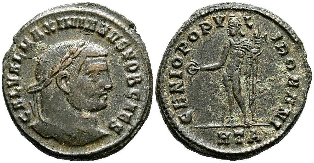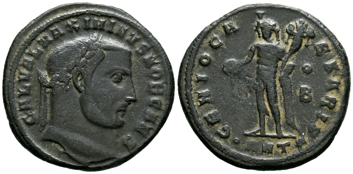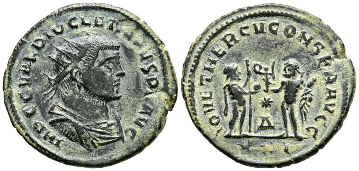 LICINIO I. Follis. (Ae. 2,93g/19mm). 321-324 d.C. Alejandría. (RIC 28). Anv: Busto radiado, drapeado y con coraza de Licinio I a derecha, alrededor leyenda: IMP C VAL LICIN LICINIVS P F AVG. Rev: Júpiter estante a izquierda portando Victoria con corona de laurel y cetro, detrás cautivo, delante águila con corona de laurel, en campo: X/IIr, en exergo: SMKA, alrededor leyenda: IOVI CONSERVATORI. MBC+.