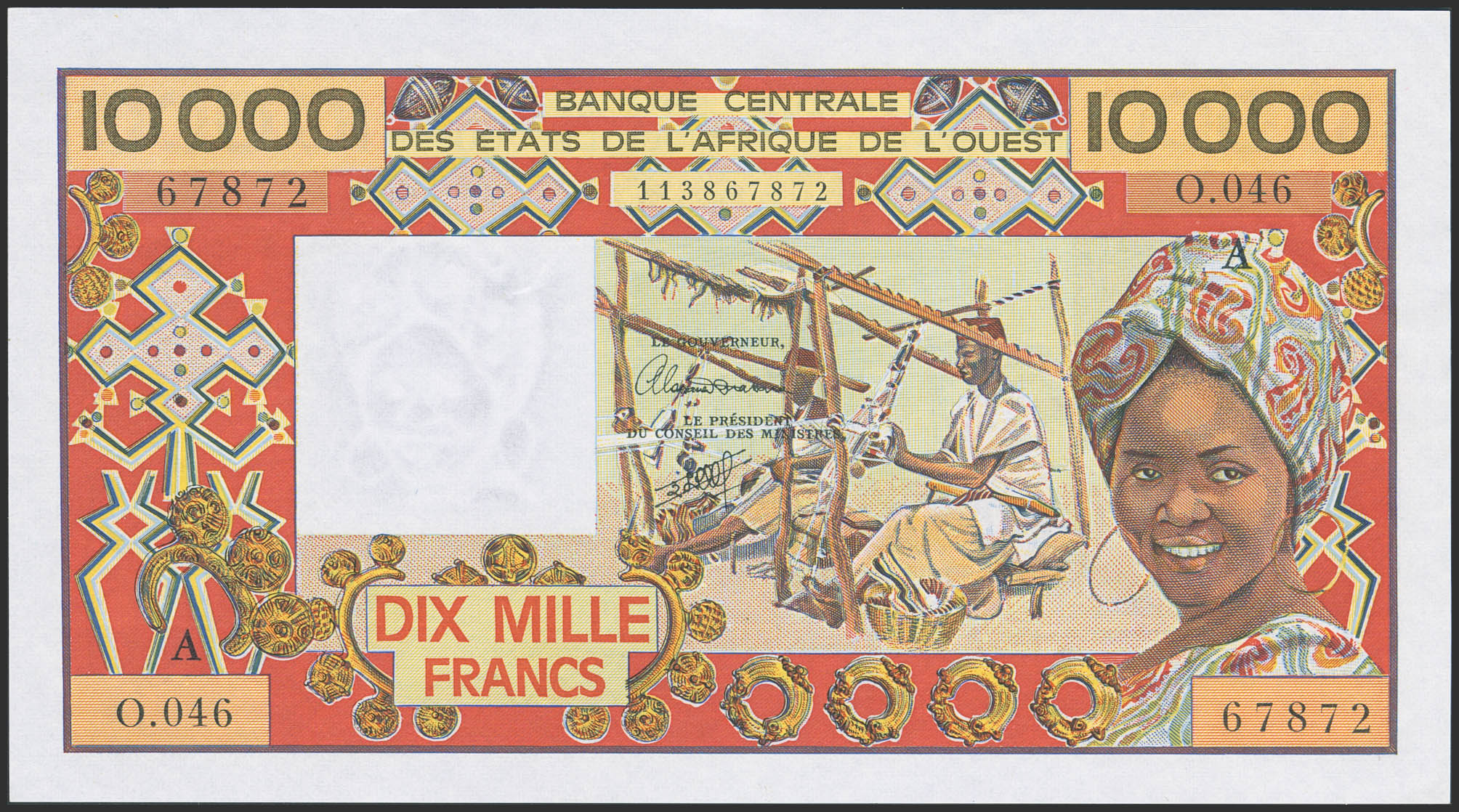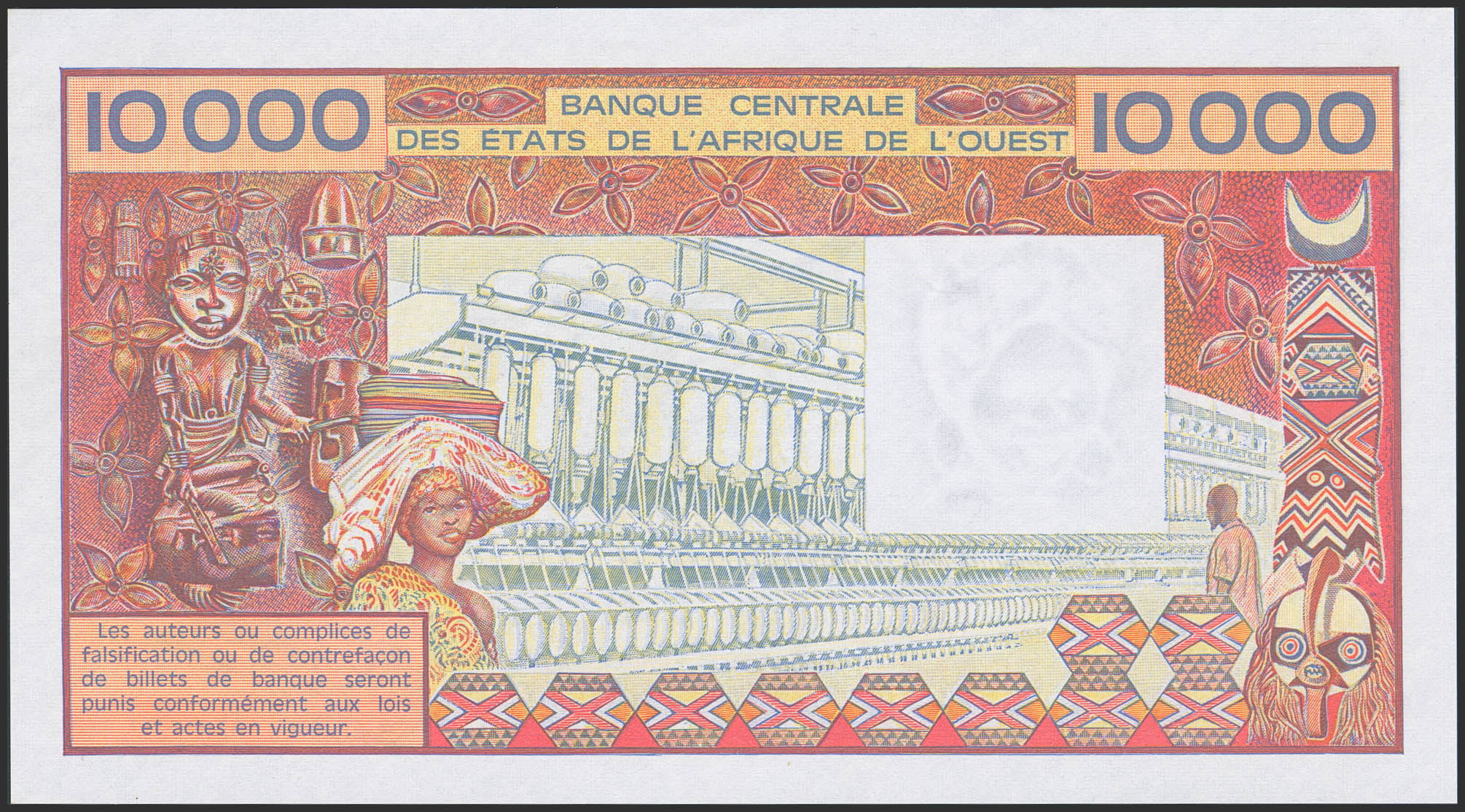 WEST AFRICAN STATES. 10000 Francs. (1977ca). Banque Centrale des Etats de l'Afrique de l'Ouest. Ivory Coast. (Pick: 109Aj). Handling marks. Almost Uncirculated.
