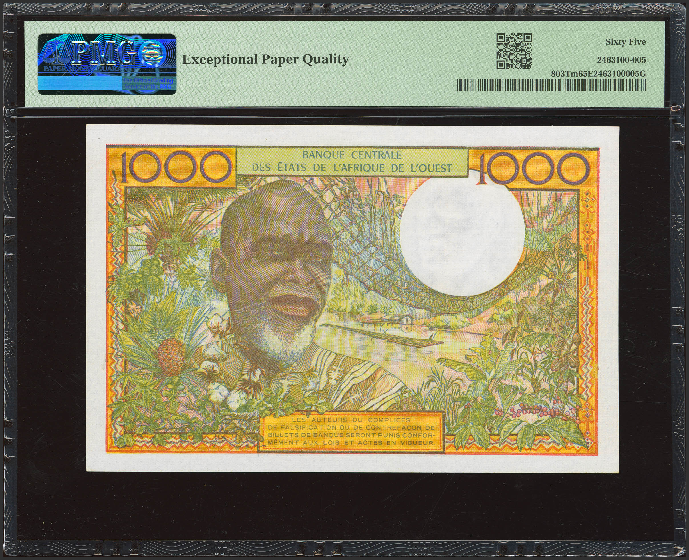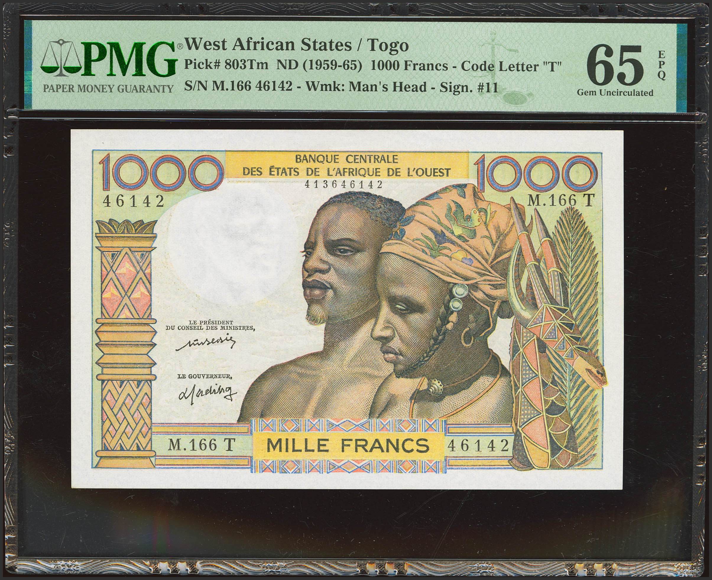 WEST AFRICAN STATES. 1000 Francs. (1960ca). Banque Centrale des Etats de l'Afrique de l'Ouest. Togo. Signatures of H. C. Bedie and A. Fadiga. (Pick: 803Tm). PMG65EPQ.