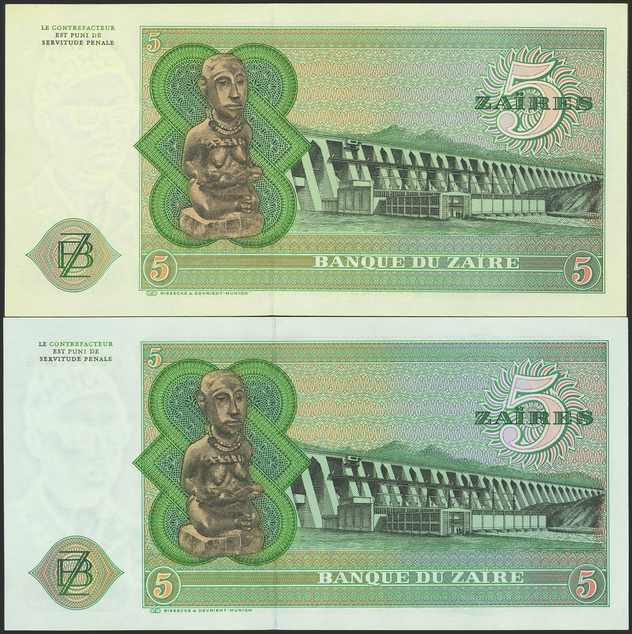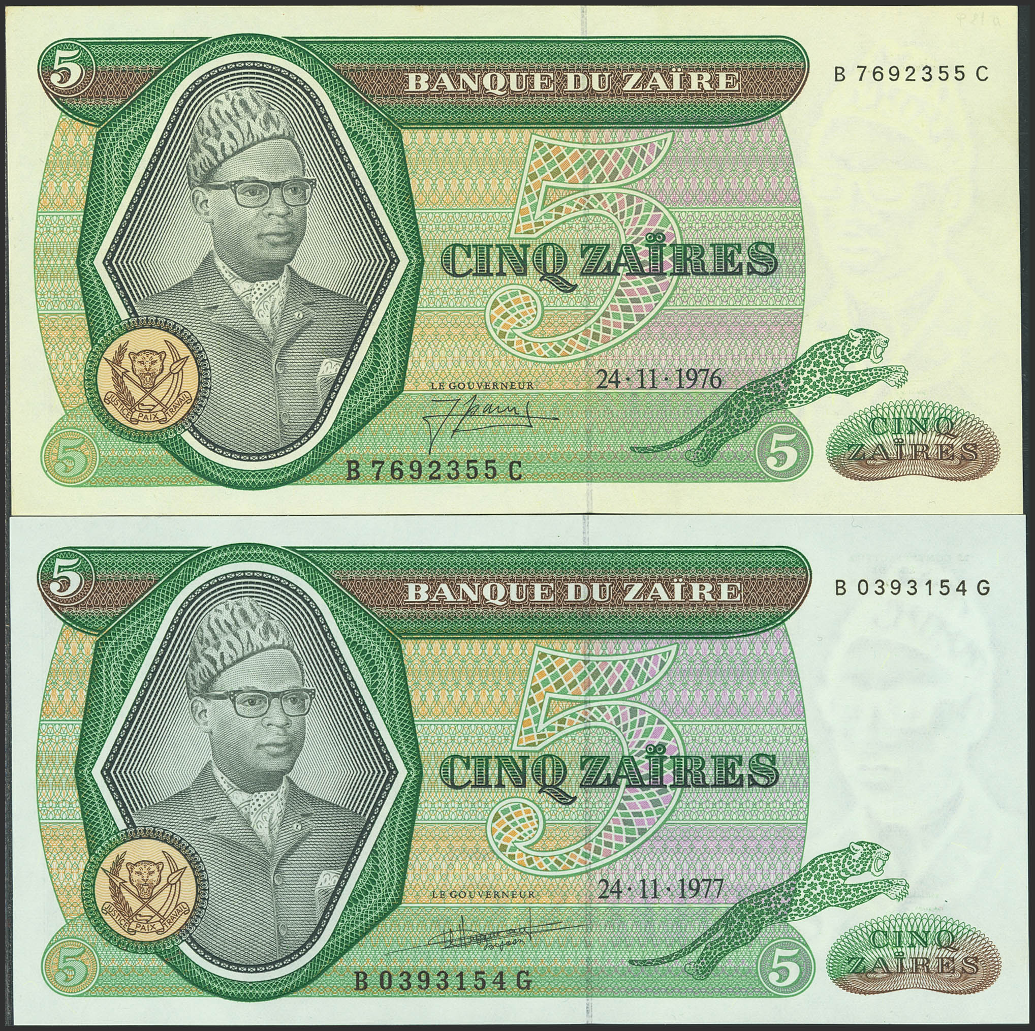 ZAIRE. Lot of 2 notes of 5 Zaires. 24 November 1976 and 197. Banque du Zaire. (Pick: 21a, 21b). Less than Uncirculated and Uncirculated.