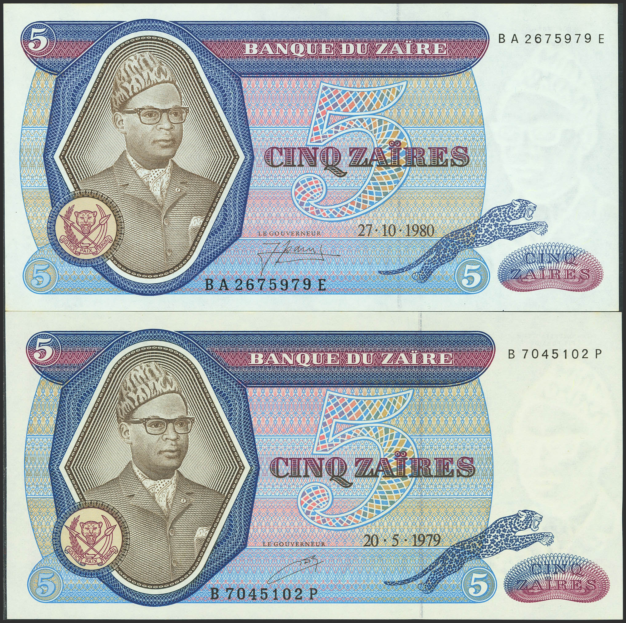 ZAIRE. Lot of 2 notes of 5 Zaires. 20 May 1979 and 27 October 1980. Banque du Zaire. (Pick: 22a, 22b). Uncirculated and Less than Uncirculated.