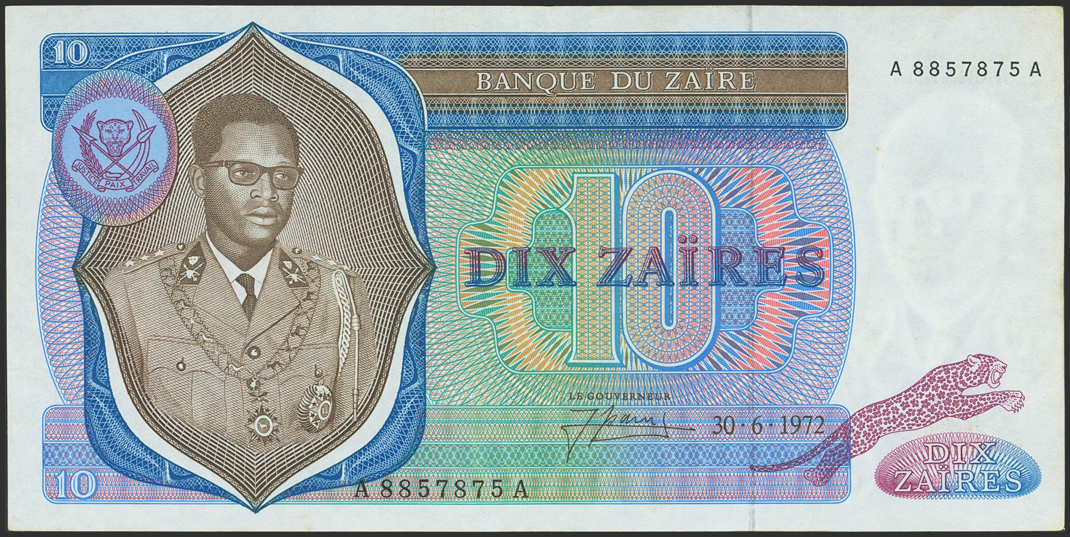 ZAIRE. 10 Zaires. 30 June 1972. Banque du Zaire. (Pick: 23a). More than Extremely Fine.