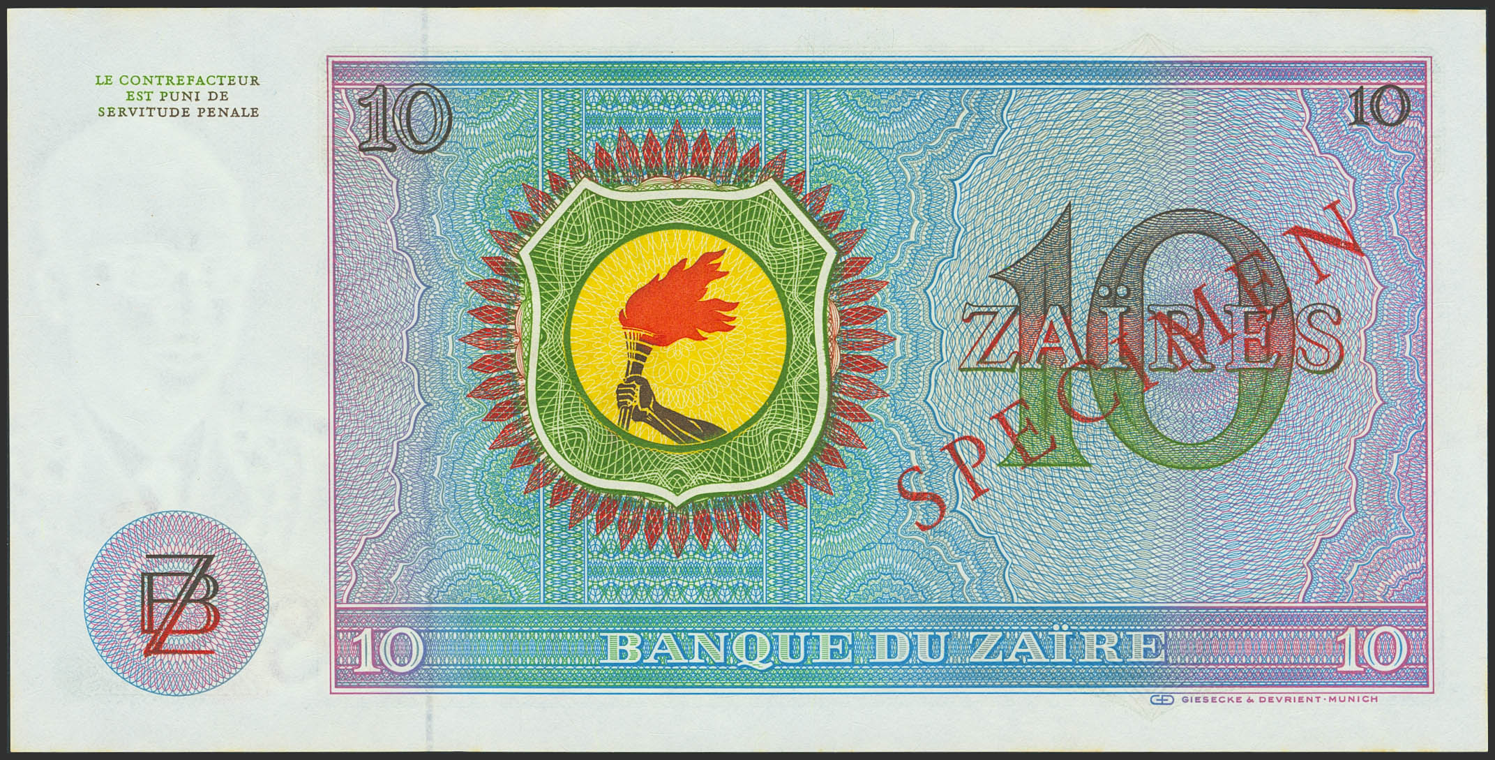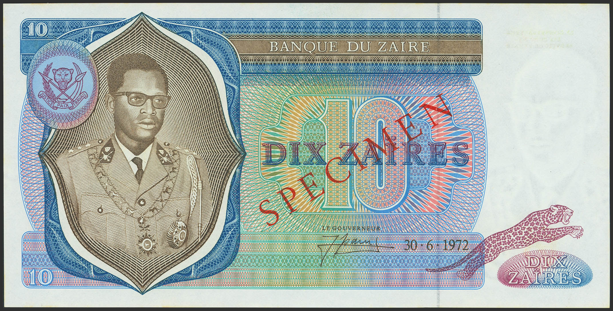 ZAIRE. 10 Zaires. 30 June 1972. Banque du Zaire. Specimen. (Pick: 23s). Uncirculated.