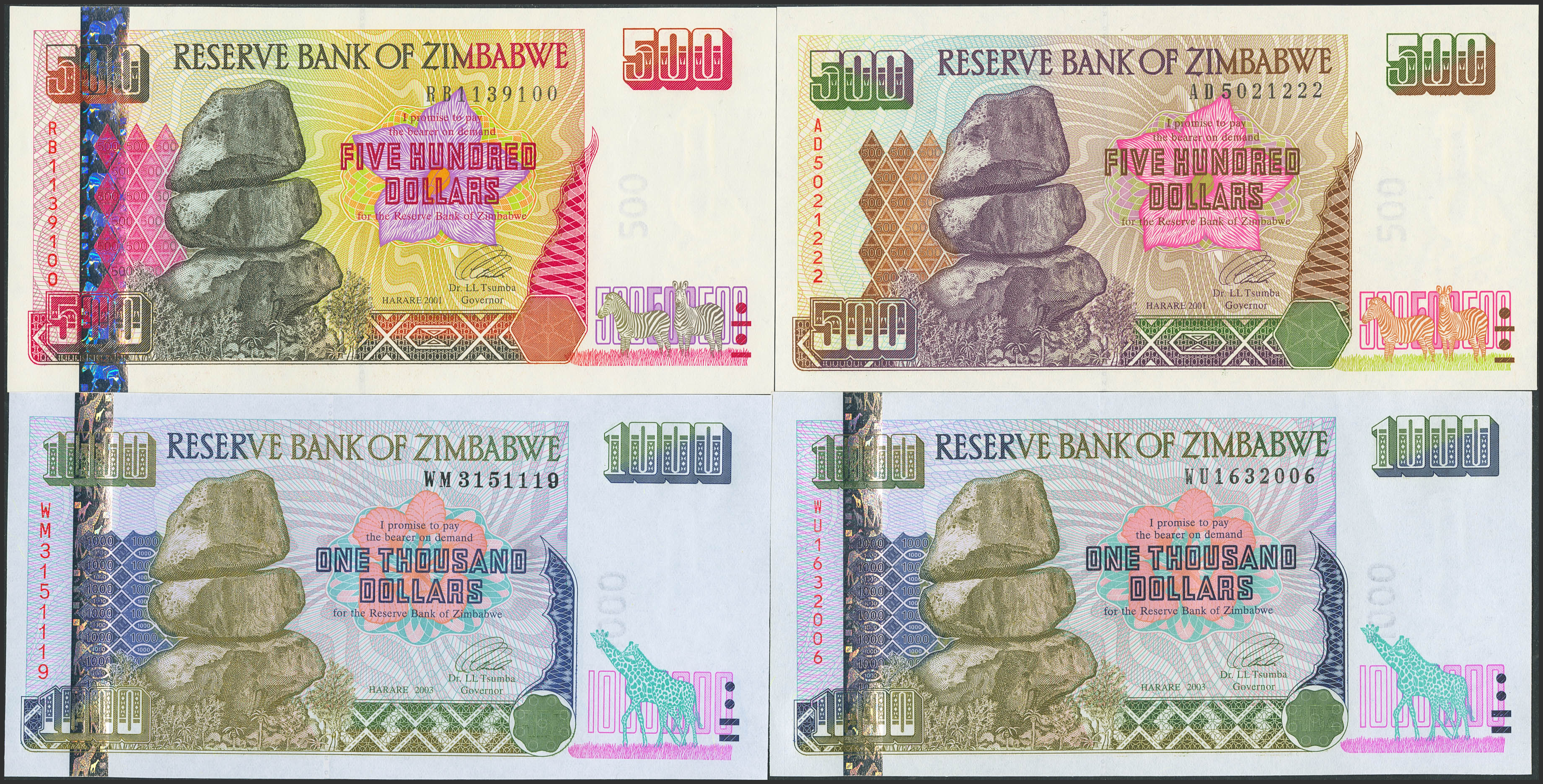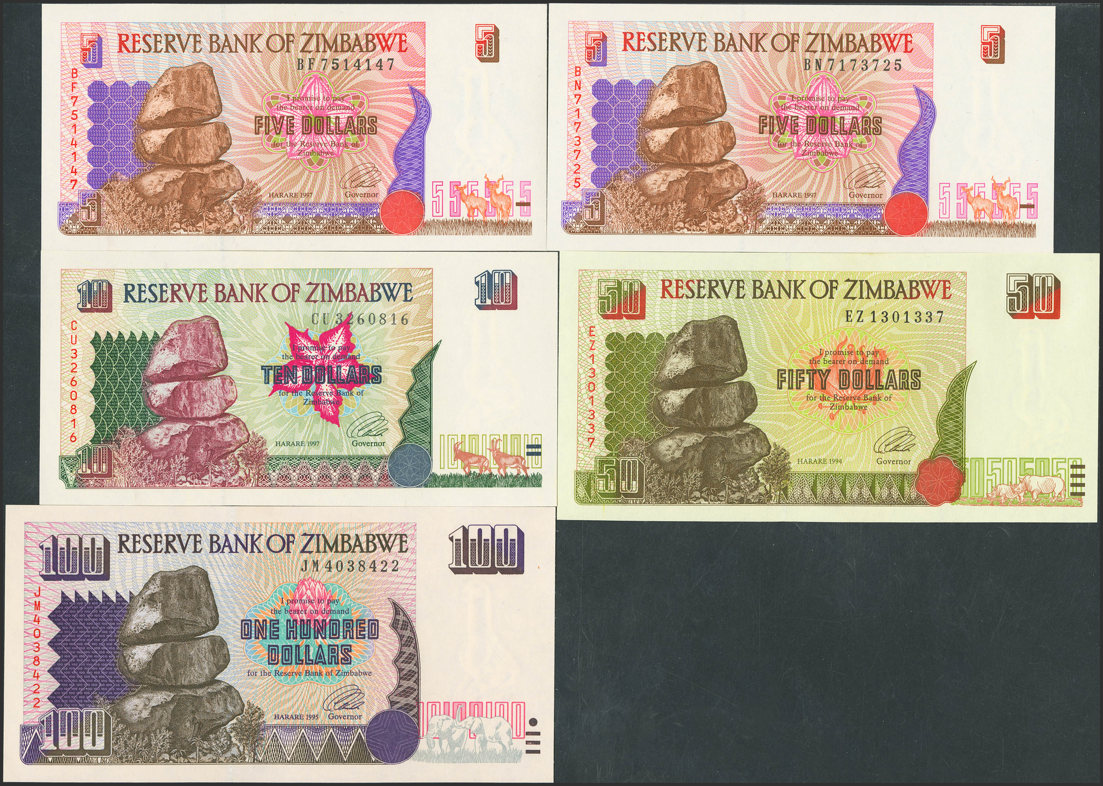 ZIMBABWE. Lot of 9 notes from 5 to 1000 dollars, except for the 20 dollar note which is missing. 1997 to 2003. Reserve Bank. (Pick: 5a(2), 6a, 8a, 9a, 10a, 11a, 12a, 12b). Uncirculated.