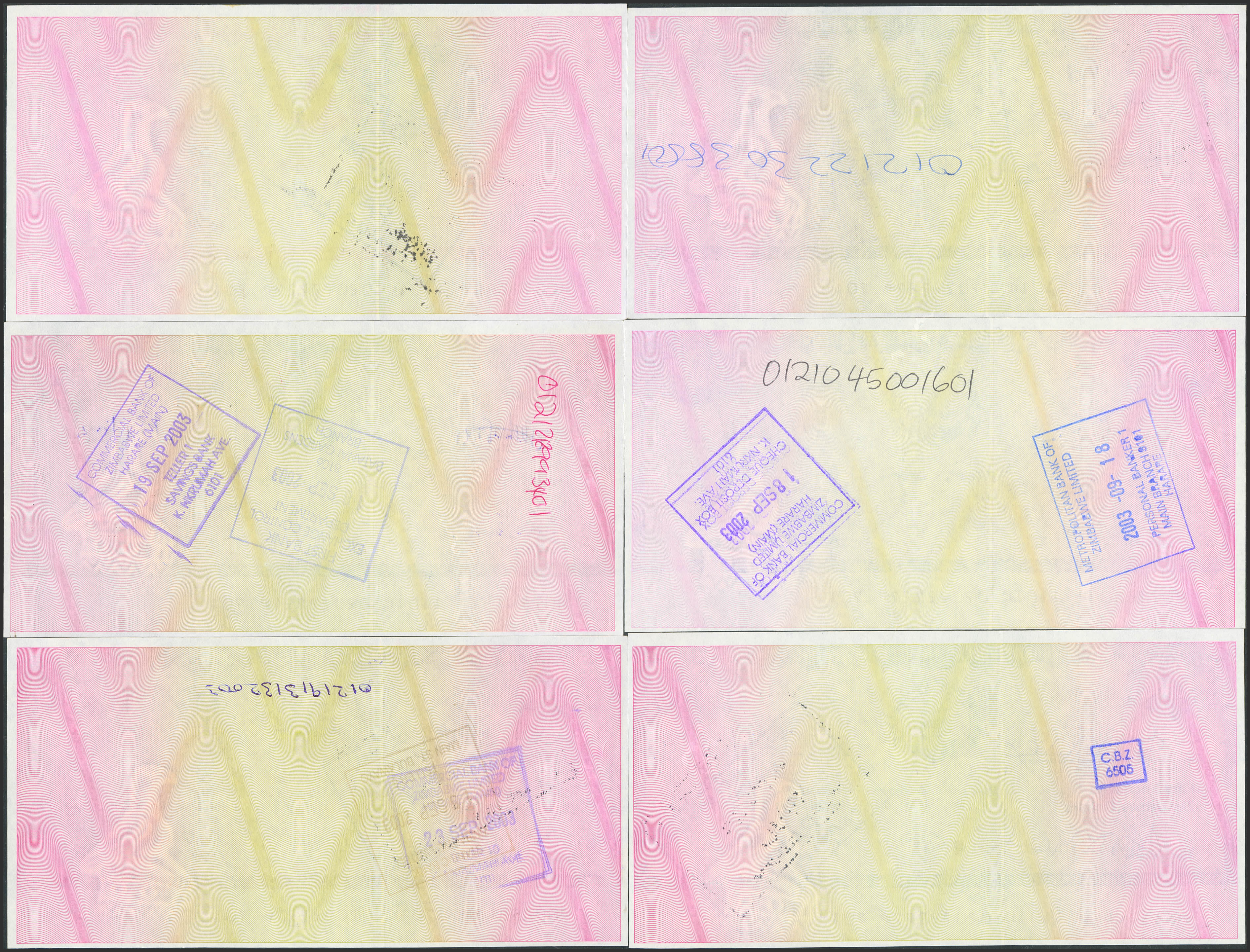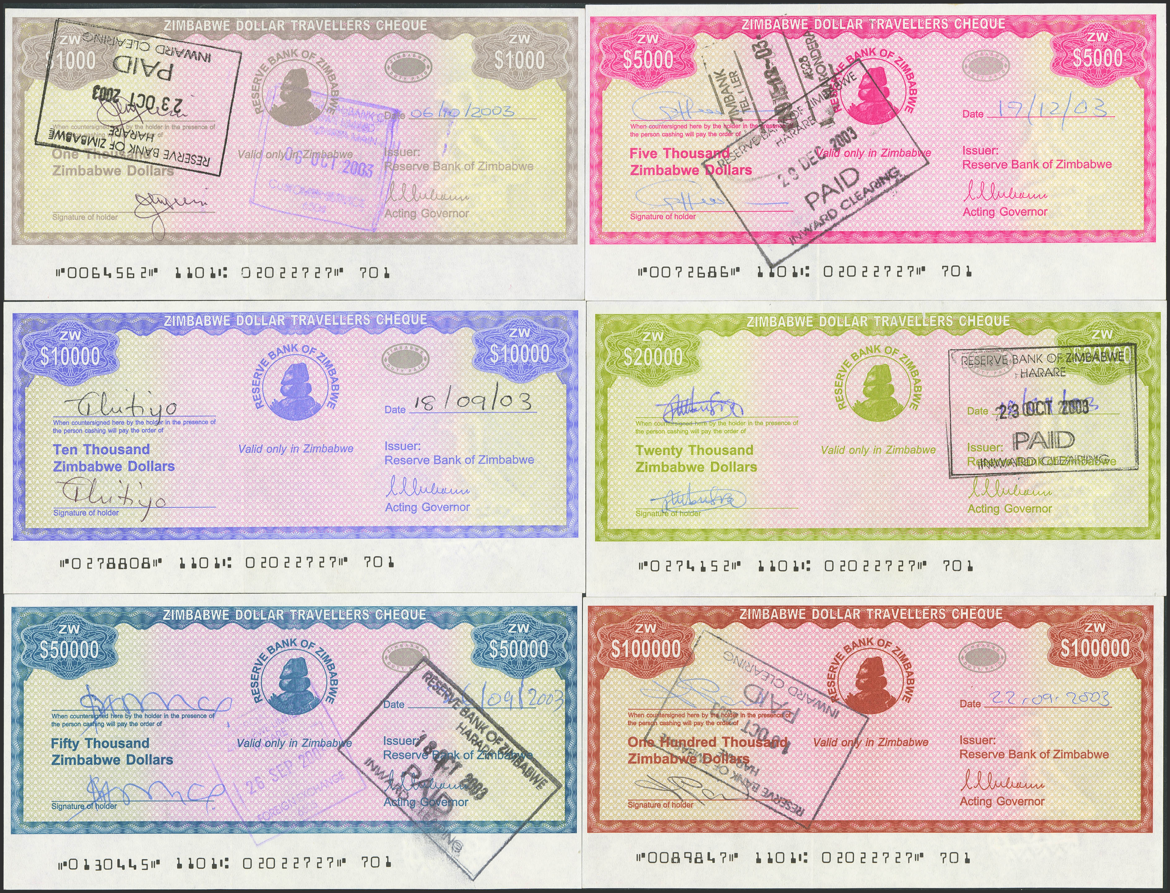 ZIMBABWE. Complete set of 6 notes from 1000 to 100000 Dollars. (2003ca). Reserve Bank. Travellers Cheques, issued due to shortage of regular paper money. (Pick: 15, 16, 17, 18, 19, 20). All filled out and signed, and all stamped except for one that is not. Less than Uncirculated to Uncirculated.