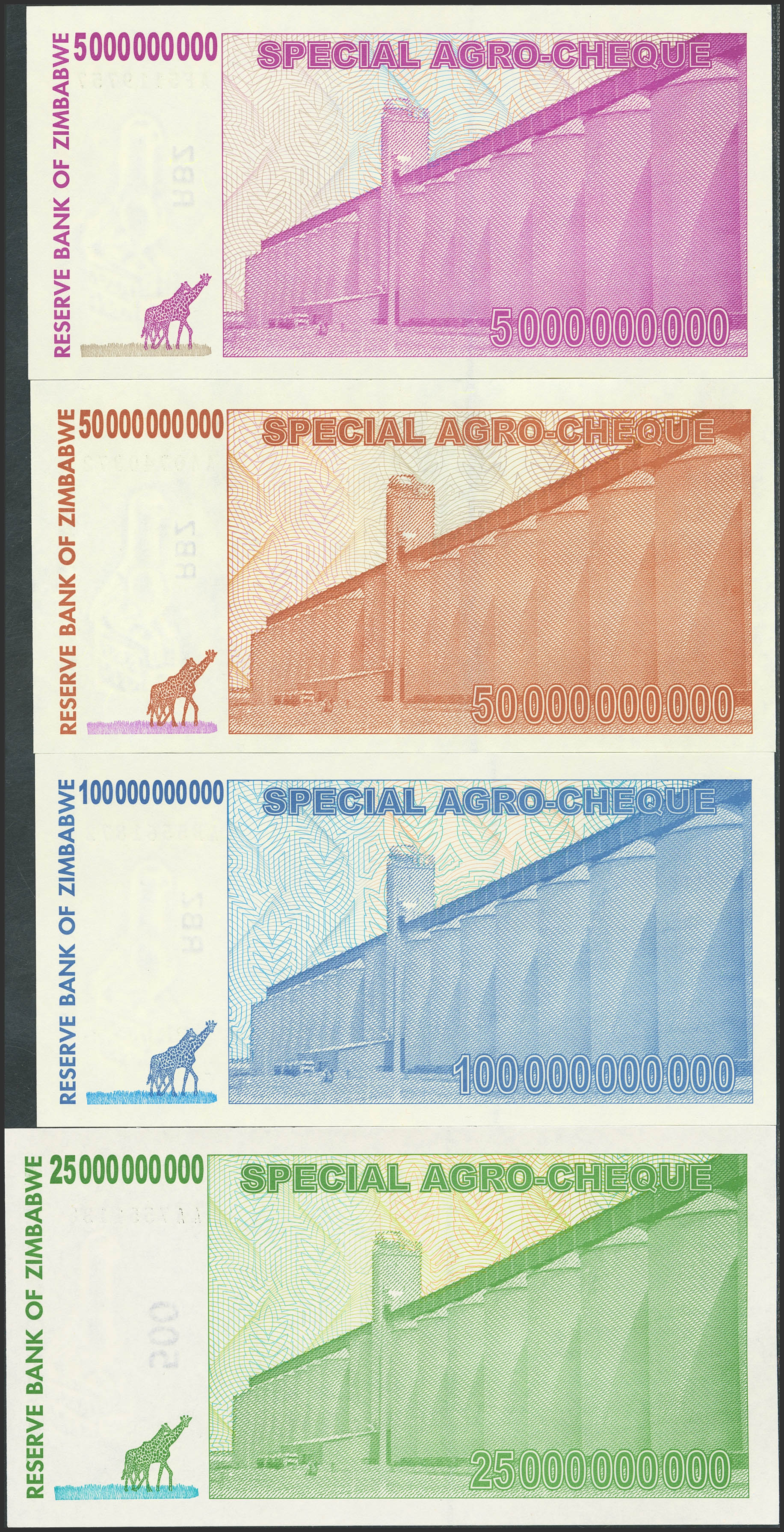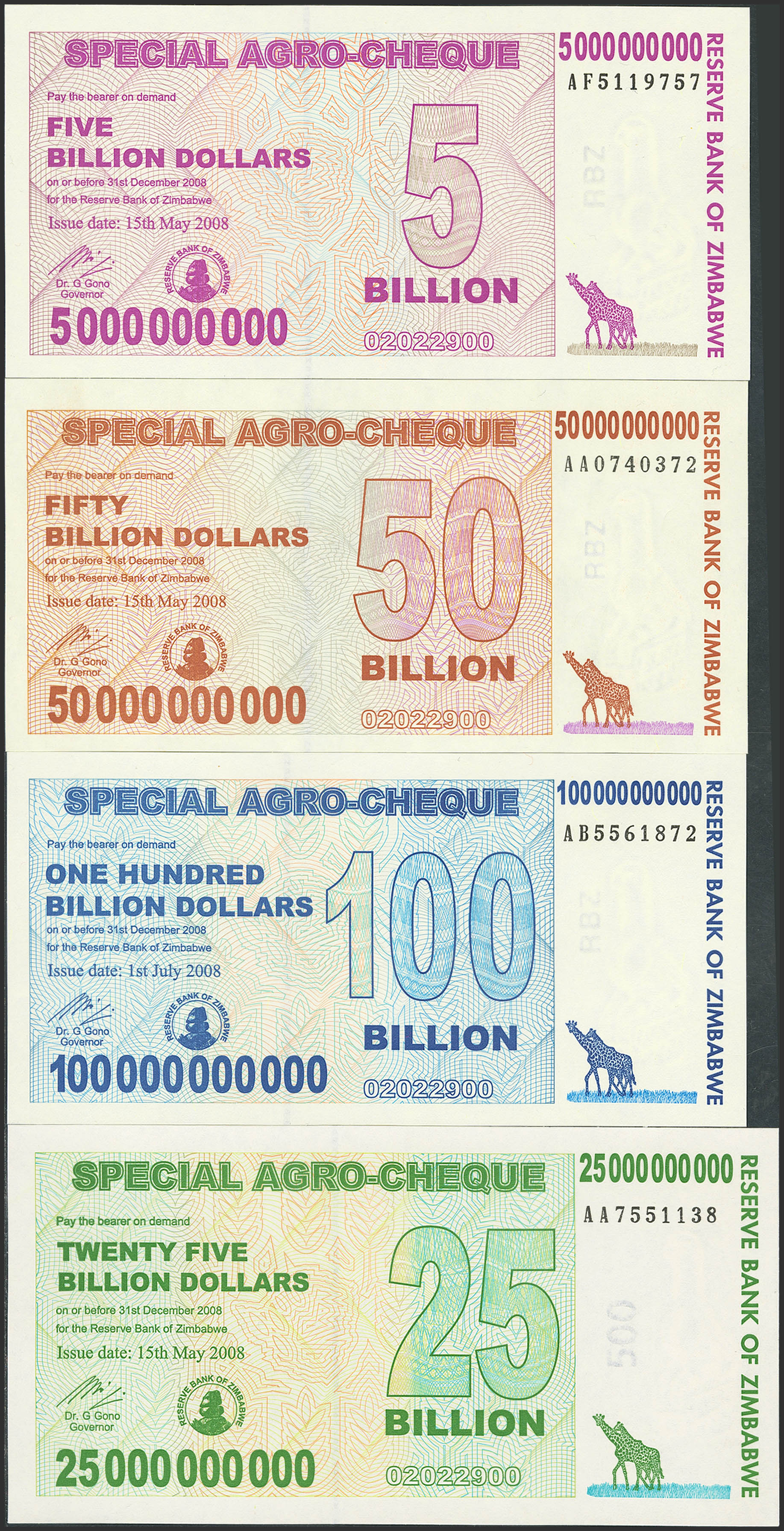 ZIMBABWE. Complete set of 4 notes from 5 to 100 Billion Dollars. 2008. Reserve Bank. Special Agro-Cheques. (Pick: 61, 62, 63, 64). Uncirculated (2) and Less than uncirculated (2).