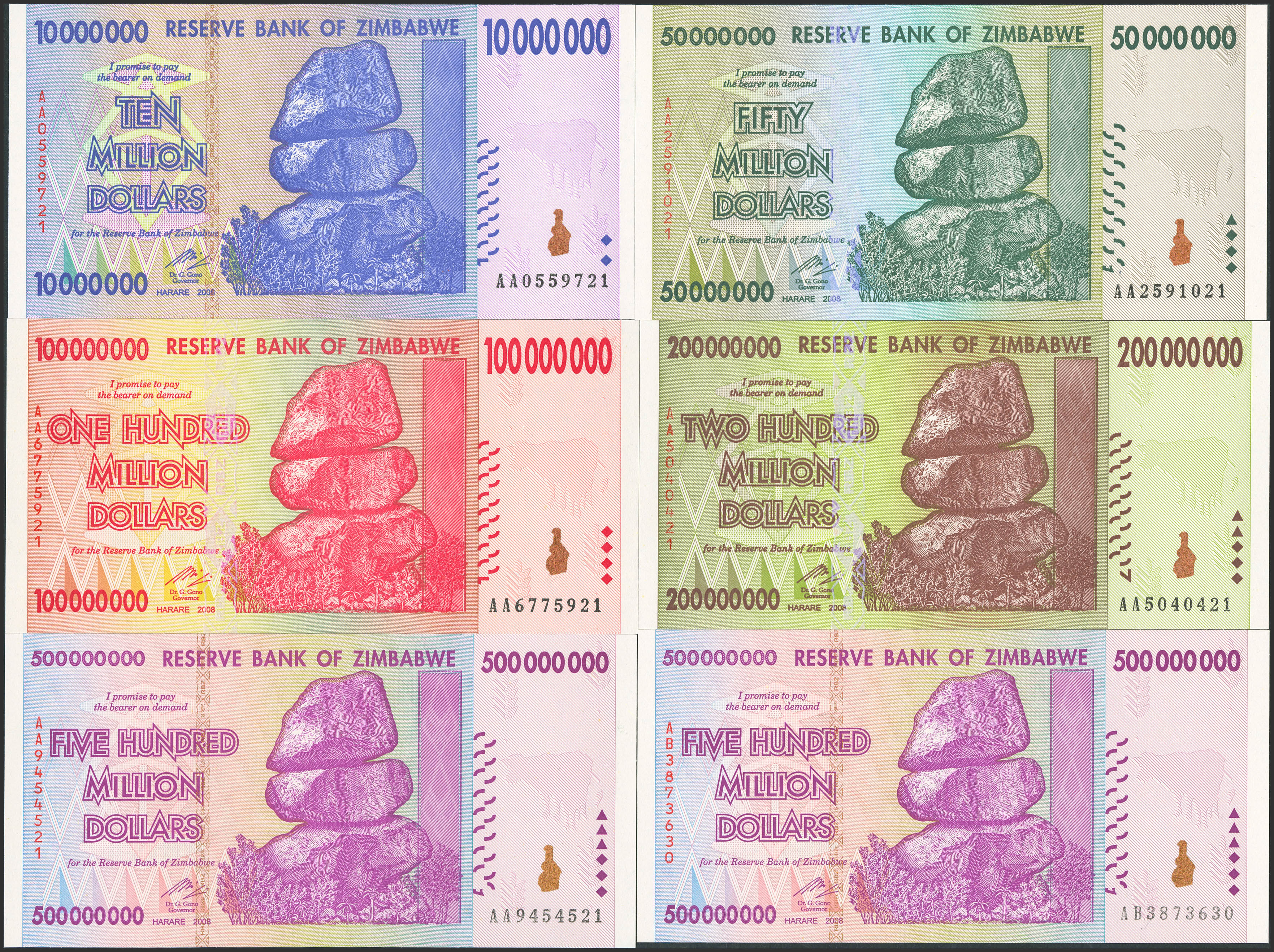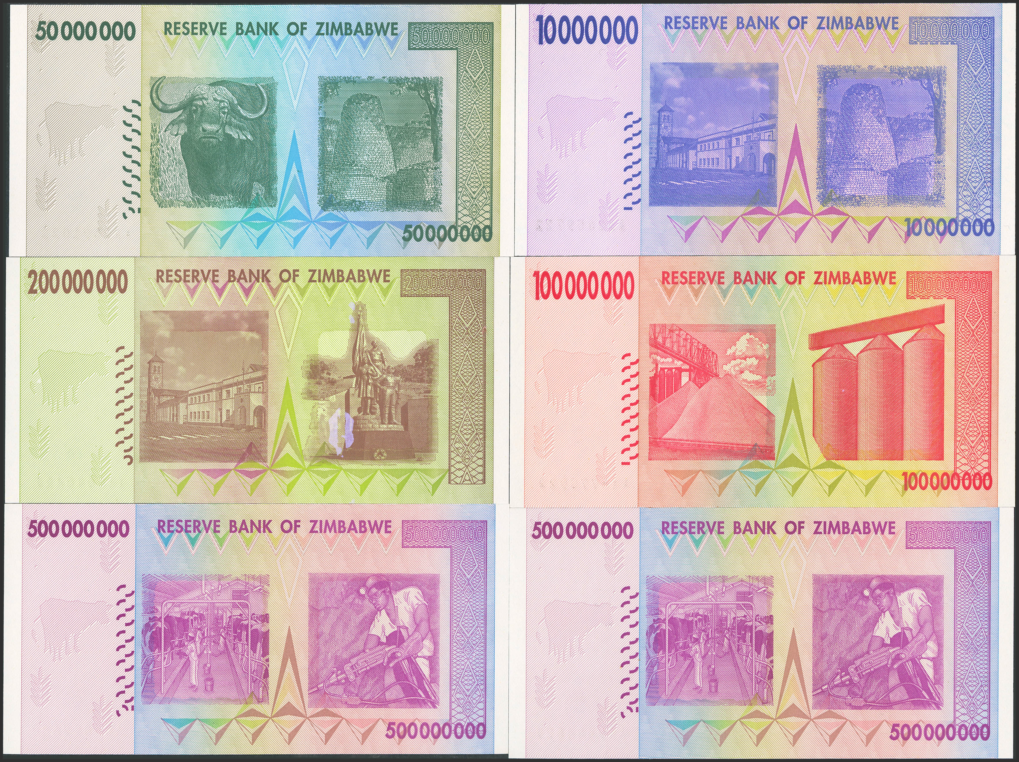 ZIMBABWE. Lot of 6 notes from 10000000 to 500000000 Dollars. 2008. Reserve Bank. (Pick: 78, 79, 80, 81, 82(2)). Uncirculated.