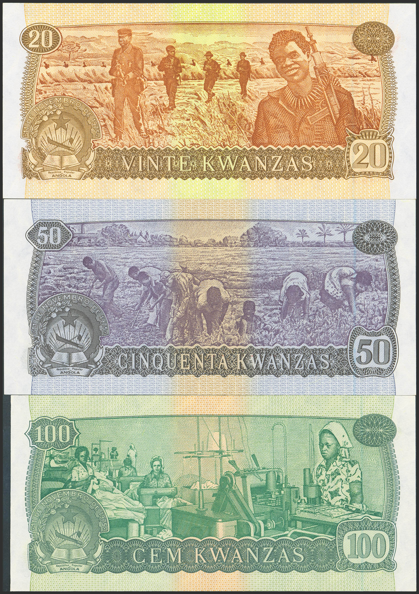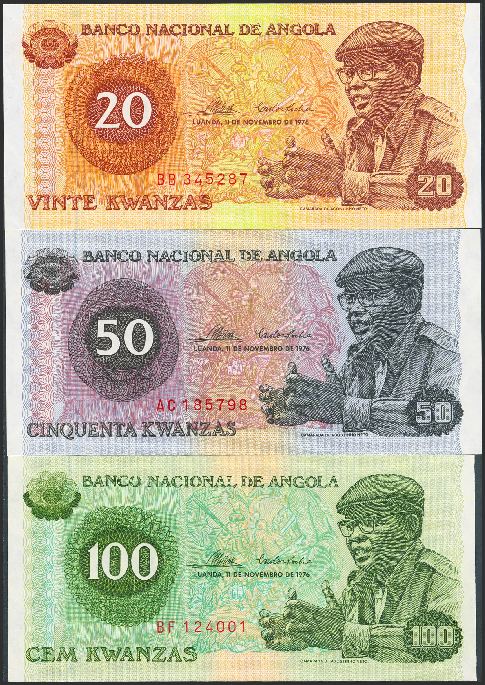 ANGOLA. Lot of 3 notes of 20, 50 and 100 Kwanzas. 11 November 1976. Banco Nacional. (Pick: 109, 110, 111). Less than Uncirculated and Uncirculated (2).