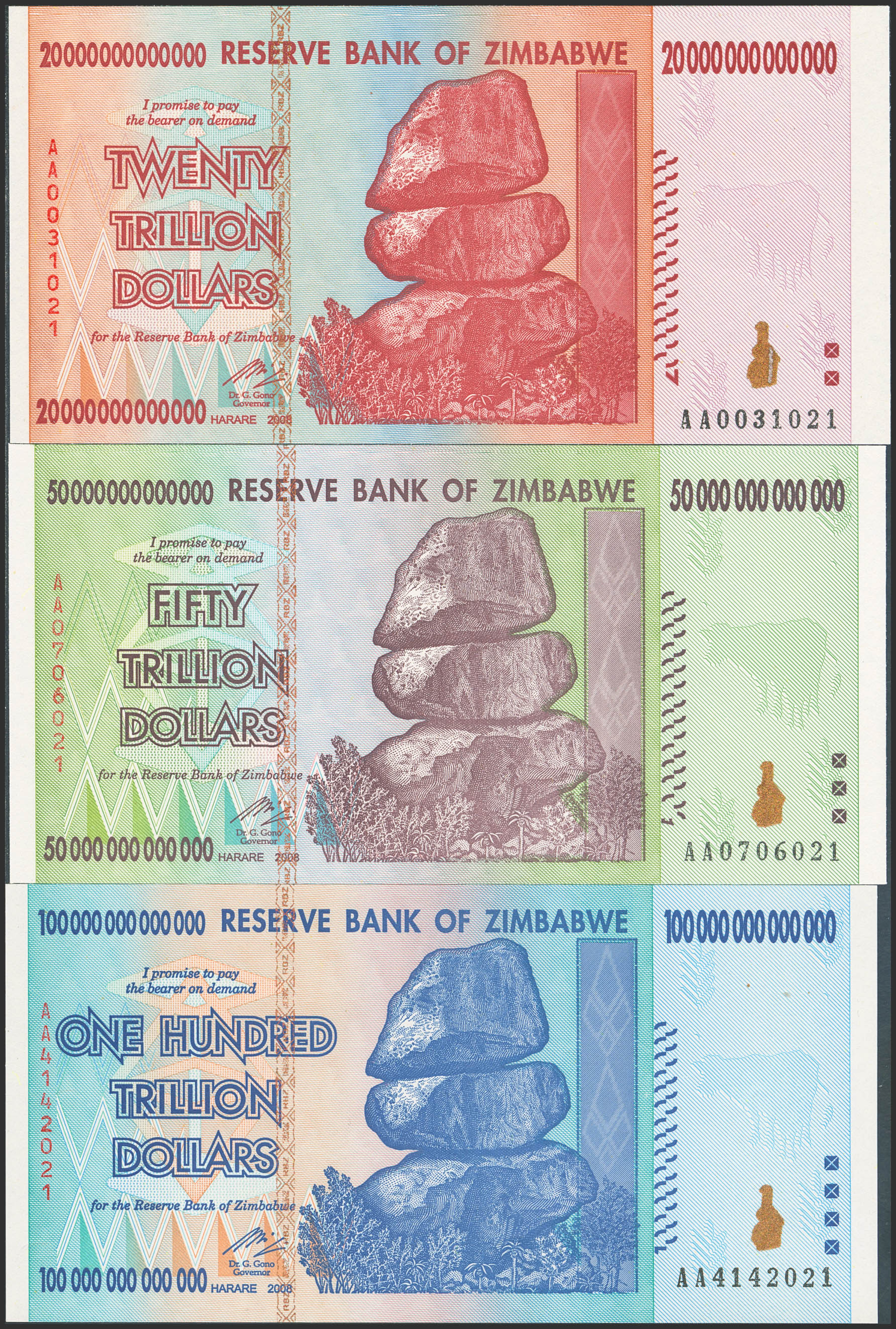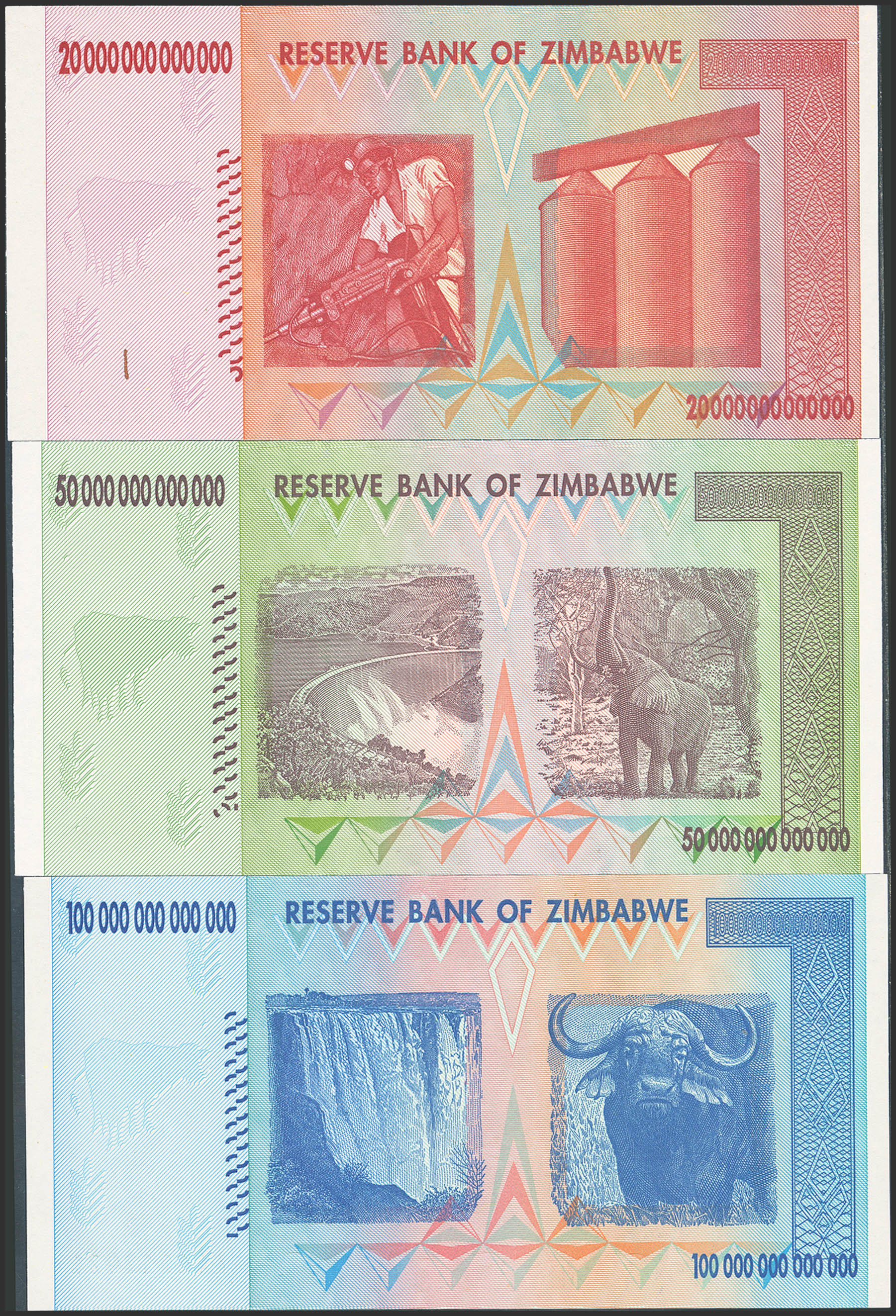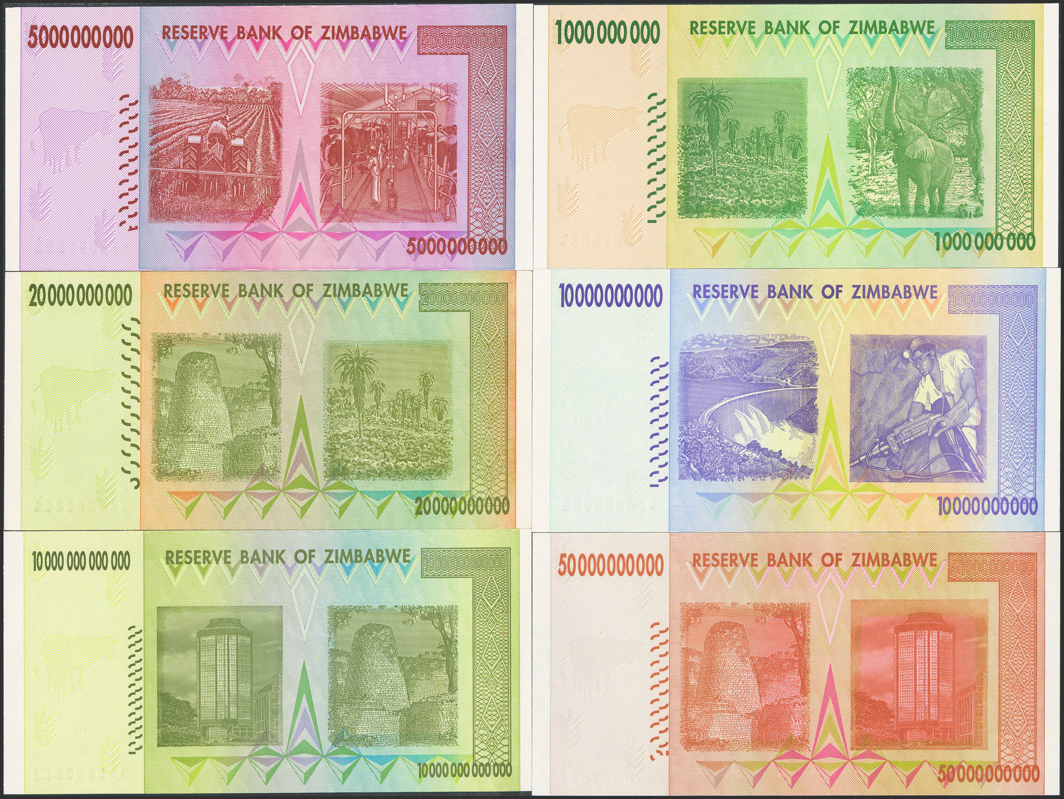 ZIMBABWE. Lot of 9 notes from 1000000000 to 100000000000000 Dollars. 2008. Reserve Bank. (Pick: 83, 84, 85, 86, 87, 88, 89, 90, 91). Uncirculated.