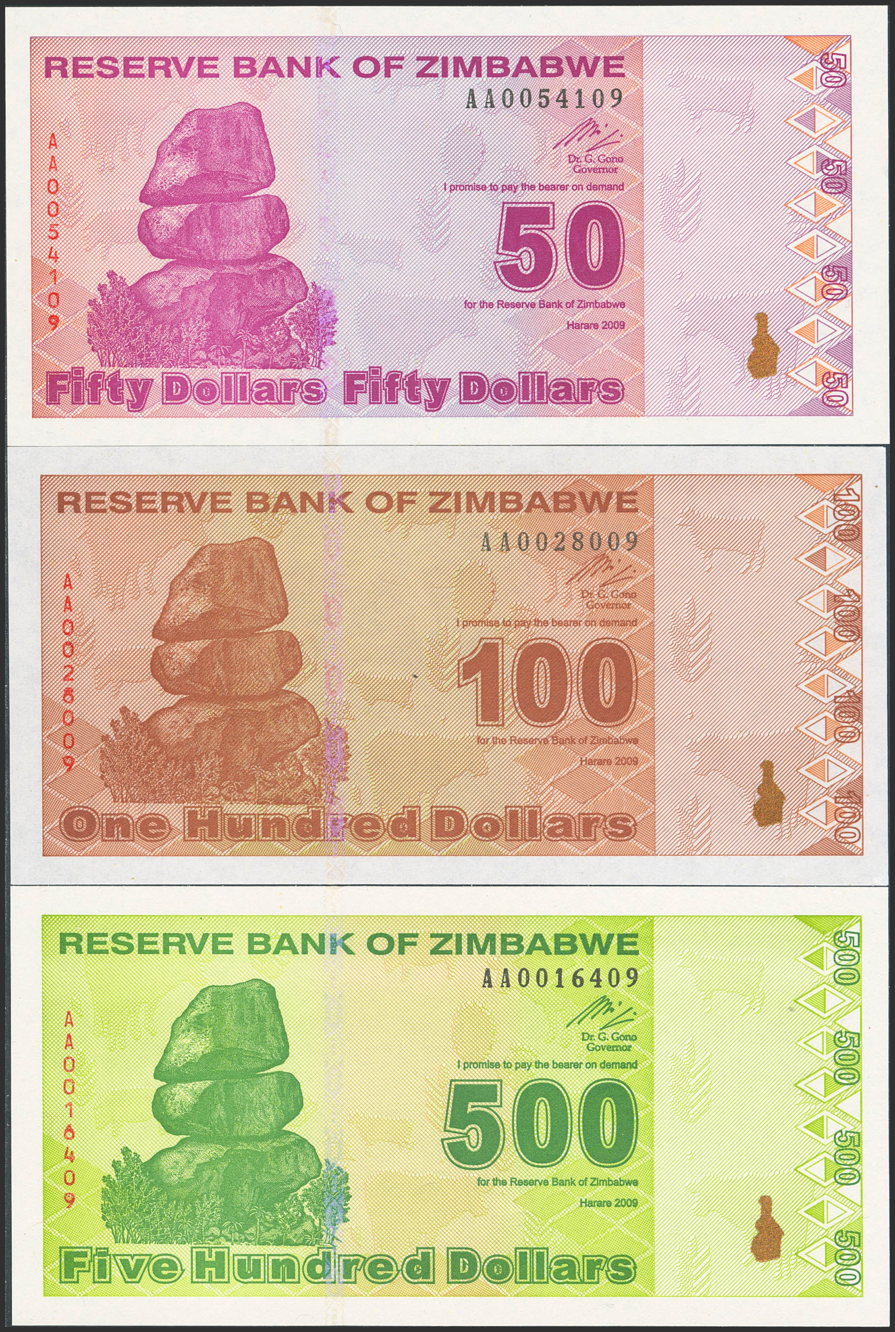 ZIMBABWE. Complete set of 9 notes from 1 to 500 dollars some repeated. 2009. Reserve Bank. (Pick: 92, 93(2), 94, 95(2), 96, 97, 98). Uncirculated.