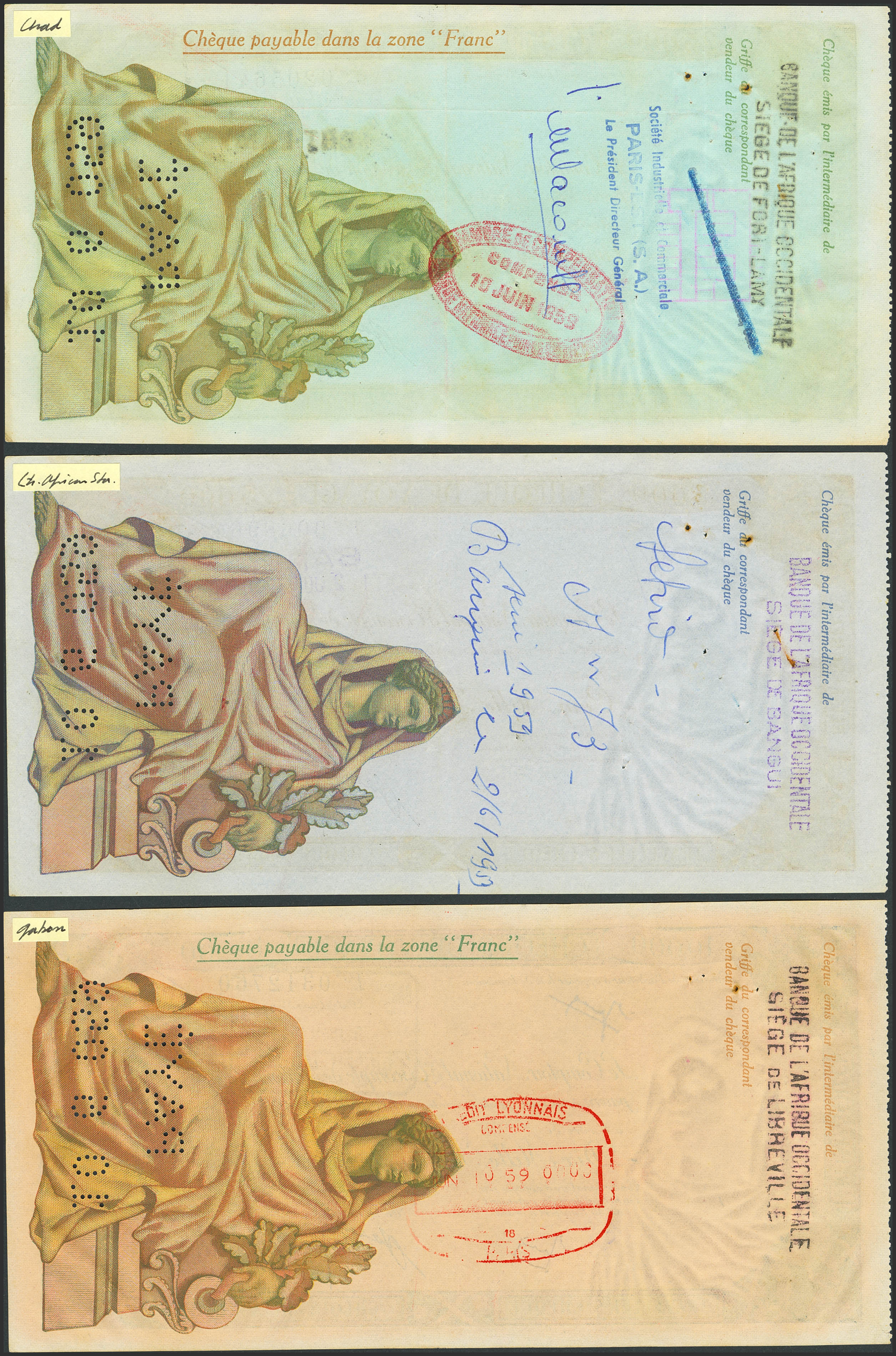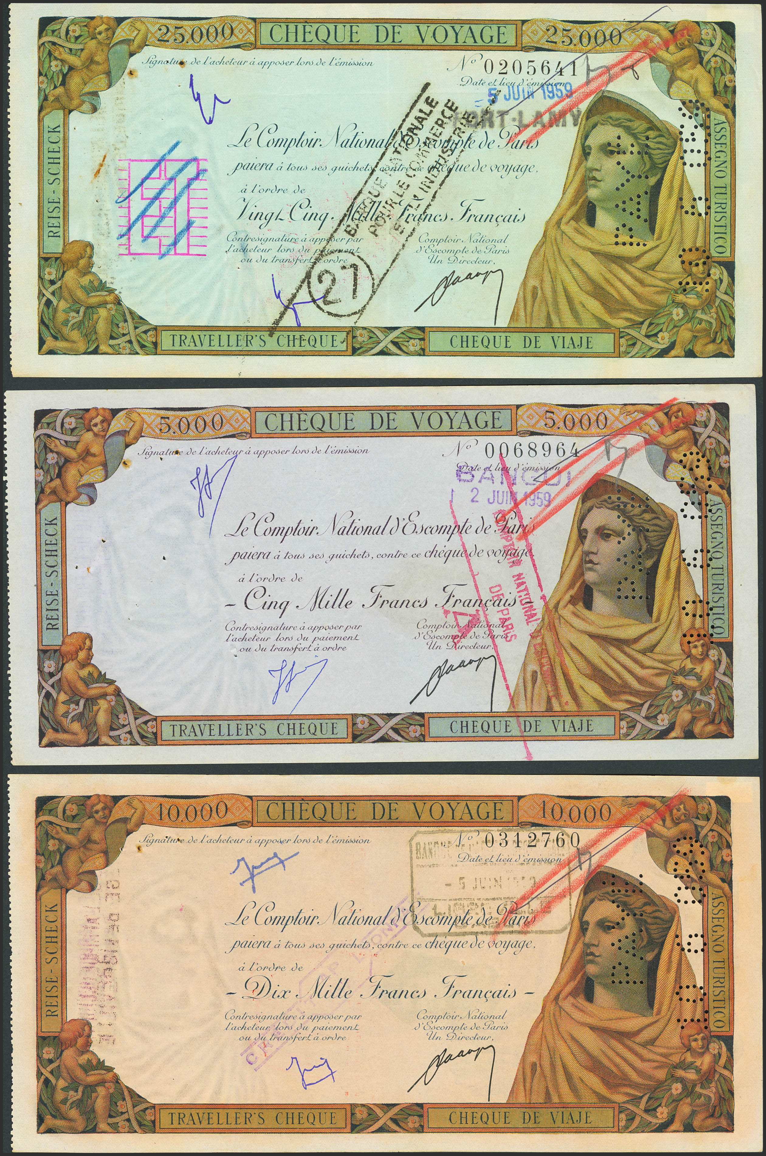 MISCELLANEUS. Lot of 3 Travelle’s Check from 5000 to 25000 Francs. 1959. Le Comptoir National d´Escompte de Paris. Stamped by different branches of Banque de l'Afrique Occidentale. (Pick: Unlisted). Perforated with the payment date. Pinholes. More than Extremely Fine.