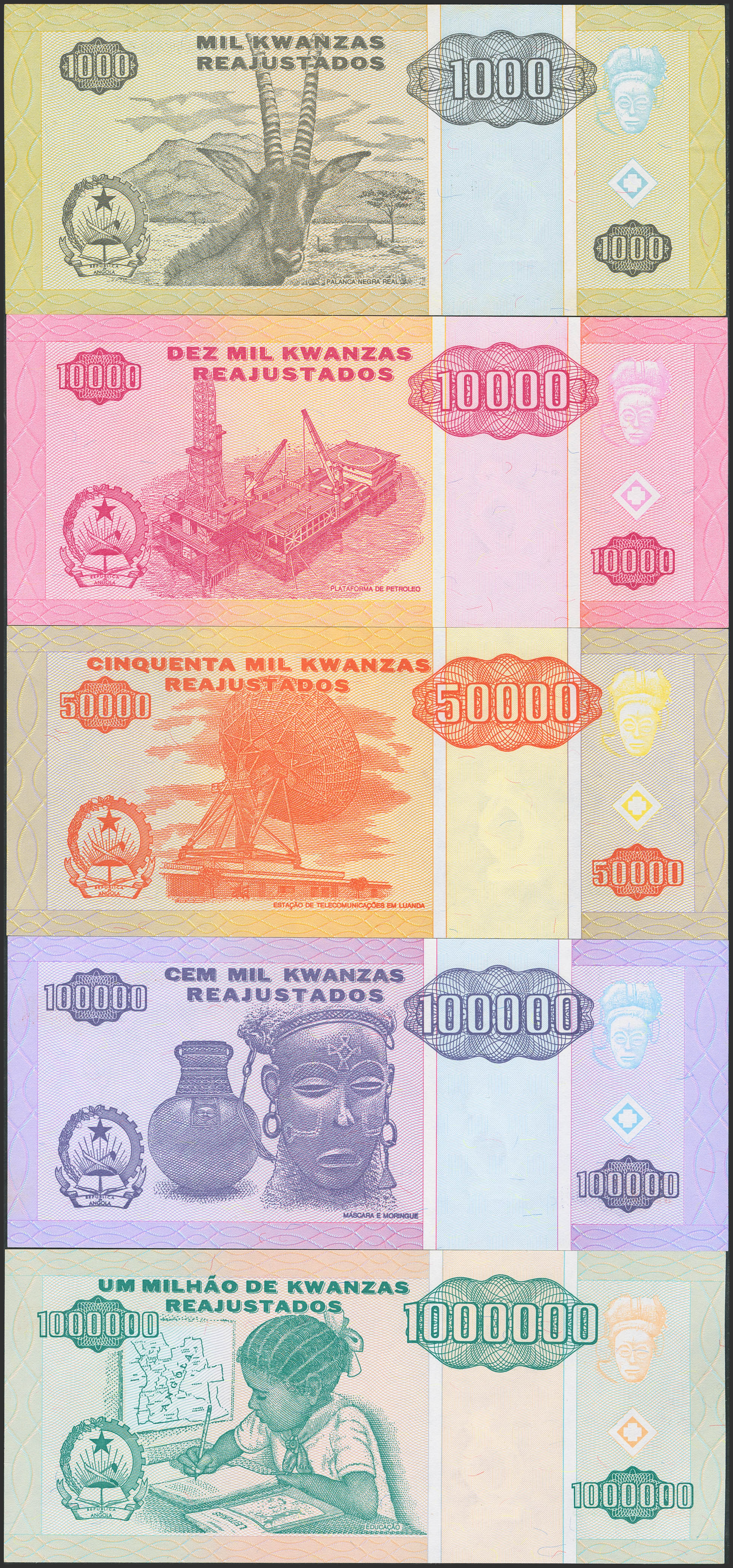 ANGOLA. Lot of 5 notes from 1000 to 1000000 Kwnzas (readjusted). 1995. Banco Nacional. (Pick: 135, 137, 138, 139, 141). Less than Uncirculated (1) and Uncirculated (4).